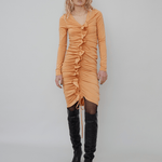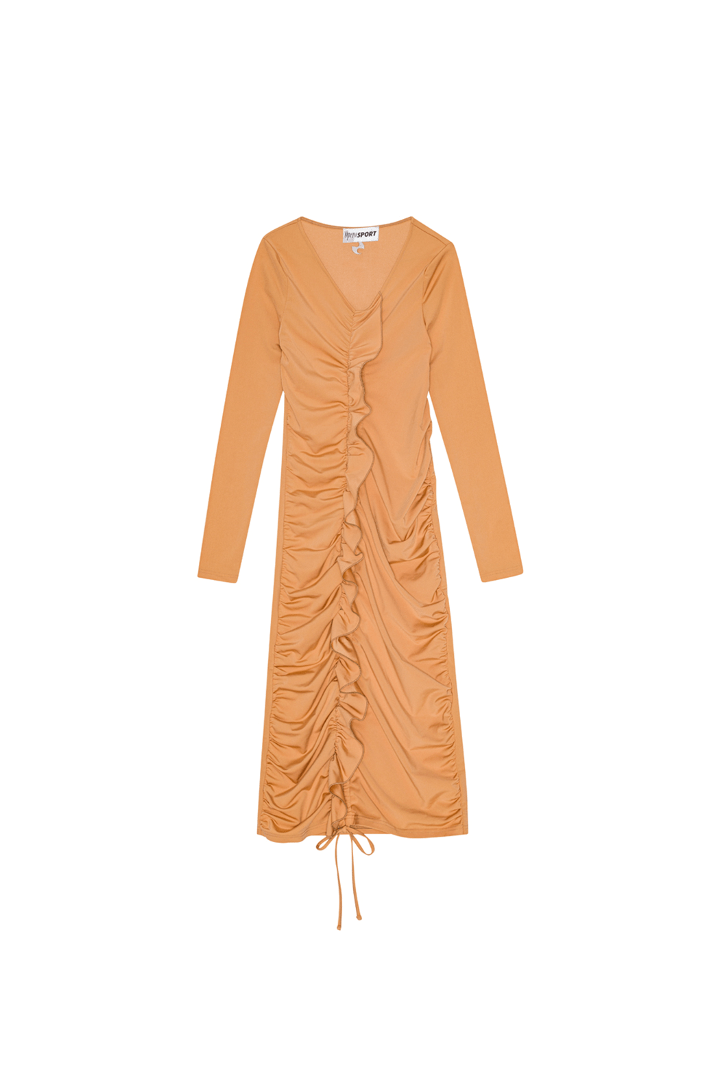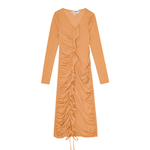 Thérése is crafted from 82% recycled polyester and 18% spandex. The dress is designed with an above-knee length and long sleeves. It features a deep v-neckline that transitions into ruffled details and an adjustable drawstring, providing a customizable fit.