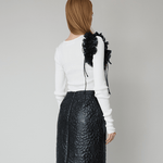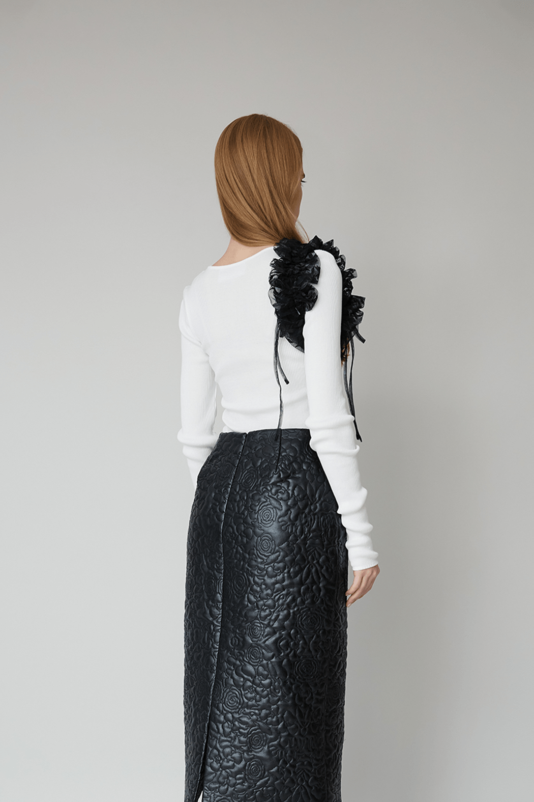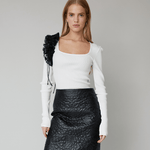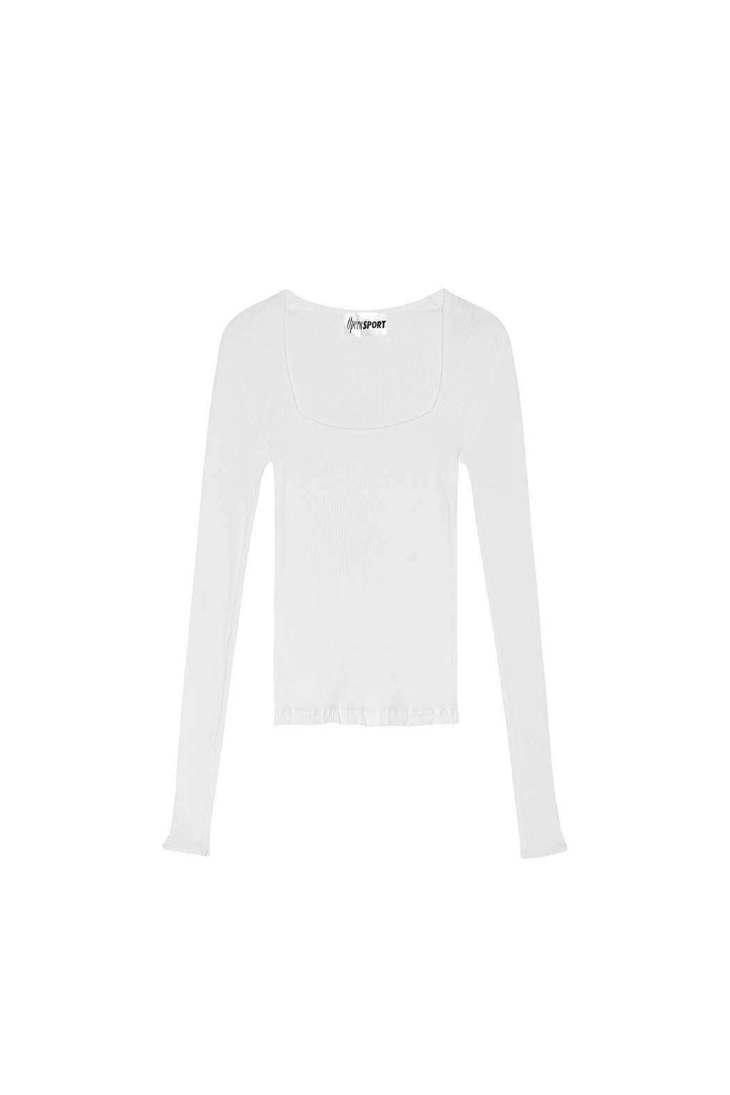 The elegant Rose Top is crafted from crisp seamless fabric in 100% white organic cotton. Rose is all over ribbed and stretchable and has a fitted silhouette with long sleeves and a square neckline.