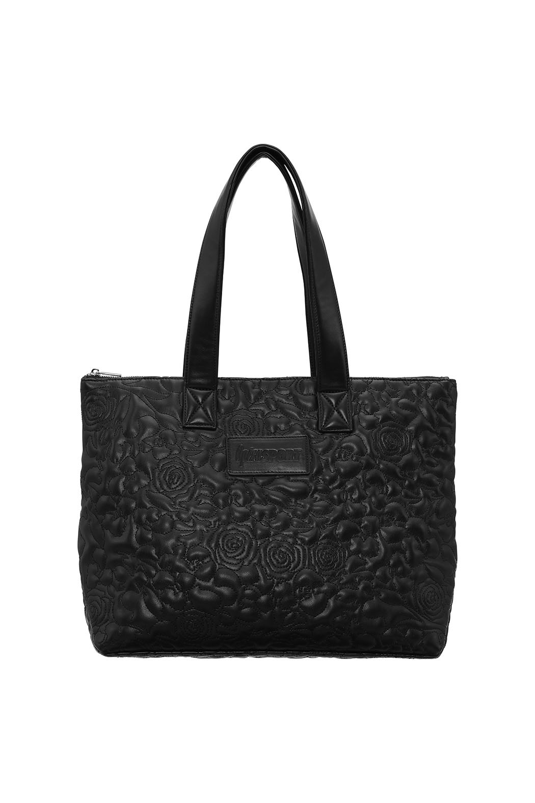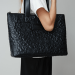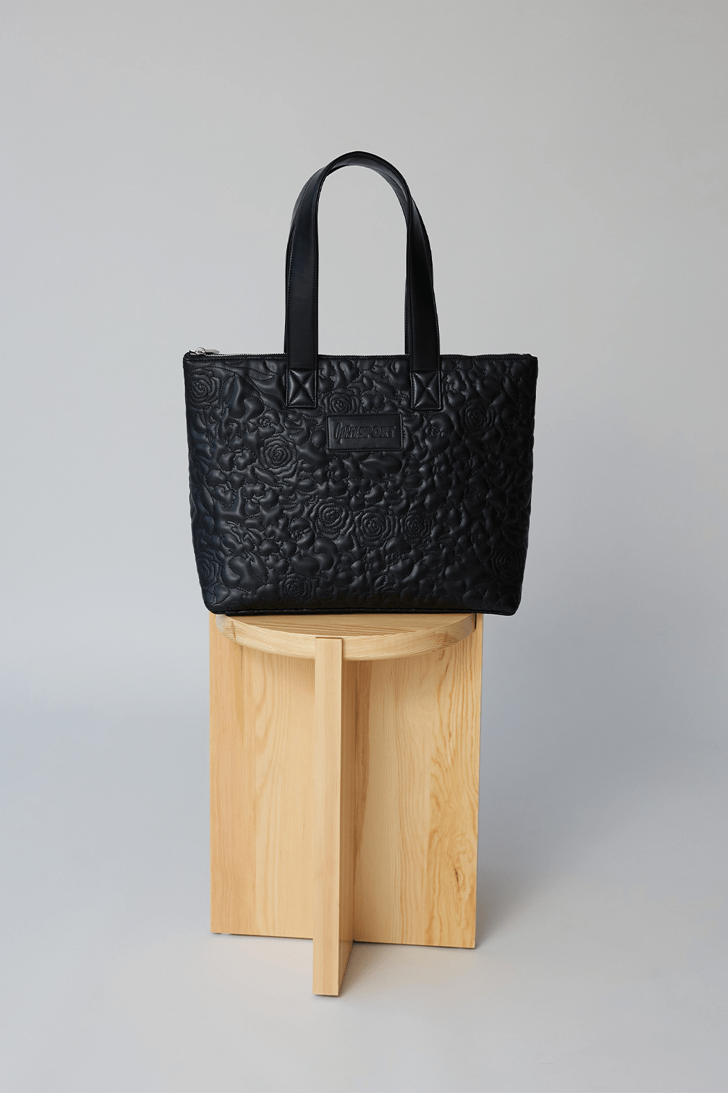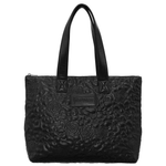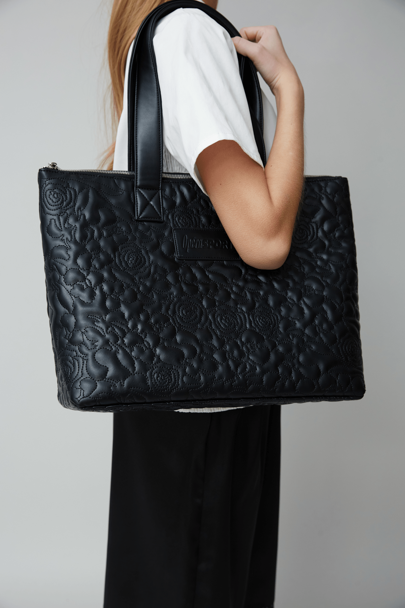 This Sophie bag is made from a sustainable blend of 66% biobased leather and 34% recycled PU. It features an embossed floral pattern throughout, giving it a textured, elegant look. The structured silhouette is complemented by sturdy double handles and a subtle branded patch on the front, making it both functional and stylish for everyday use.