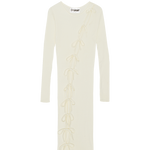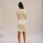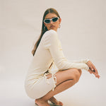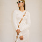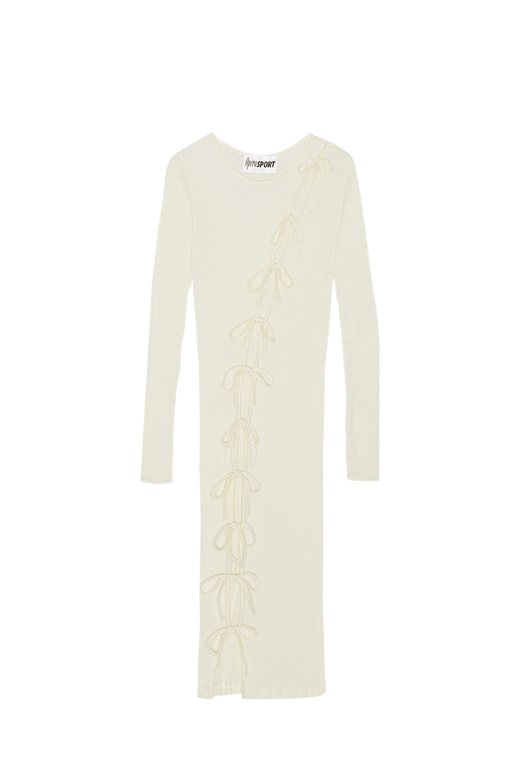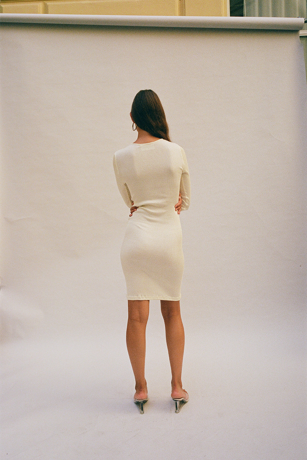 Made from seamless recycled silk, the daring Elizabeth dress closely hugs your figures. The dramatic cut-out design across the body is tied together with feminine bows, revealing a little skin, ideal for a night out. Details include long sleeves, a round neckline, and a ribbed texture. Please note that this garment is made from 100% recycled silk, which is why small knots can appear.