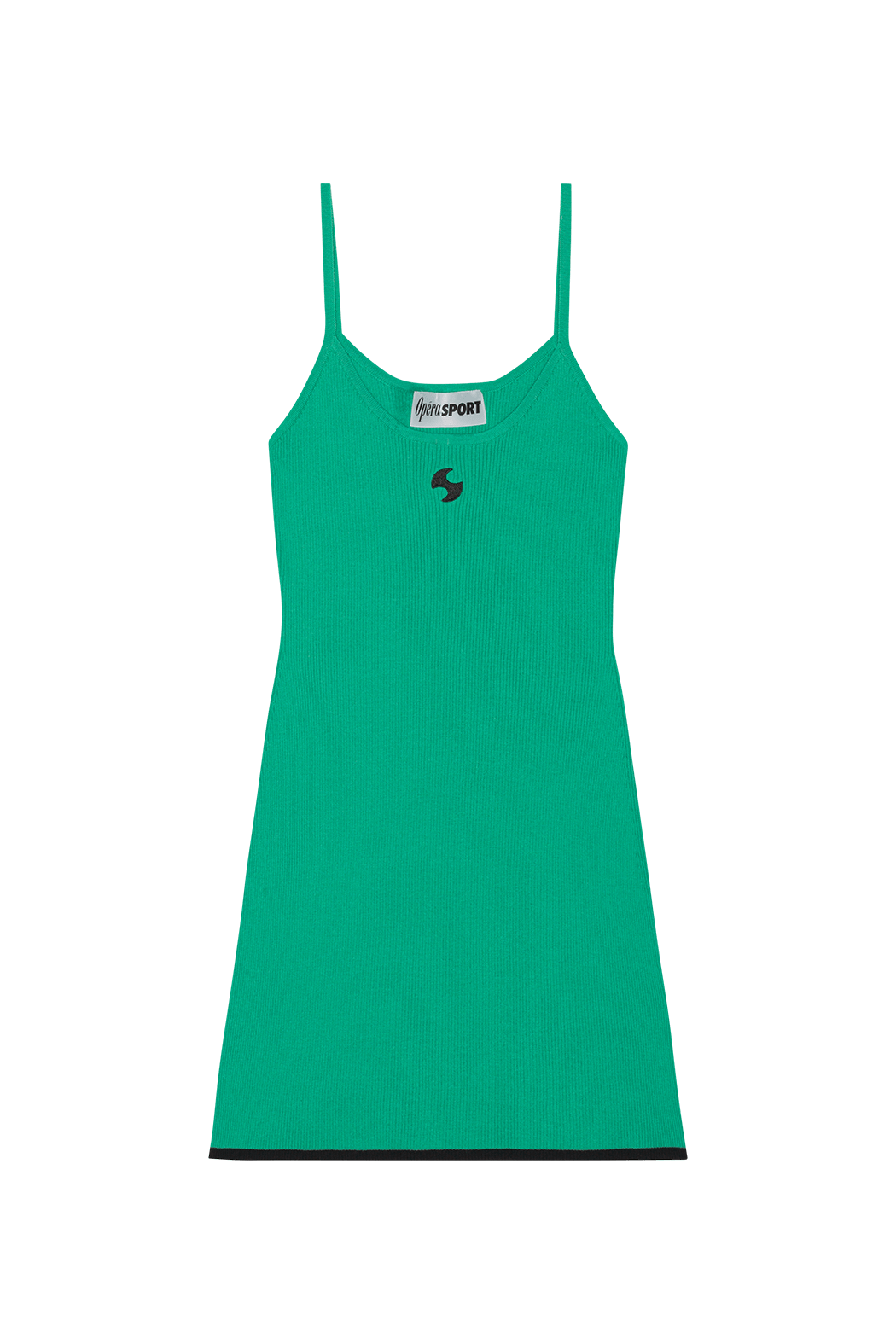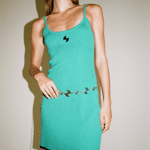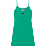The Palmanova dress is crafted from aqua green ribbed fabric in 100% Recycled cotton. The dress has a slim fit with thin spaghetti straps, an embroidered contrast logo and contrast bottom hem. A dress made for all occasions.