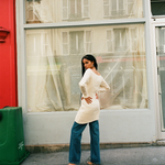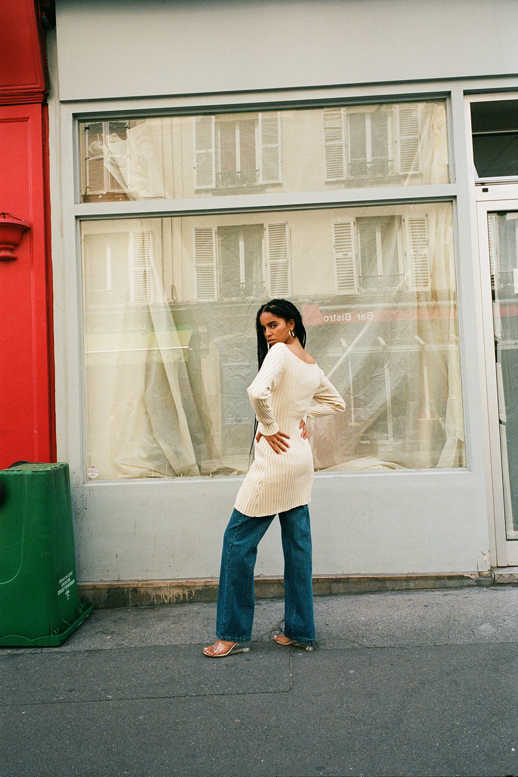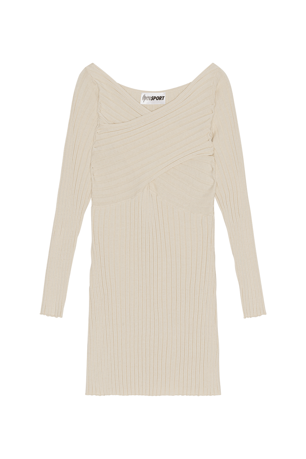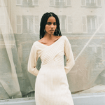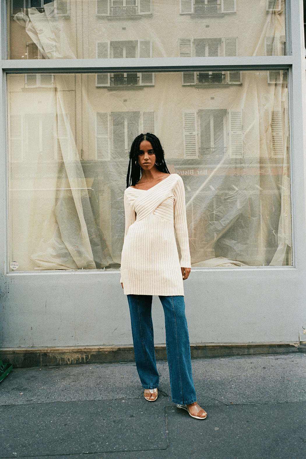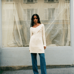 The Viviana dress/top is cut from soft rib-knitted silk and cotton fabric. The dress has a crossover layered design that creates a wide v-neckline revealing the collarbones. It is made for a relaxed fit with long sleeves. The versatile piece is ideal for transitioning months paired with a pair of Denver jeans or on its own.