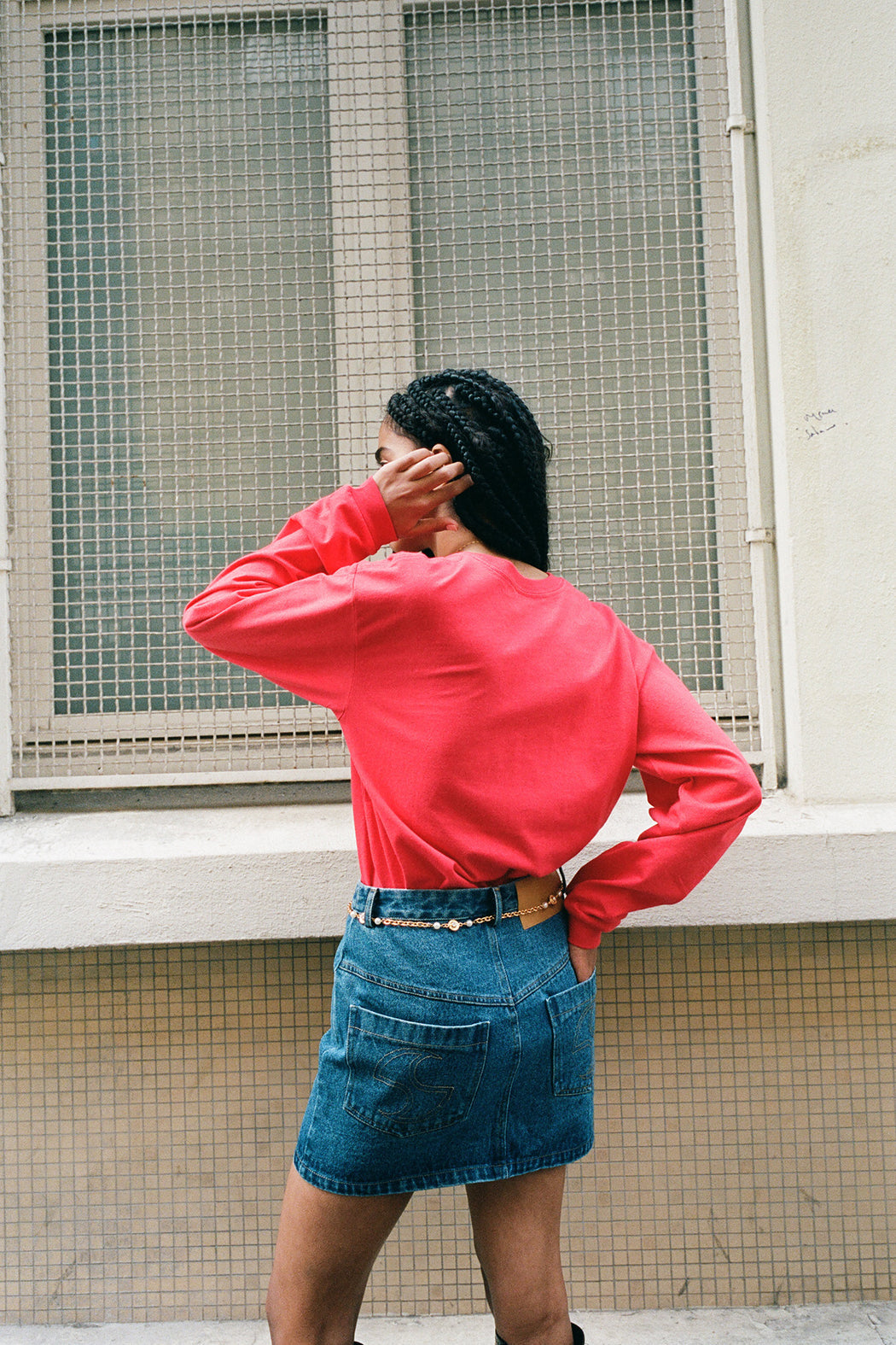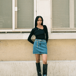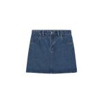 The Maya skirt is crafted from indigo blue denim in 100% organic cotton. The mini skirt is detailed with side pockets and two front pockets embroidered with OpéraSPORT's signature logo. It has a zipper and button closure at the front, belt loops, and visible stitching details. Wear your Maya skirt with the Dakota jacket to complete the look.