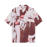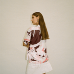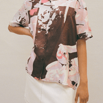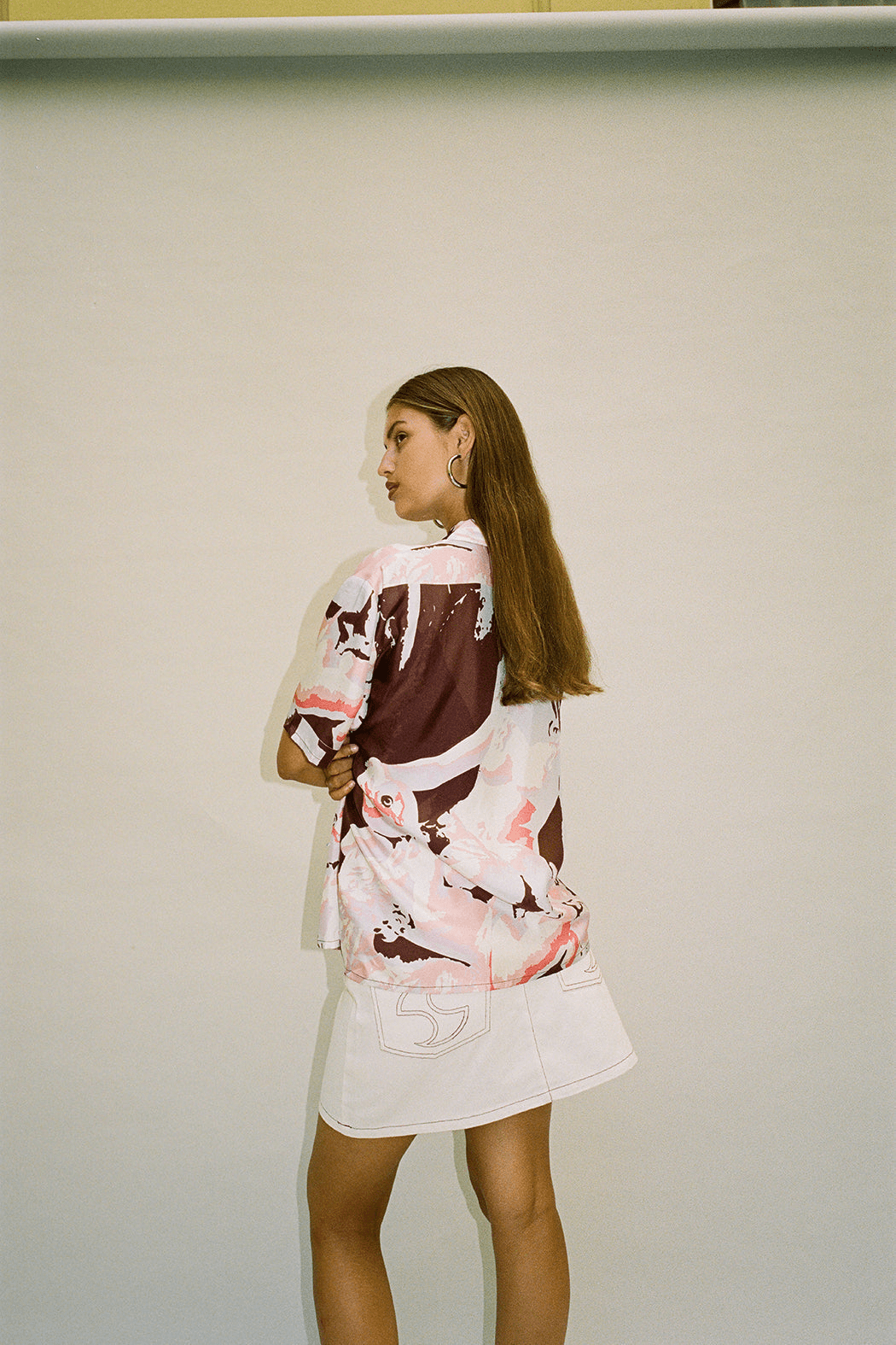 The Tony unisex shirt is made of 100% recycled silk and has a boxy silhouette. The shirt has short sleeves, a wide collar, and a black button closing at the front. The soft-colored print is inspired by the sculptures that adorn Copenhagen and Paris in pink and purple hues.
