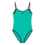 The Luz is a timeless 90s swimsuit. Crafted from a stretchy aqua green fabric in spandex and recycled polyester with black edges. The swimsuit has a slim-fitted design with slender straps, a square neckline and a low back.