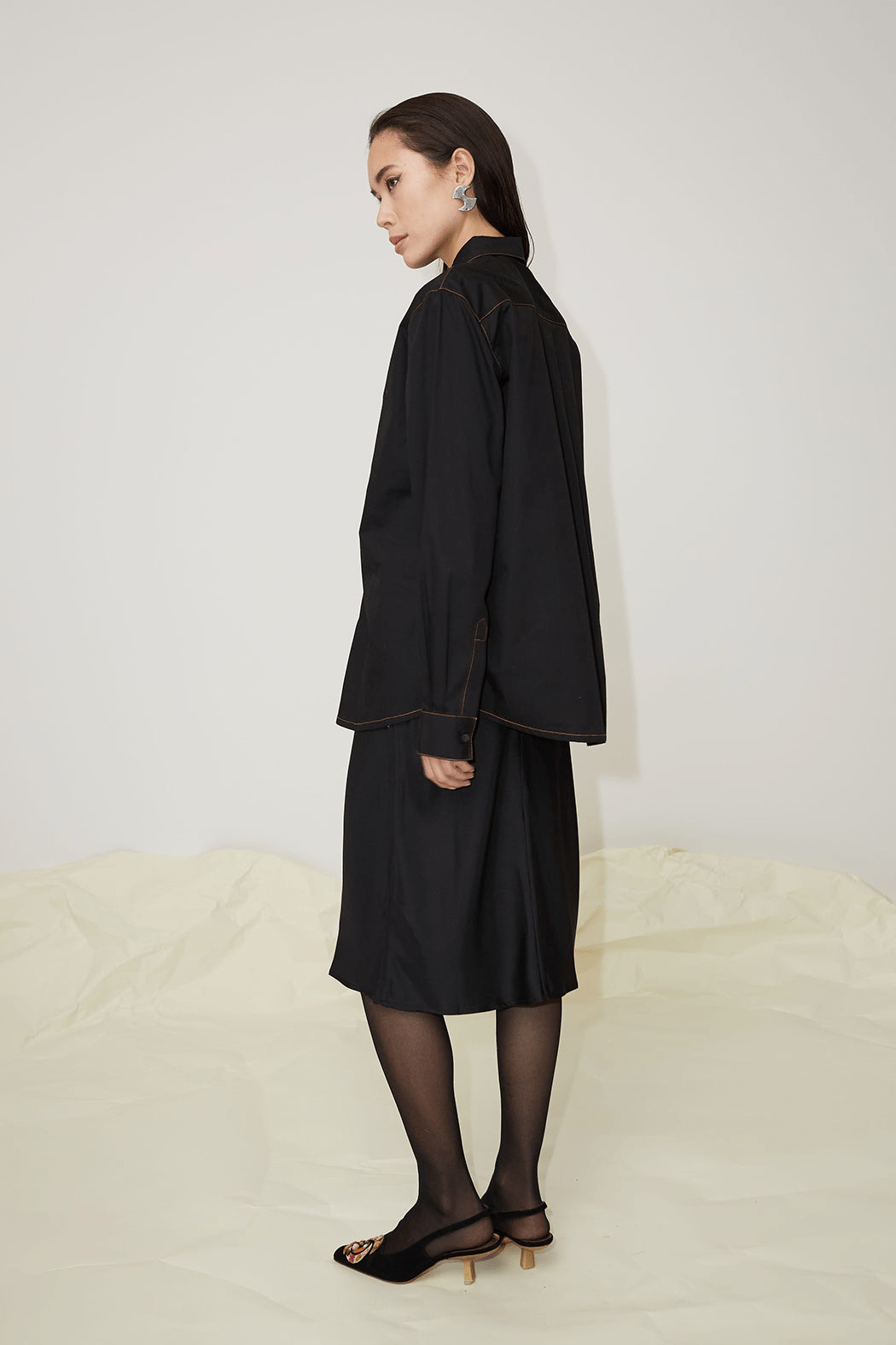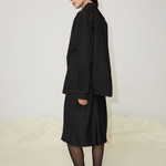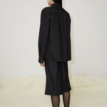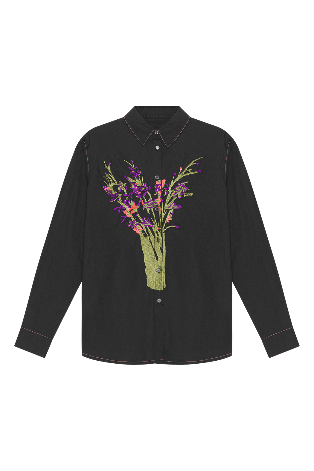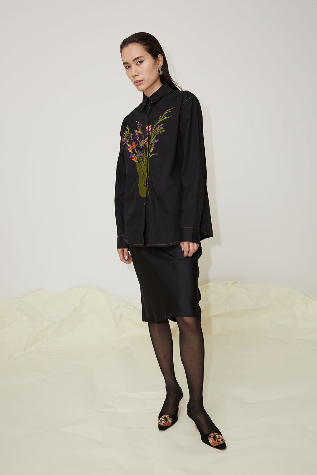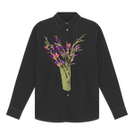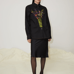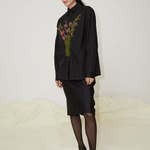 The Cleo unisex shirt is made from 100% organic cotton. Cut from crisp black cotton poplin to an oversized frame with a sharp point collar. Featuring dropped shoulders and a straight ham, this shirt is embroidered with multicoloured thread depicting the print by the artist Tom Anholt.