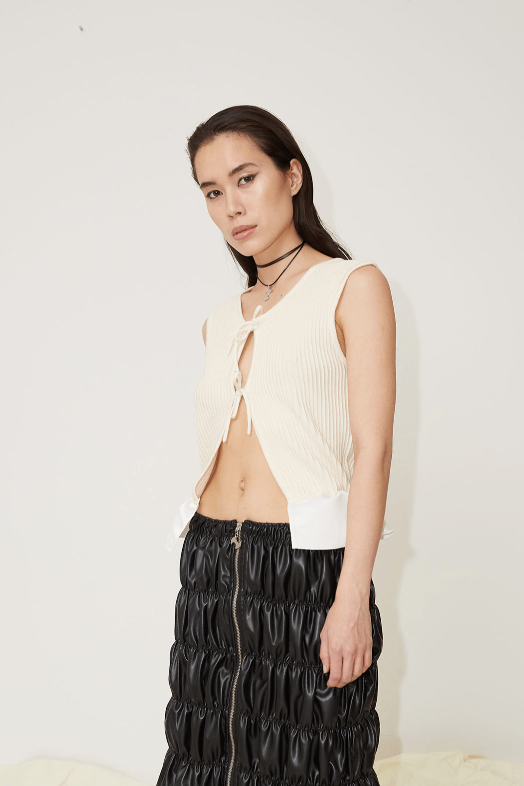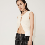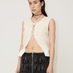 The Flora vest is crafted from compact ribbed knit material in 75% recycled wool and 25% recycled silk. The vest features a rounded neckline and is cut to a slim silhouette. Shaped with an open front and slender ties, the ties that can either be left undone or knotted into a bow for a whimsical finish.