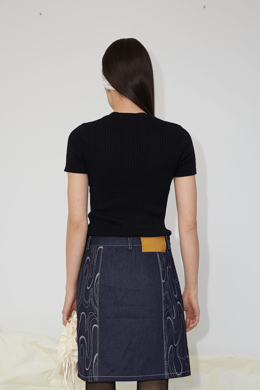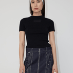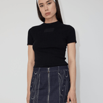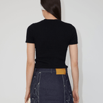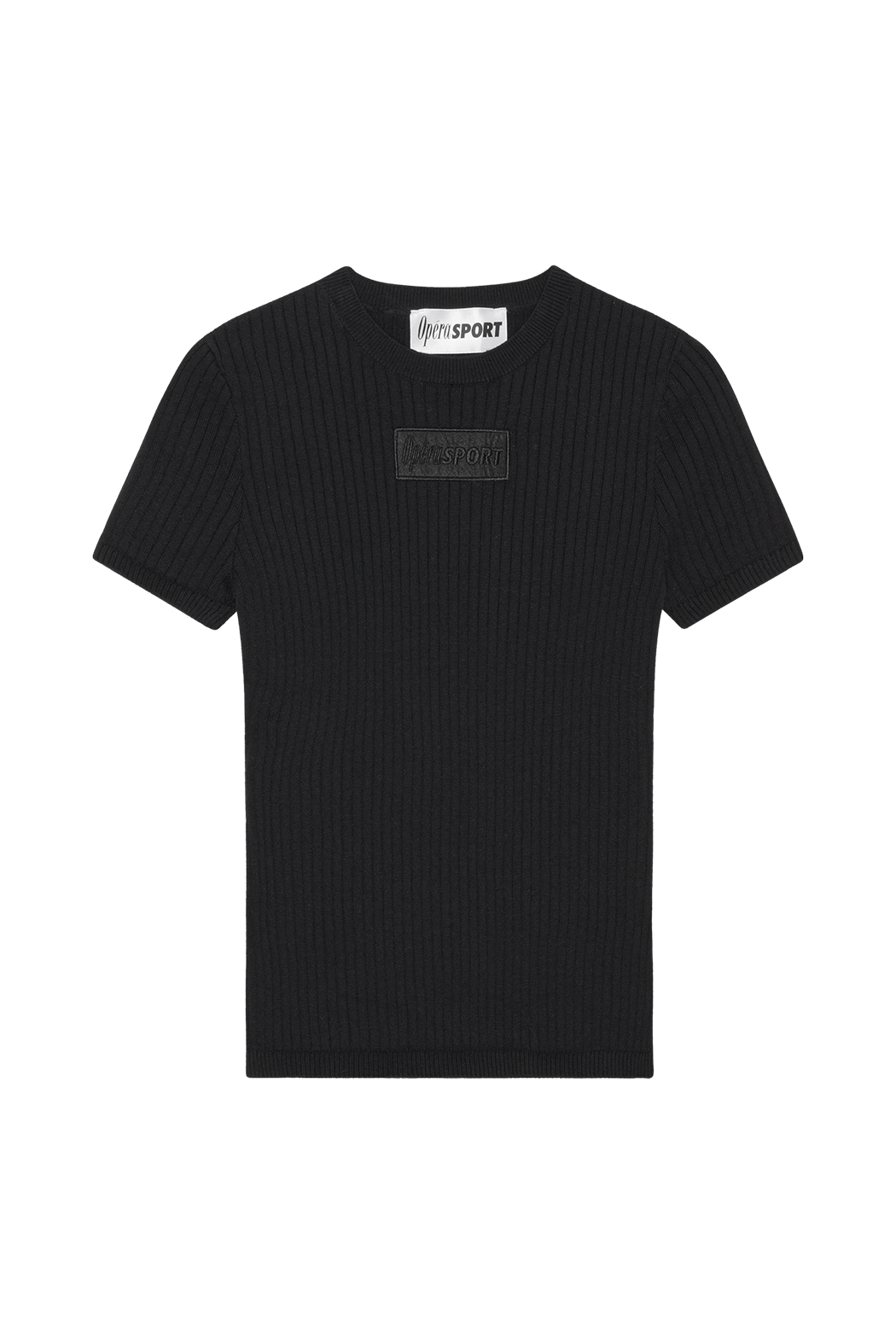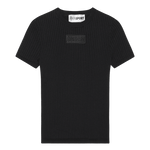 The Jules t-shirt is crafted from 100% organic cotton in a soft black color. It has a slim-fitted silhouette with short sleeves, a round neckline, and an embroidered logo on the front.
