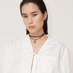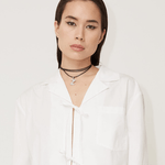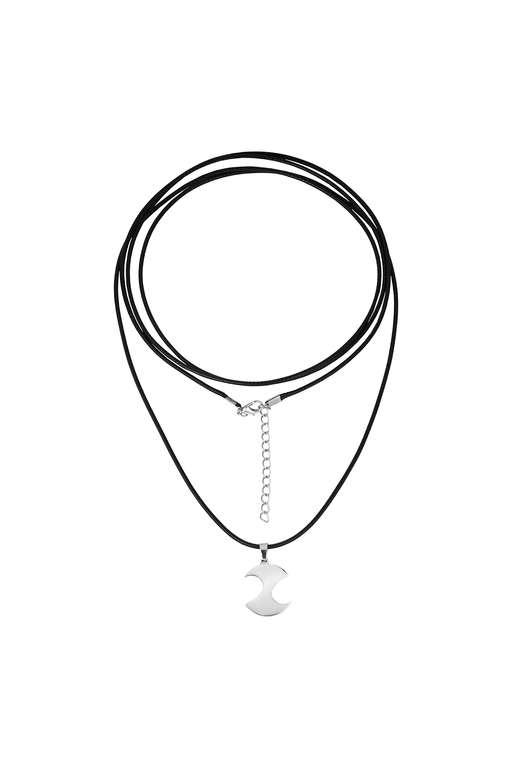 The Lorraine necklace is crafted from black recycled PU threaded through a silver-color metal pendant in the shape of OpéraSPORT's logo. Pair this black necklace with the Eve seamless top or the Tavon shirt for the ultimate 90s look.