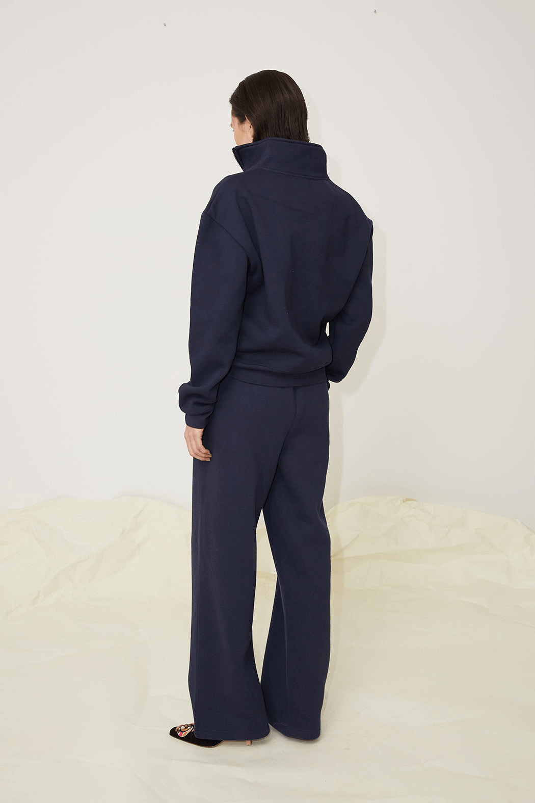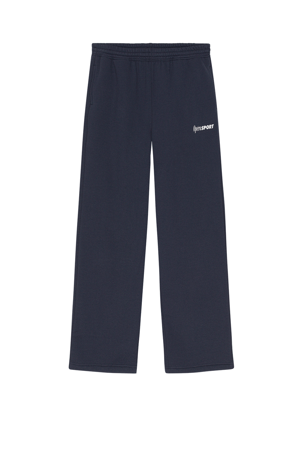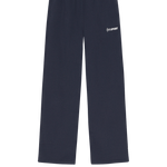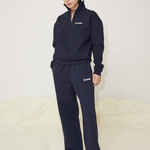 The Rayan sweatpants are crafted from a soft blend of navy blue recycled polyester and organic cotton. It has a loose fit with side pockets, an elasticated waist, and long legs with an embroidered logo on the left leg.