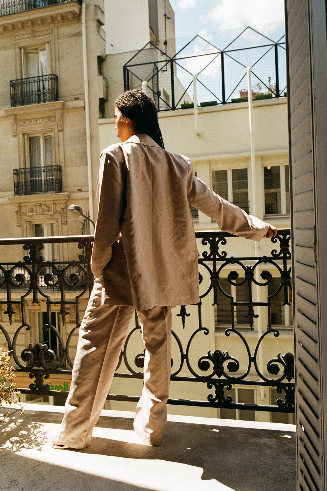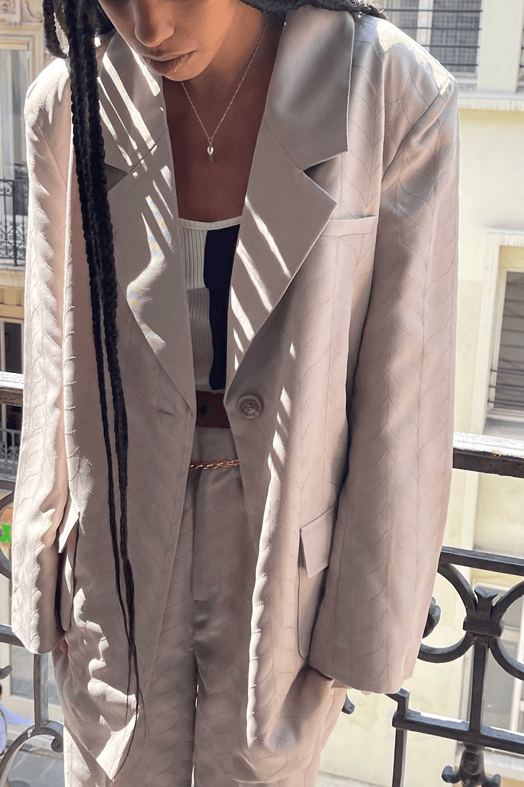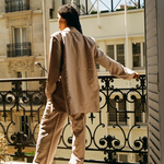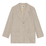 The Cameron blazer is made of taupe 100% recycled polyester. The blazer has a boxy and oversized fit with internal shoulder pads that emphasizes a mens-inspired silhouette. The fabric features organically shaped stitching details. The blazer can be worn with the Carter pants to create an elegant everyday suit.