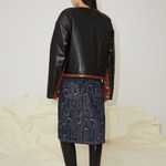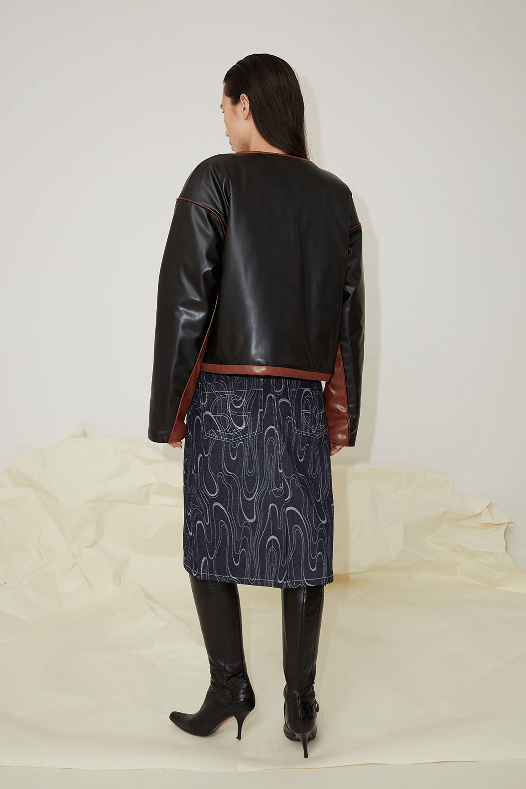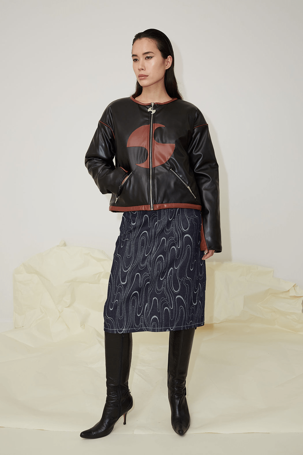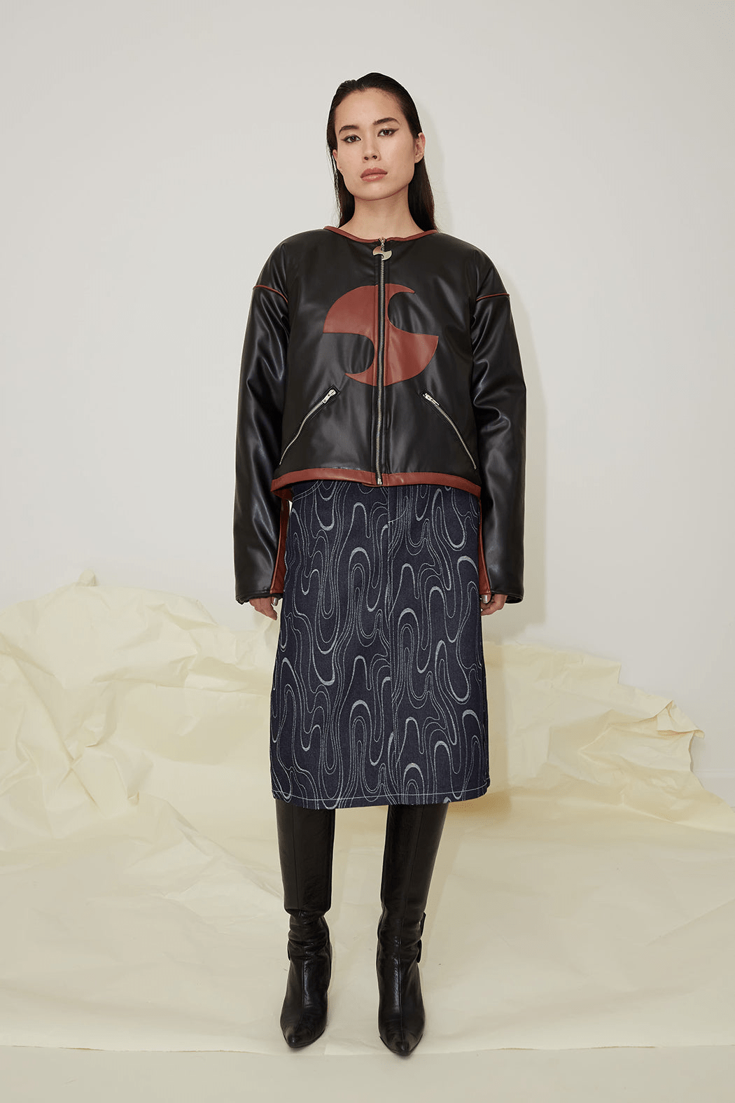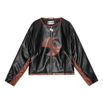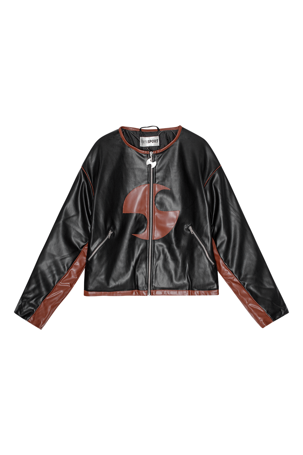 The Damian leather jacket is a modern leather jacket distinguished by a cropped design around the waistline and long sleeves. Crafted from 100% recycled PU leather following a relaxed silhouette with a silver zipper in the shape of the OpéraSPORT logo at the front. The jacket features a rounded collar, a two way zip, brown contrast rounded hem and has a brown OpéraSPORT logo printed at the front.