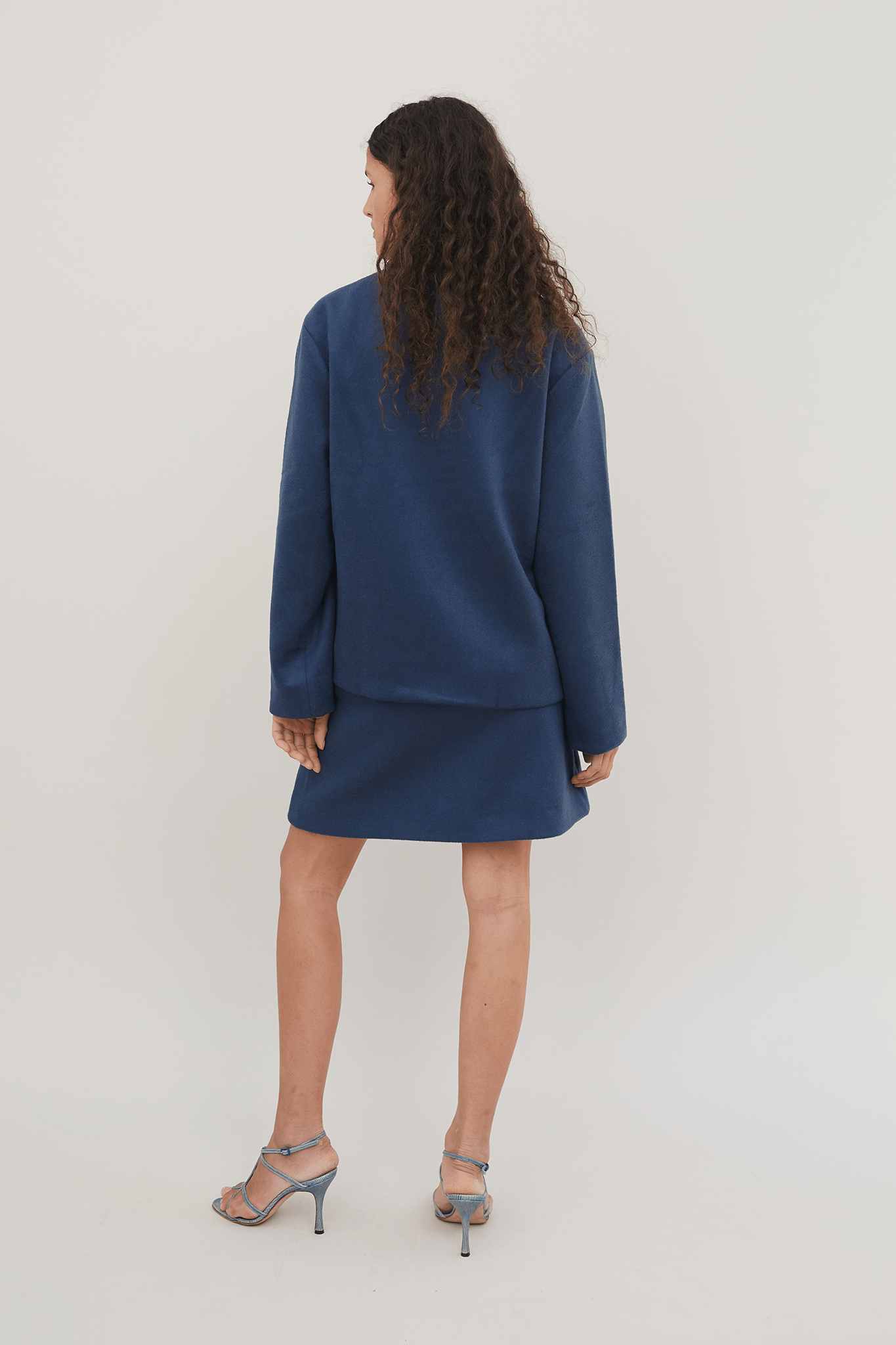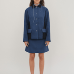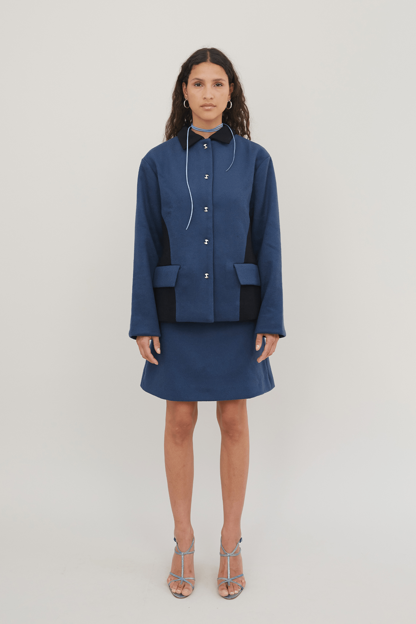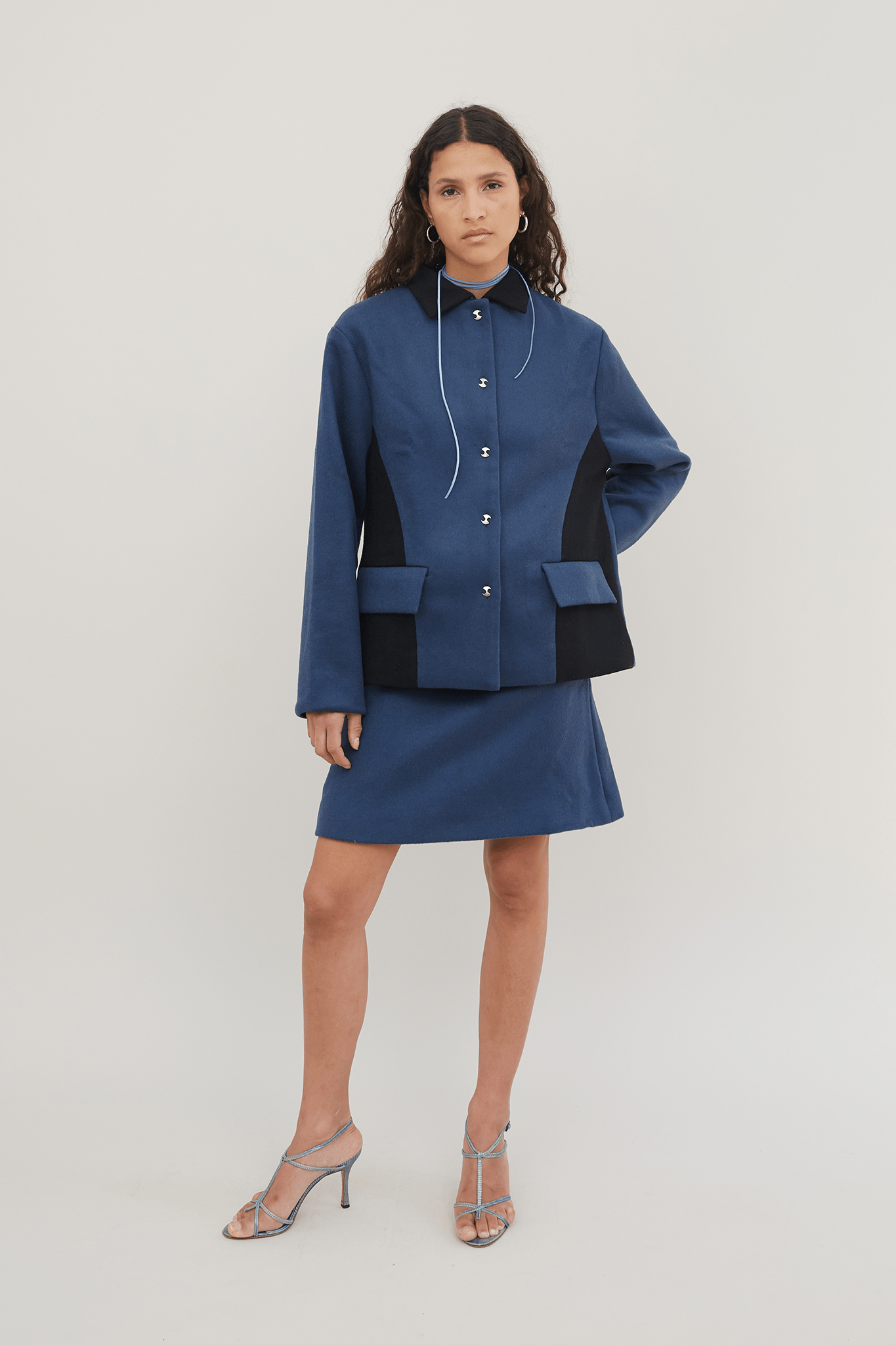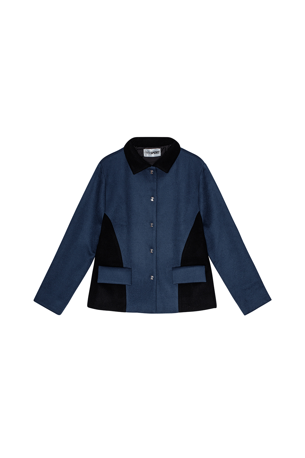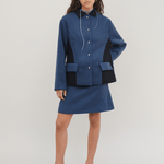 Introducing Irina Coat - the newest member of the OpéraSPORT family. The coat has a classic design with a short a-shaped silhouette, long sleeves, a pointy collar, and flap pockets on the sites. Irina features contrast detailing on the body and collar. The coat is elegantly finished with silver hardware in our logo design.