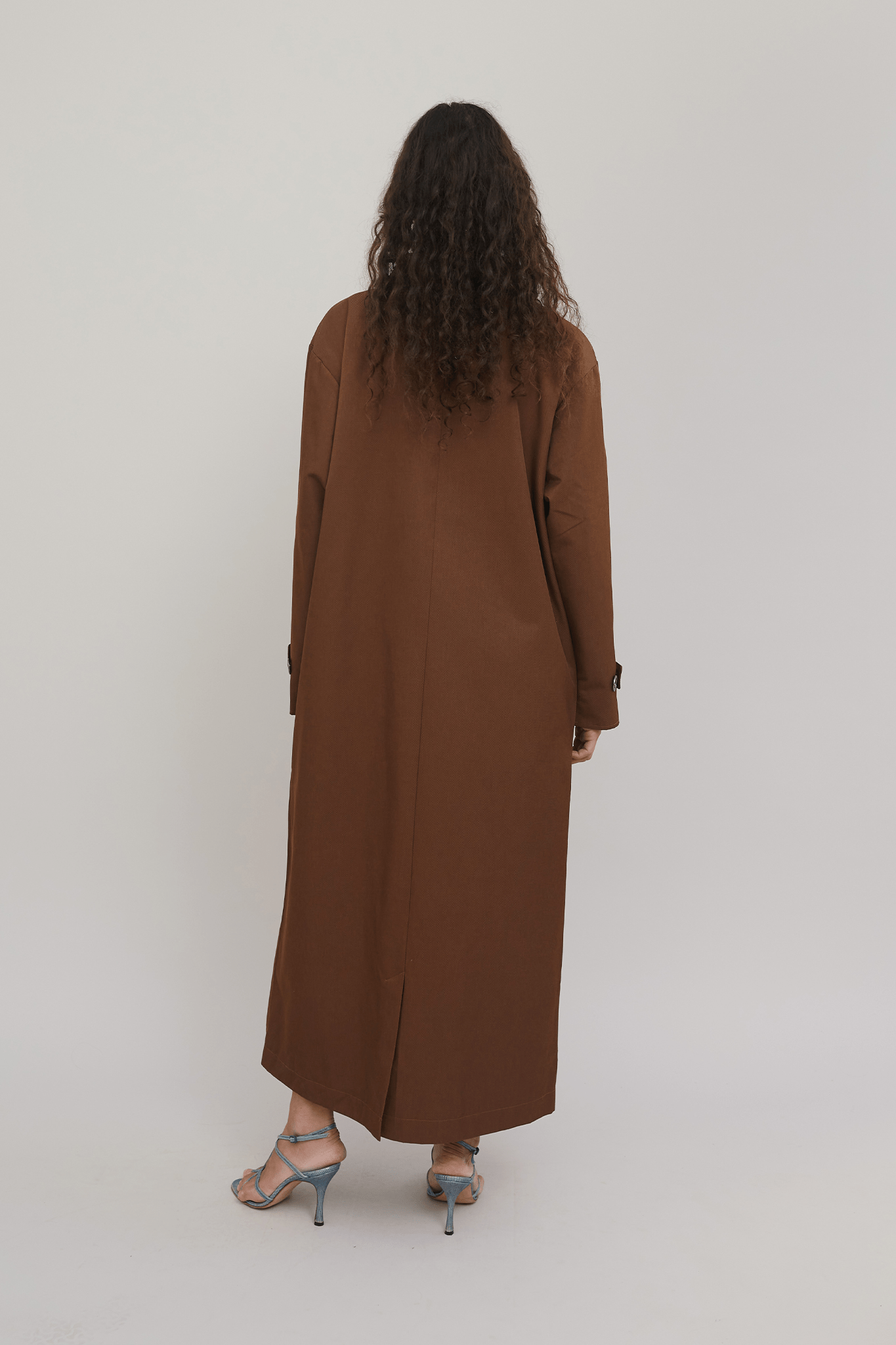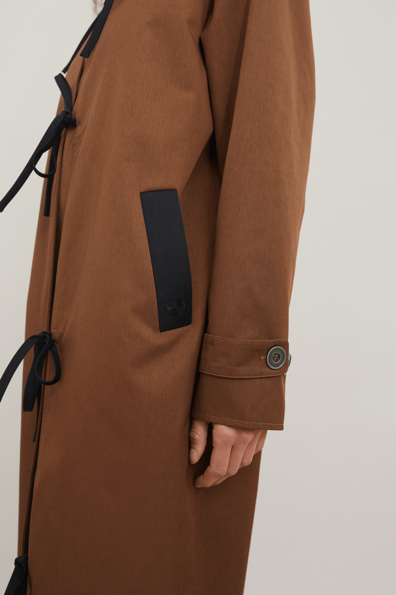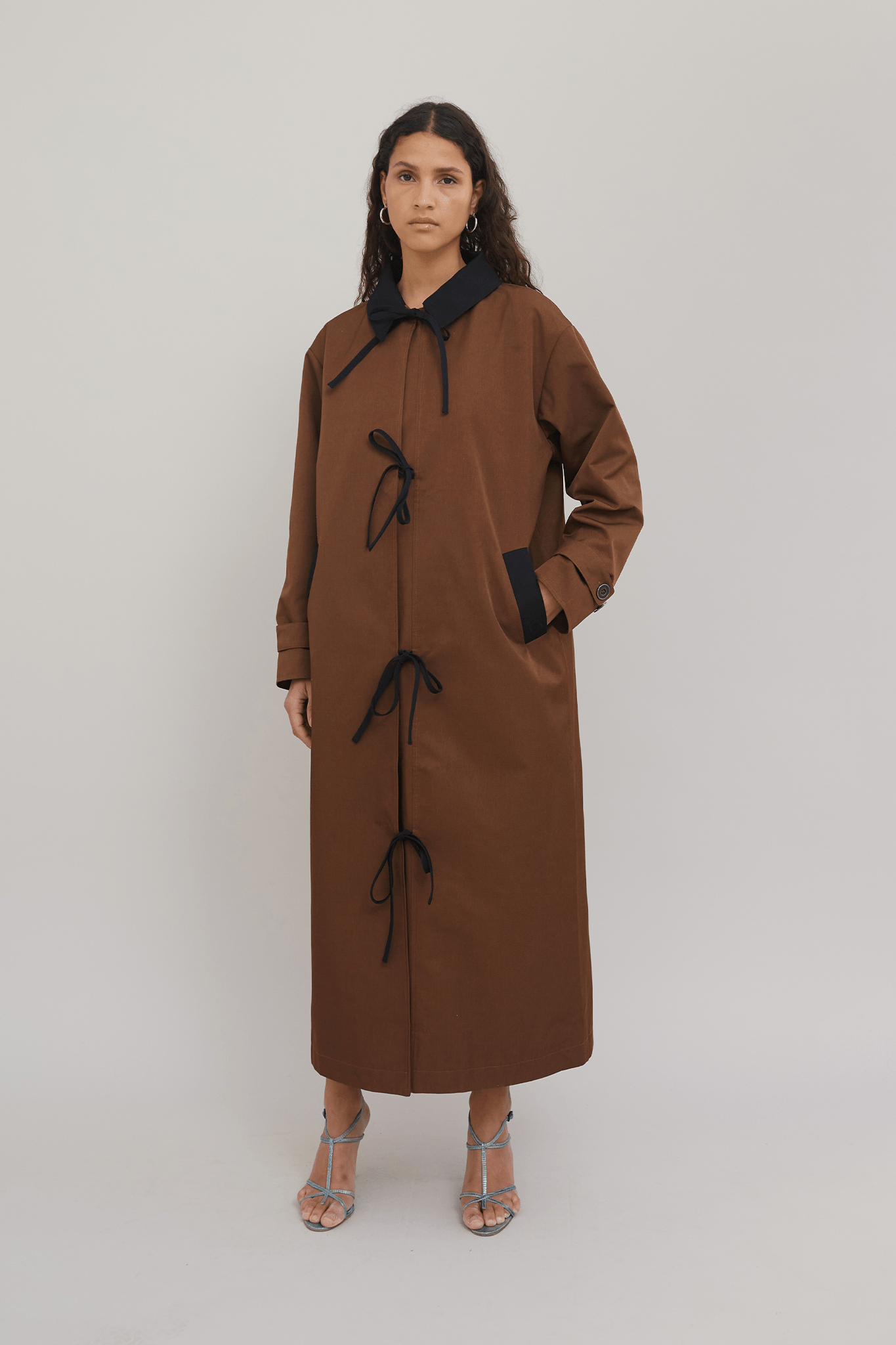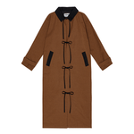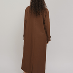 The newly added Isaura is the perfect transitional coat. With references from the traditional trenchcoat, the coat features a pointy collar, buckled cuff tabs, and a loose silhouette. We have added our signature tie closure at the front and contrast detailing making it stand out. The coat has a loose long shape.