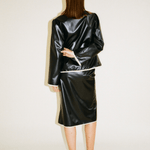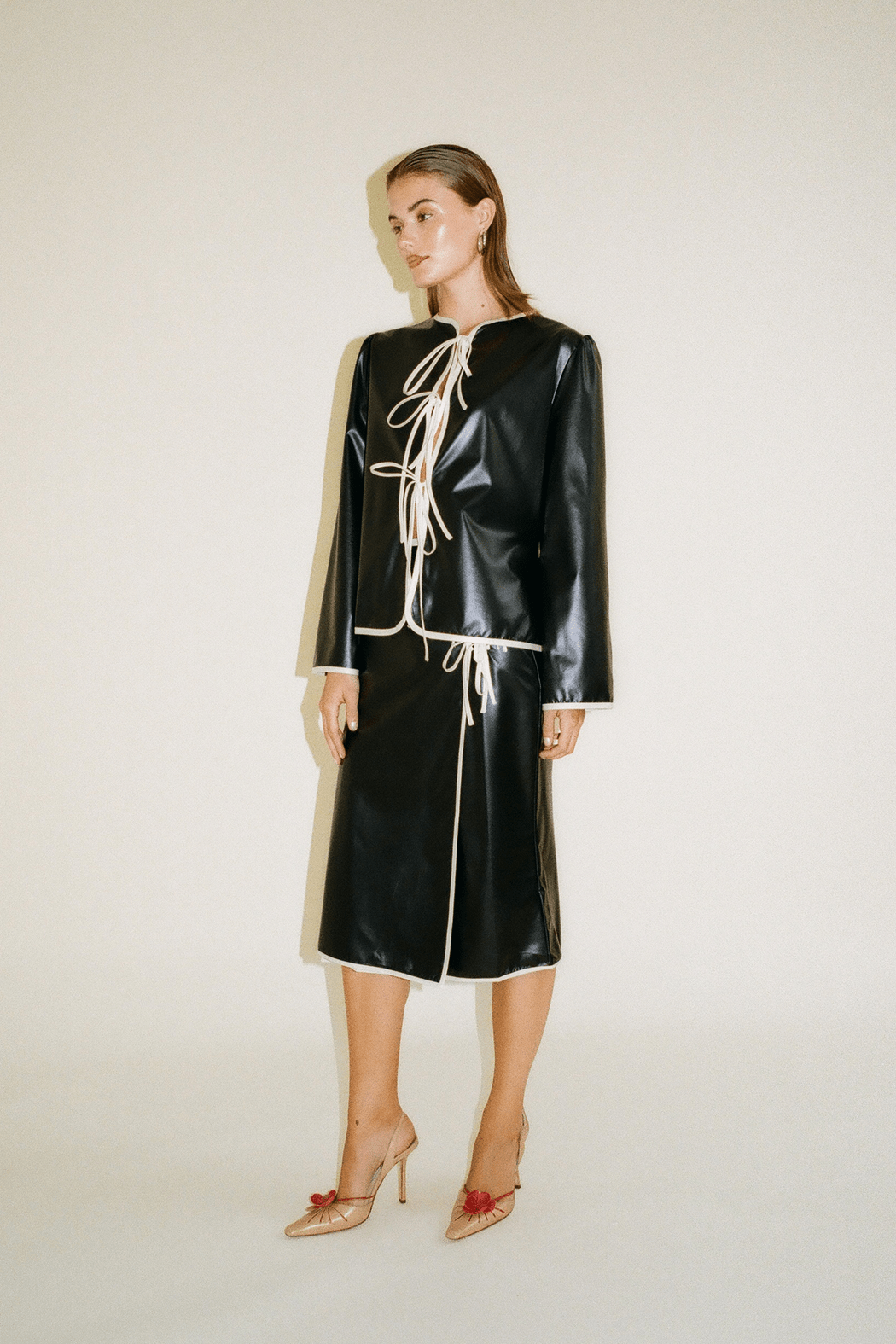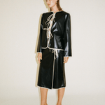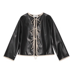 The Minori jacket is a versatile statement piece, as it can be used both as a shirt or layered as a jacket. It is cut from black recycled polyester with contrast white trimming. It has puff shoulders and ties in the front that can be knotted into feminine bows or left undone.