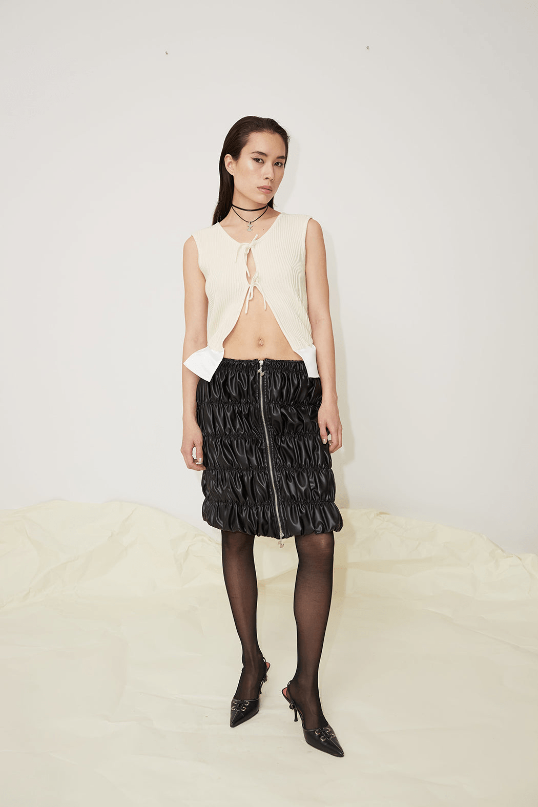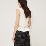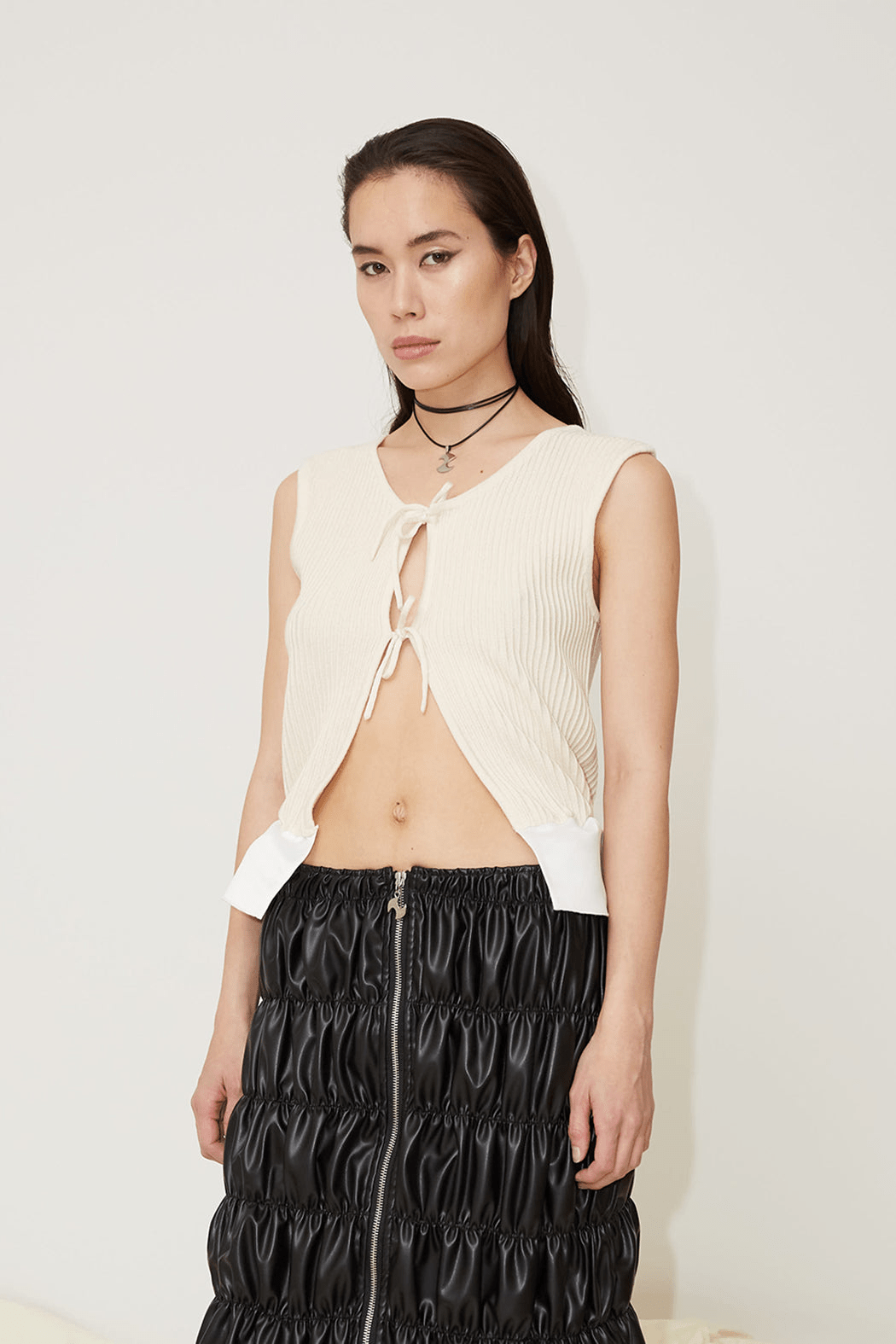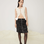The Flora vest is crafted from compact ribbed knit material in 75% recycled wool and 25% recycled silk. The vest features a rounded neckline and is cut to a slim silhouette. Shaped with an open front and slender ties, the ties that can either be left undone or knotted into a bow for a whimsical finish.