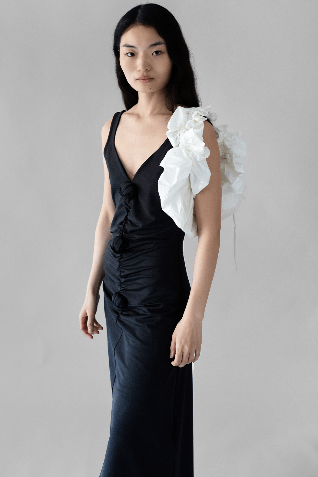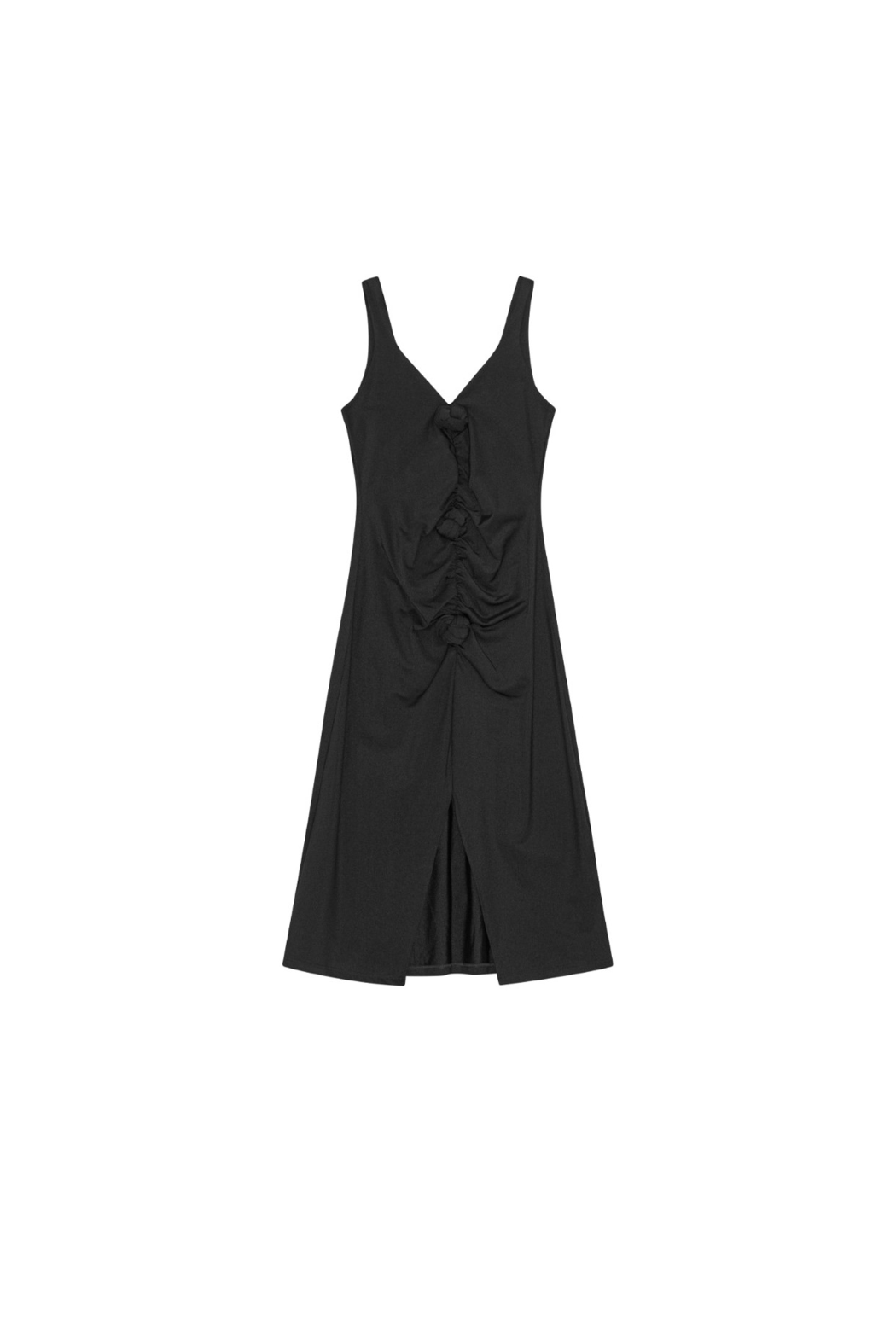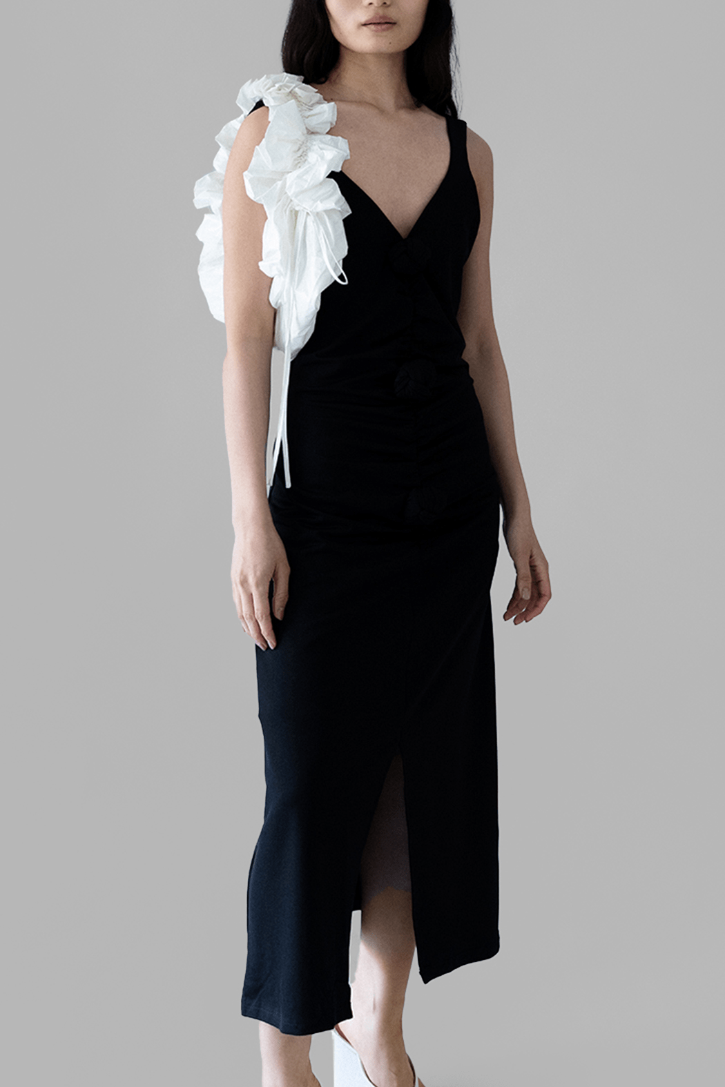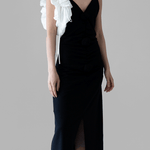 The beautiful Faye dress is back in black and is the perfect dress for that next wedding on your calendar. The dress is crafted from 82% recycled polyester, 18% spandex. Faye has a slim fitted and ruched silhouette to look beautiful on all bodies. The dress has a deep neckline on both the front and back for a sexy touch.