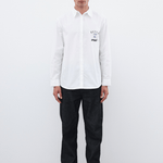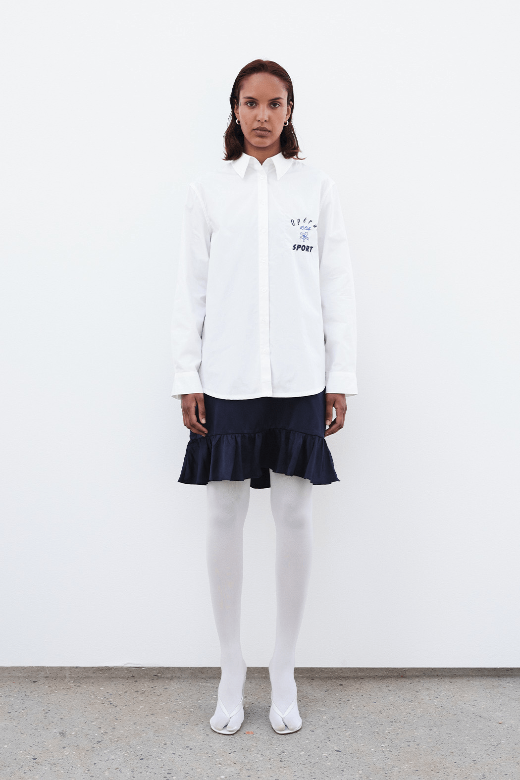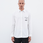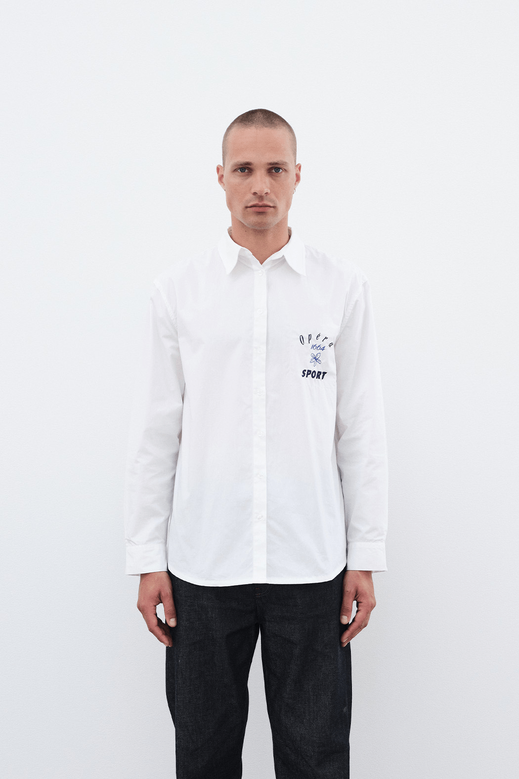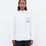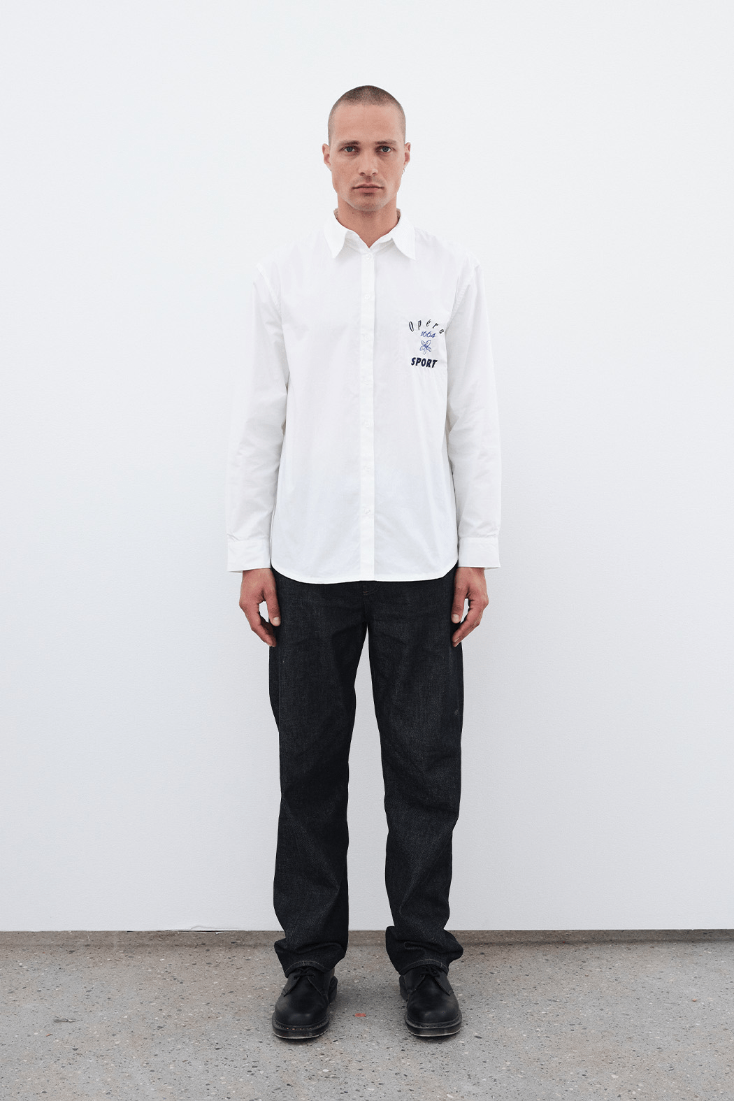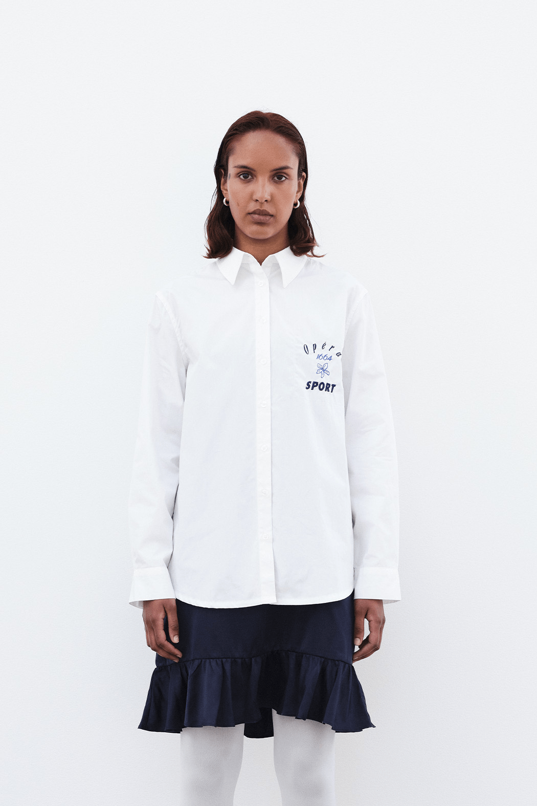 The 1664 Unisex Shirt is a crisp white style made from 50% organic cotton and 50% recycled polyester. It features a loose, oversized unisex fit, with cuffs, a classic collar, and a button-down front. A bold embroidered detail on the chest pocket highlights its capsule identity.
