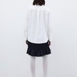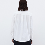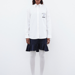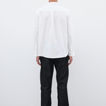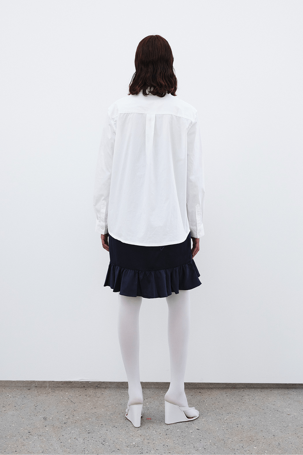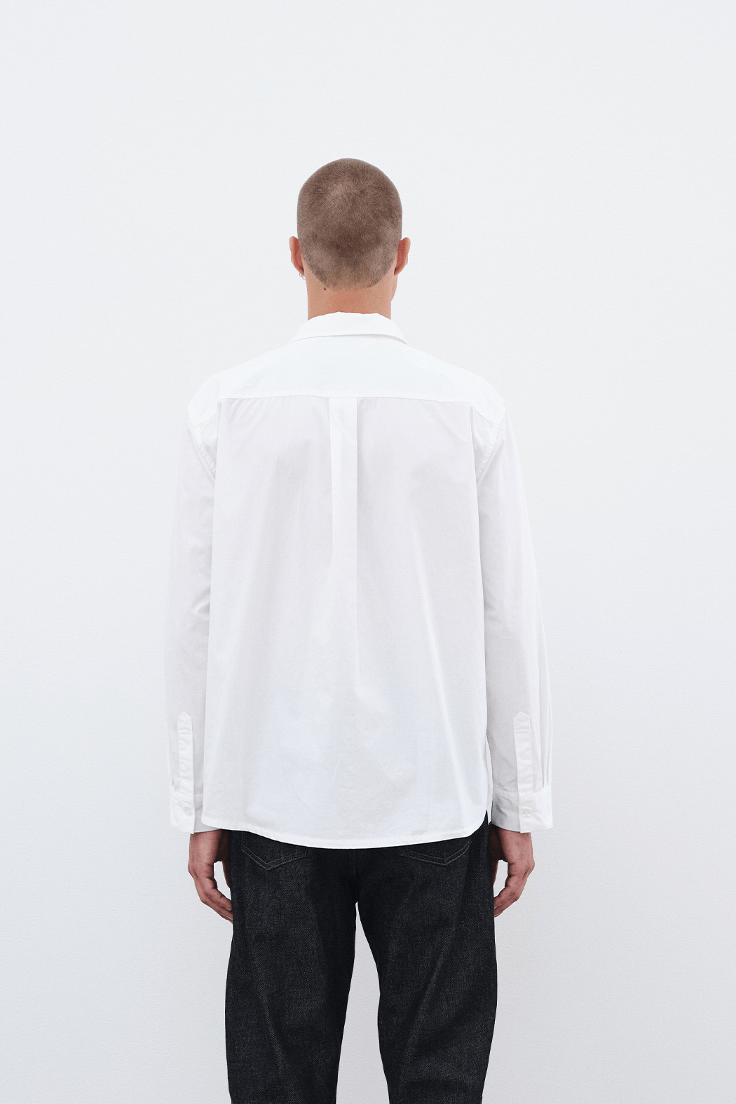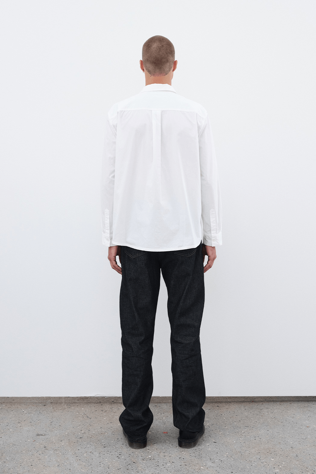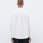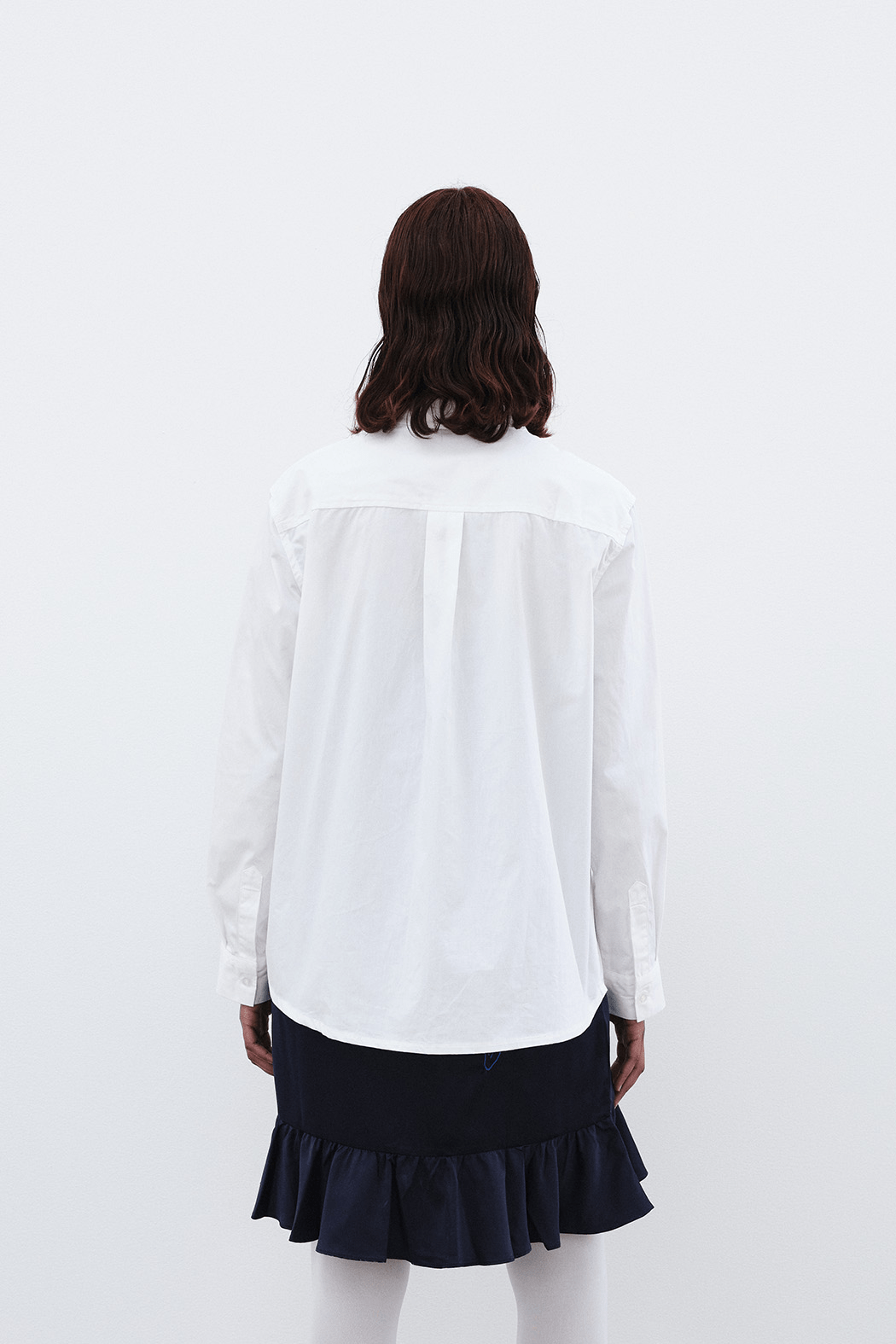 The 1664 Unisex Shirt is a crisp white style made from 50% organic cotton and 50% recycled polyester. It features a loose, oversized unisex fit, with cuffs, a classic collar, and a button-down front. A bold embroidered detail on the chest pocket highlights its capsule identity.