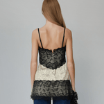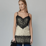 The Emma Top is a camisole style top featuring black spaghetti straps and a flattering V-neckline. The upper portion is crafted from sheer black lace with intricate floral detailing  and the body of the top is a nude satin-like fabric with a black floral line drawing print, creating a striking contrast. The hem is finished with a wide band of matching black lace, giving the piece a feminine and elegant finish.