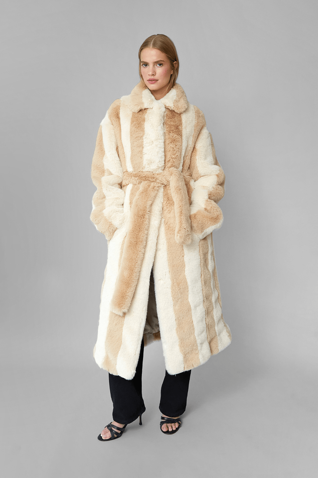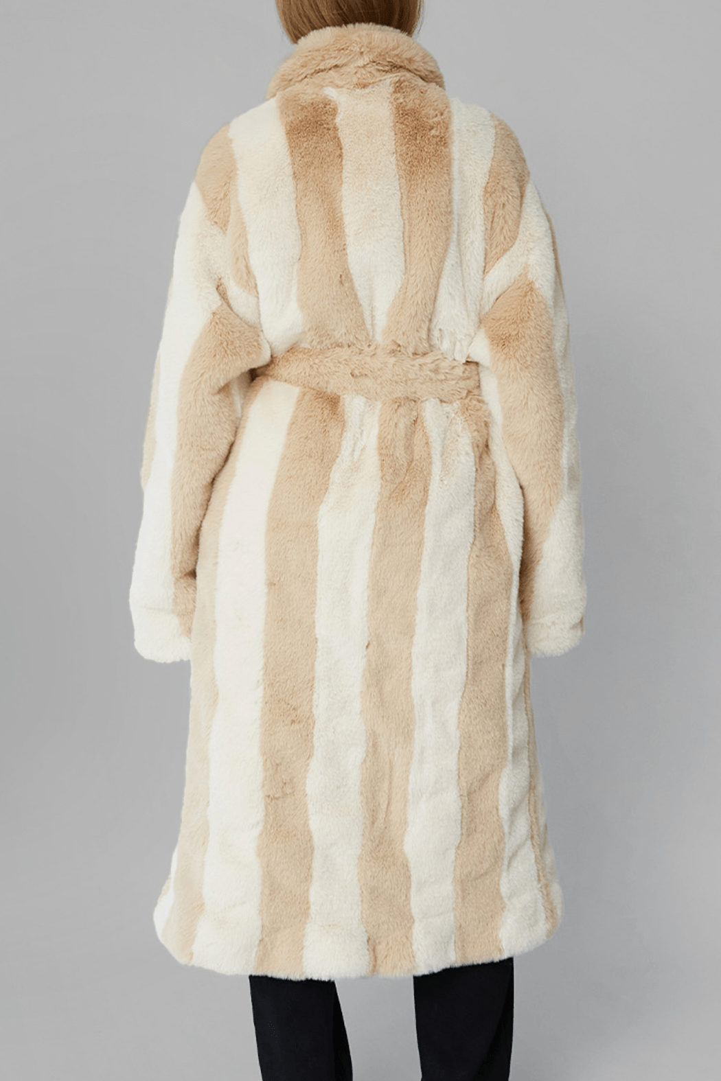Our dreamy Estelle Coat is crafted from the softest 100% recycled polyester. It features an oversized fit with alternating cream and beige stripes. The coat includes two full pockets, a collar, and closes with a belt. The fullness of the coat gives it an elegant and elevated look.