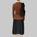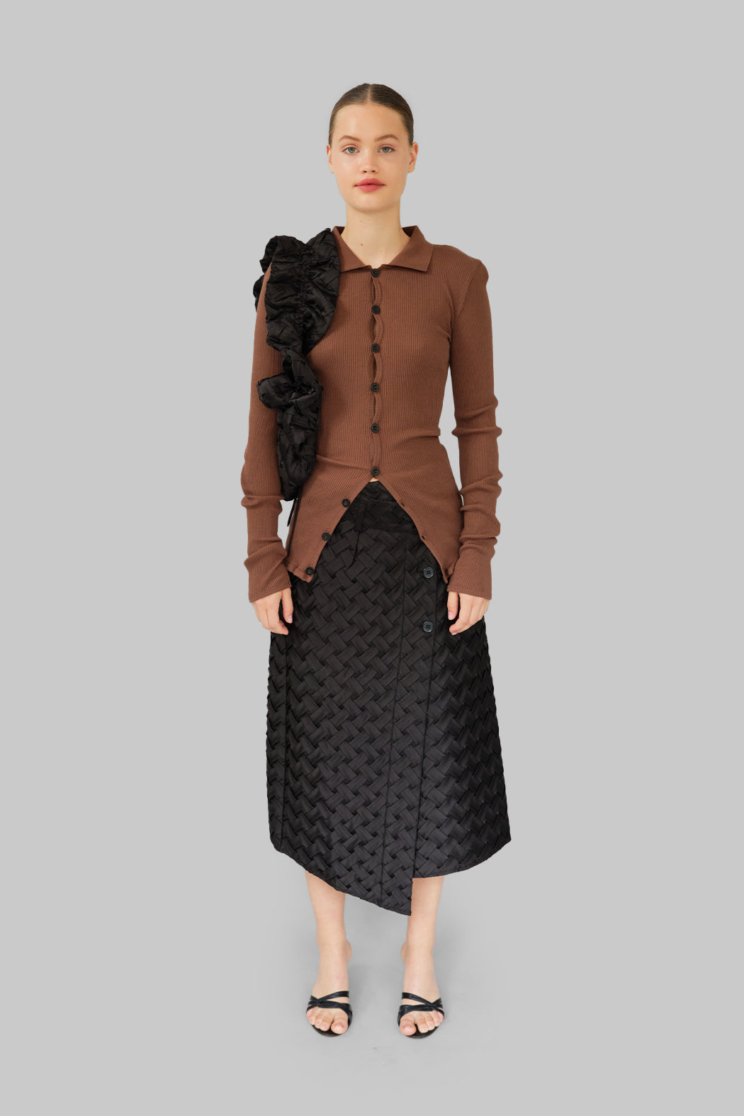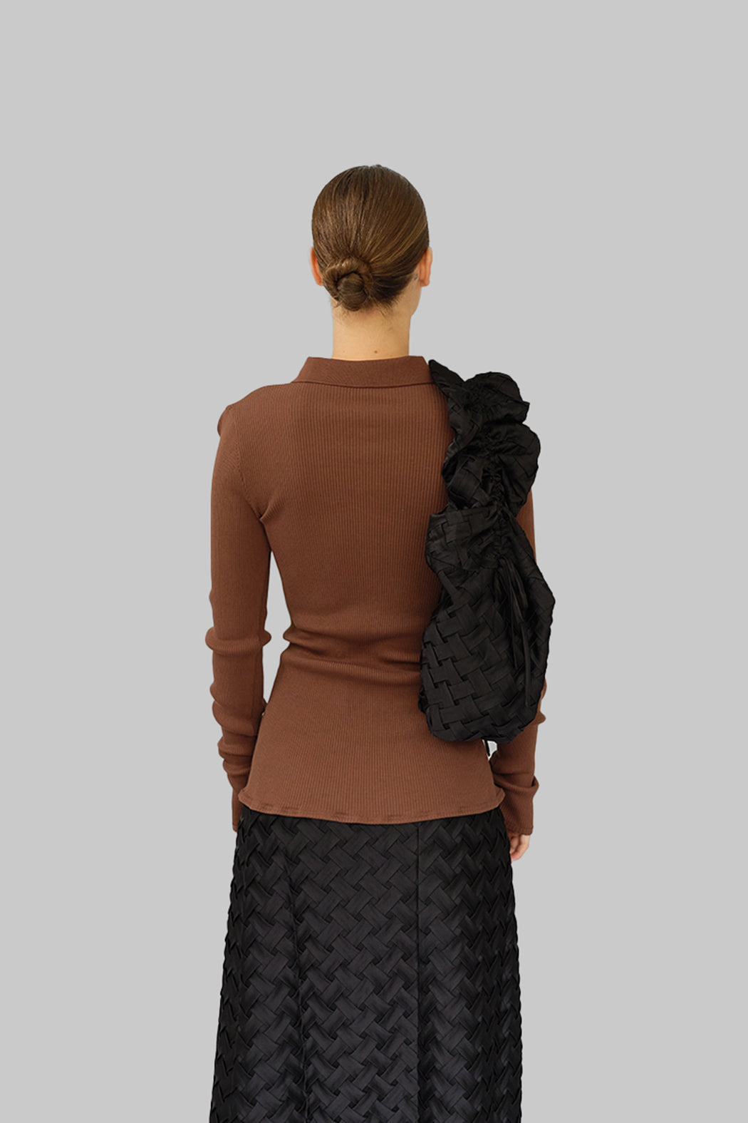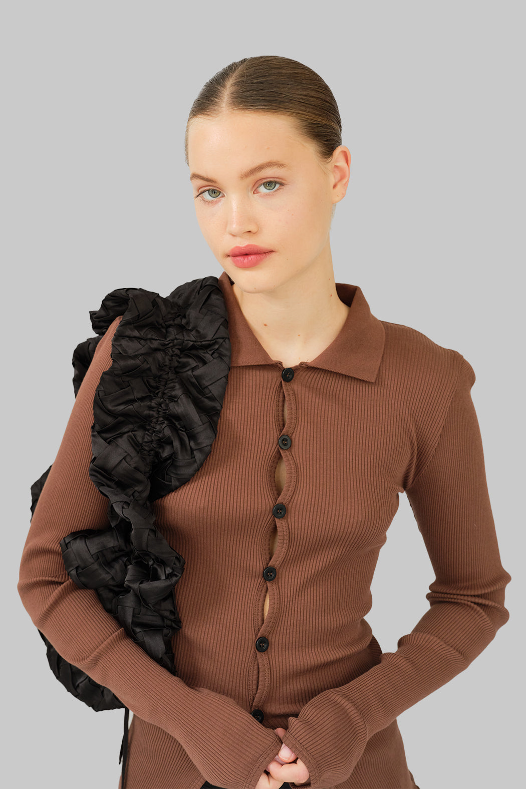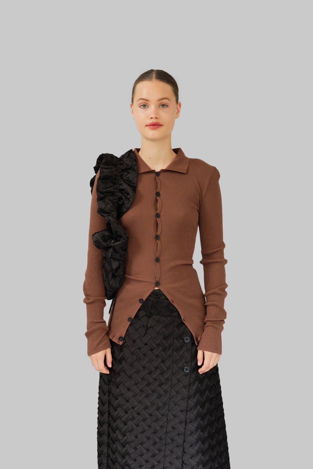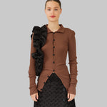 The Laura Shirt is crafted from brown organic cotton with black buttons. Laura has a close-fitted silhouette with long sleeves, a pointy collar, and a button-fastening down the front giving it endless styling options. Please note that our seamless styles are designed with significant stretch, which is why the measurements in our size guide show only minimal variation.