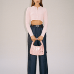 The Carla Cardigan in blush is cropped in length but still super cozy to wear. The asymmetric buttons can be left open or closed. Add our Chiara Bag in pink for another pop of color.