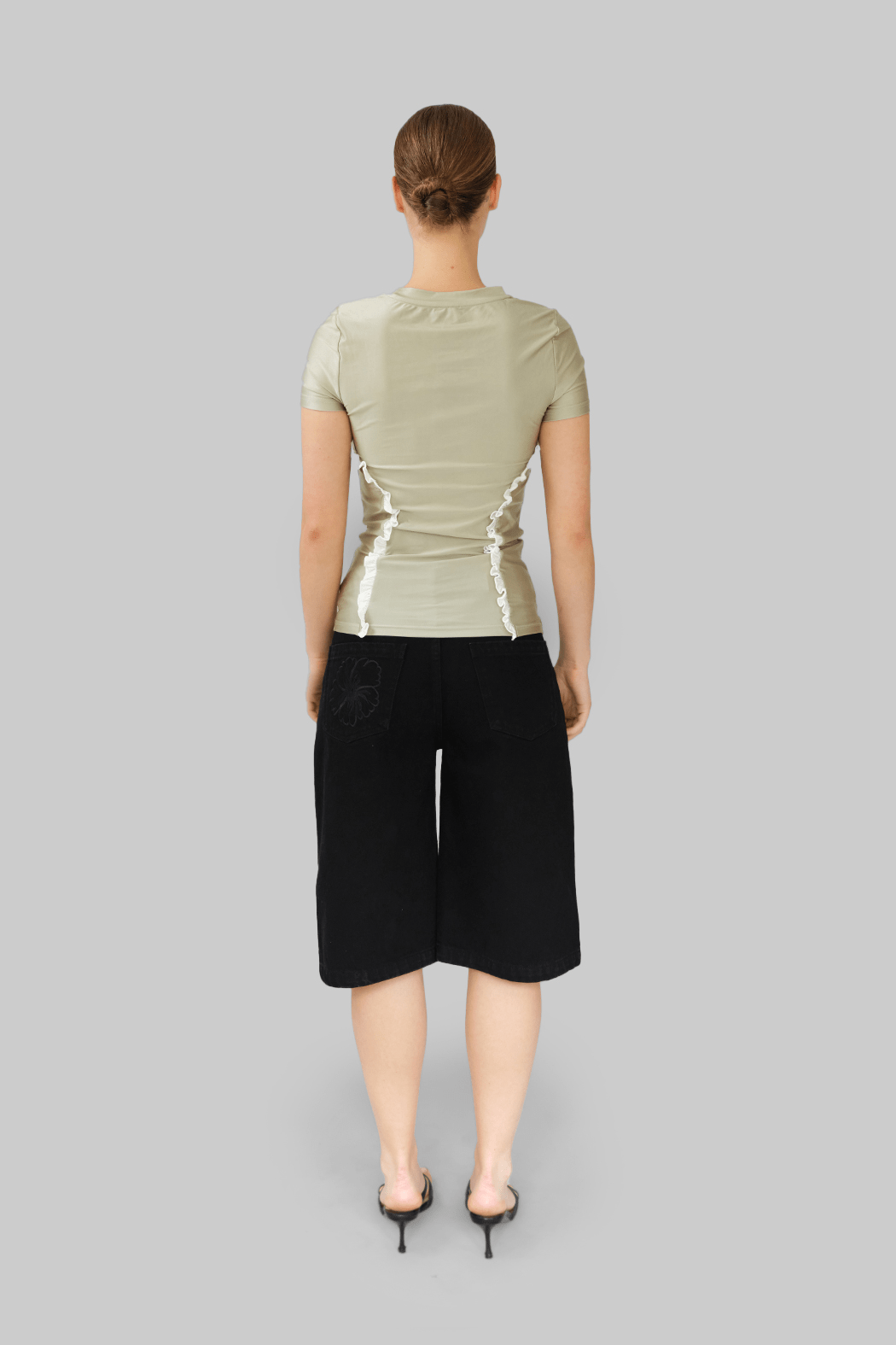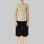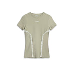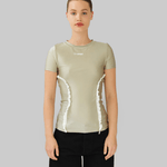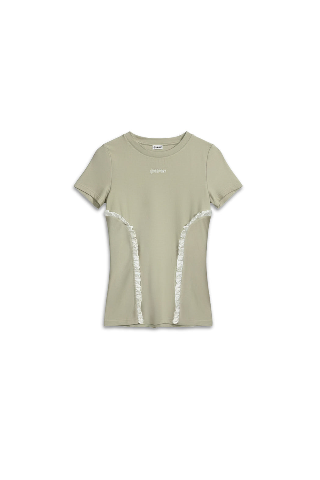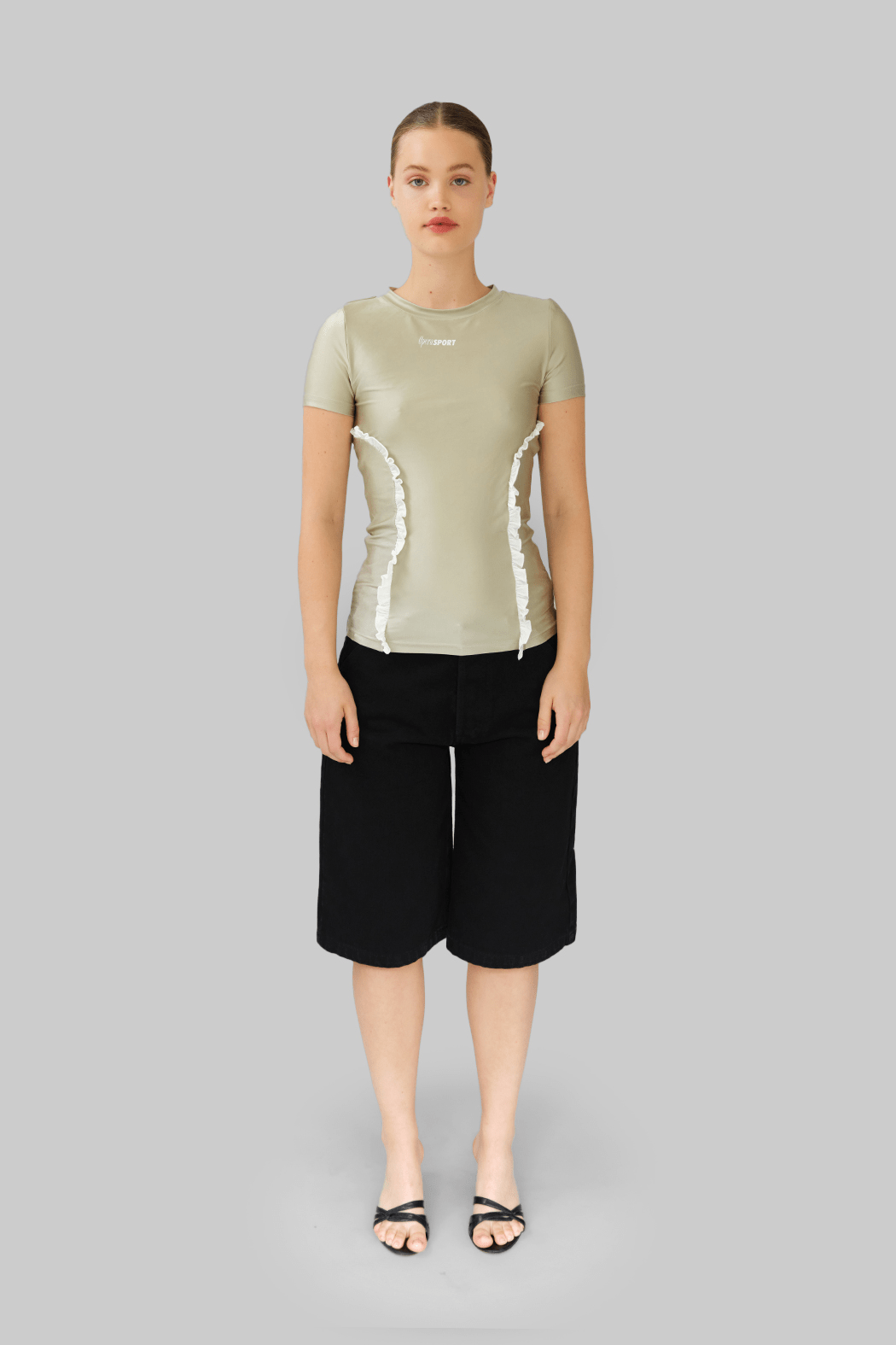 Our Colette Top in Wheat is crafted from recycled nylon and designed to flatter the body with its silhouette. Featuring the signature OpéraSPORT logo on the front and delicate white ruffle detailing, this versatile piece is perfect for both casual and elevated looks.