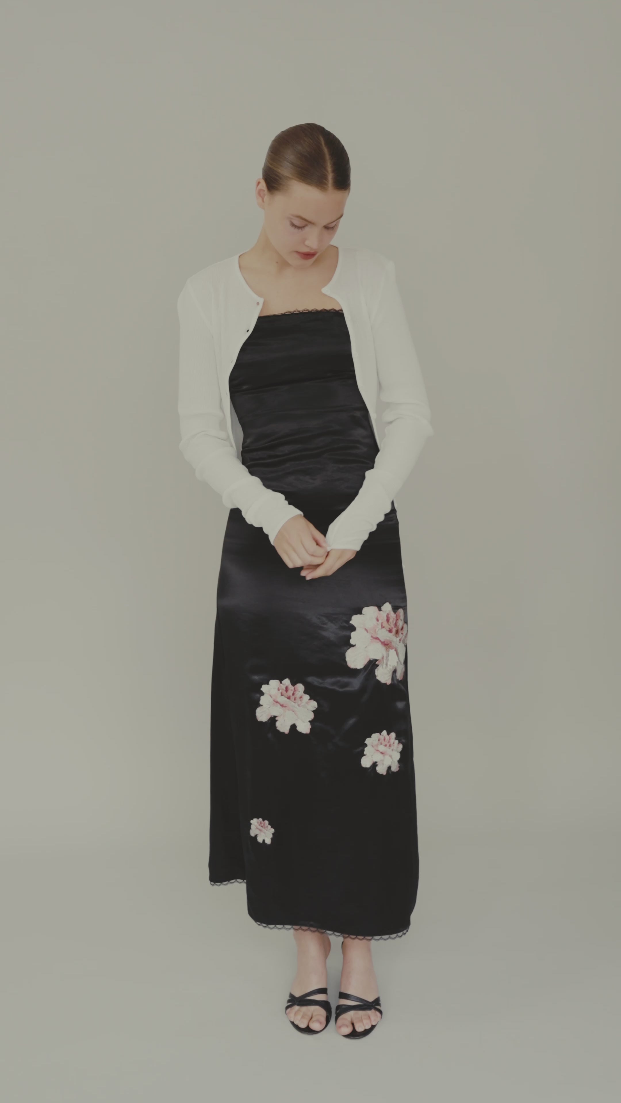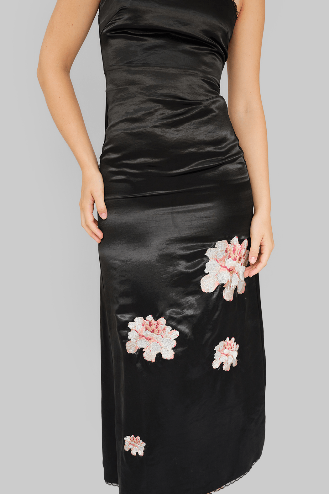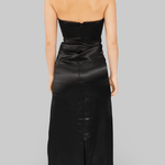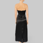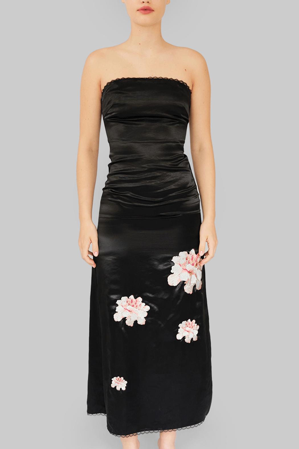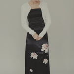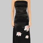 The Maya Dress is crafted from a soft blend of Lenzing Tencel, recycled polyester, and organic cotton in black. Designed with a (removable) strapless silhouette, it features a fitted bodice with subtle ruching and a straight neckline trimmed with delicate lace. The satin-like fabric is decorated with floral prints in soft tones, adding a romantic contrast to the sleek base. Falling to a midi length, the dress drapes elegantly. The style runs small, so we recommend choosing one size up.