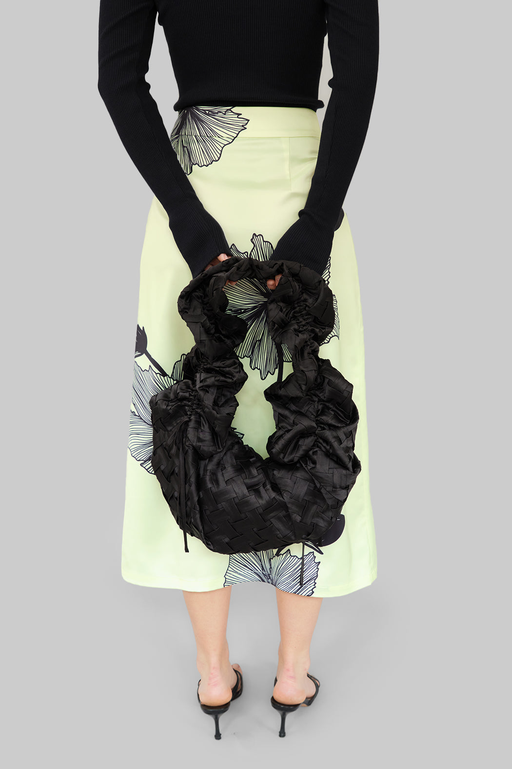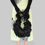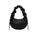 The Shirley Bag is reimagined in a new woven design, crafted from 100% recycled polyester in black. Its soft, ruched construction and sculptural silhouette make it a statement accessory. Finished with an adjustable strap, it can be styled around the shoulder, crossbody, or carried as a handbag.