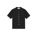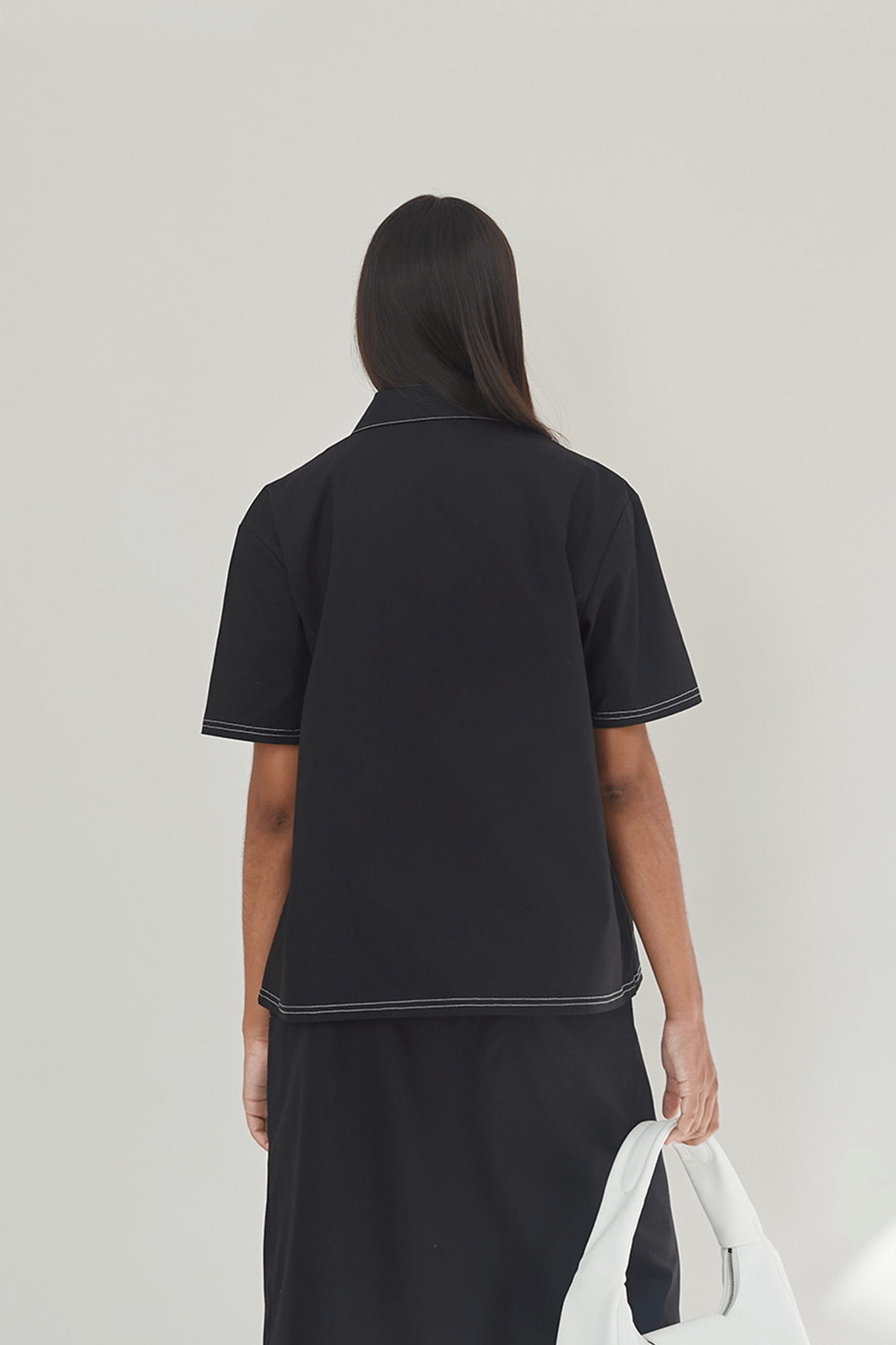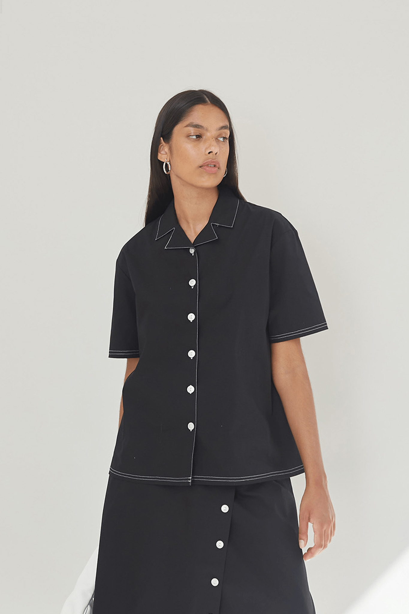 The Kai shirt is made from 100% recycled cotton, presenting a sleek black hue with contrasting light stitching along the edges. The accompanying shirt features a v-neck neckline, complete with a collar and light-colored buttons that elegantly fasten the garment down the center. Style it with our Willow skirt for a full look.
