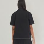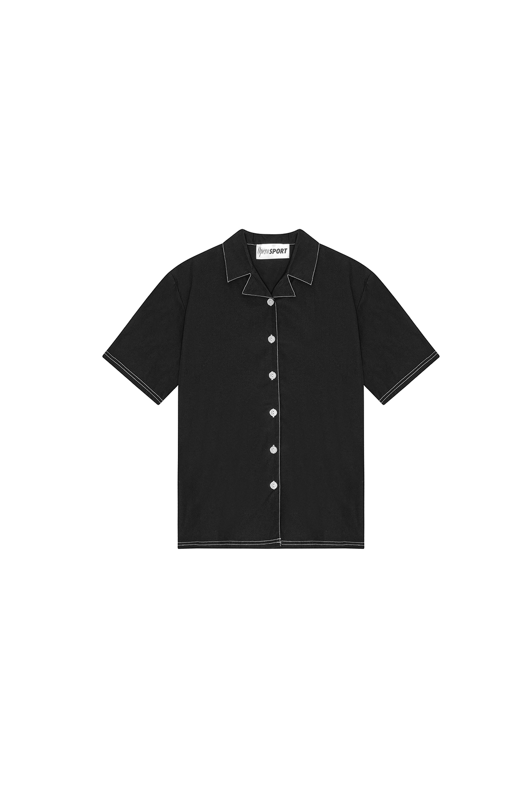 The Kai shirt is made from 100% recycled cotton, presenting a sleek black hue with contrasting light stitching along the edges. The accompanying shirt features a v-neck neckline, complete with a collar and light-colored buttons that elegantly fasten the garment down the center. Style it with our Willow skirt for a full look.