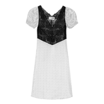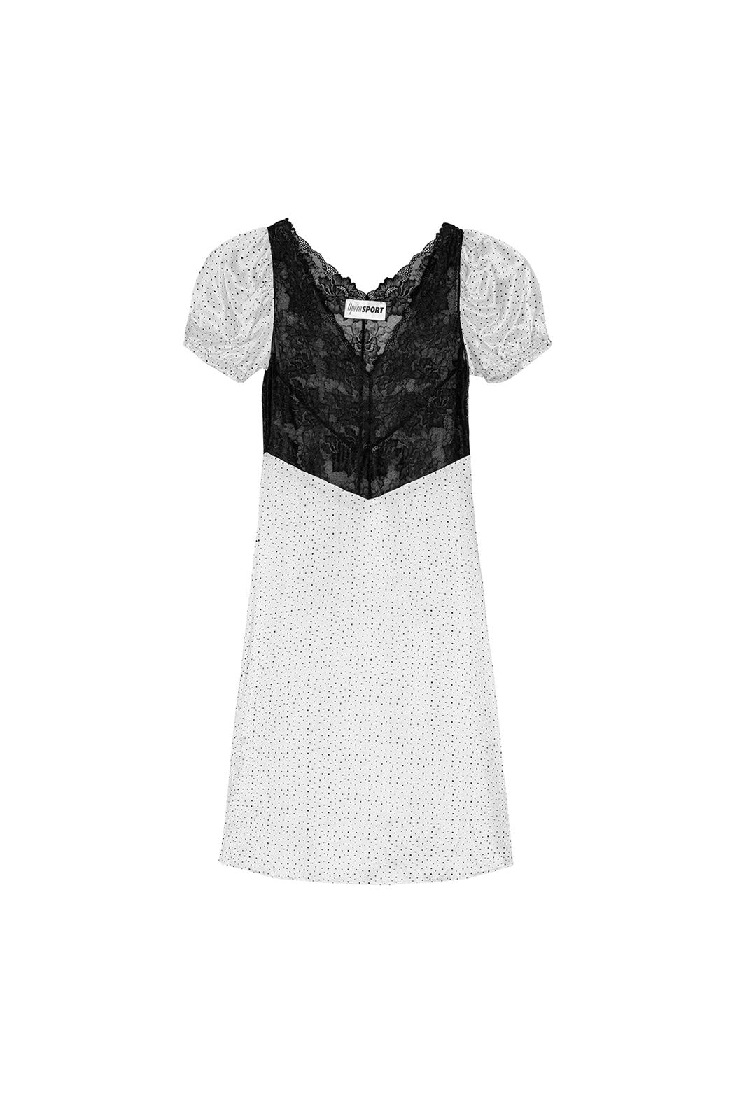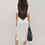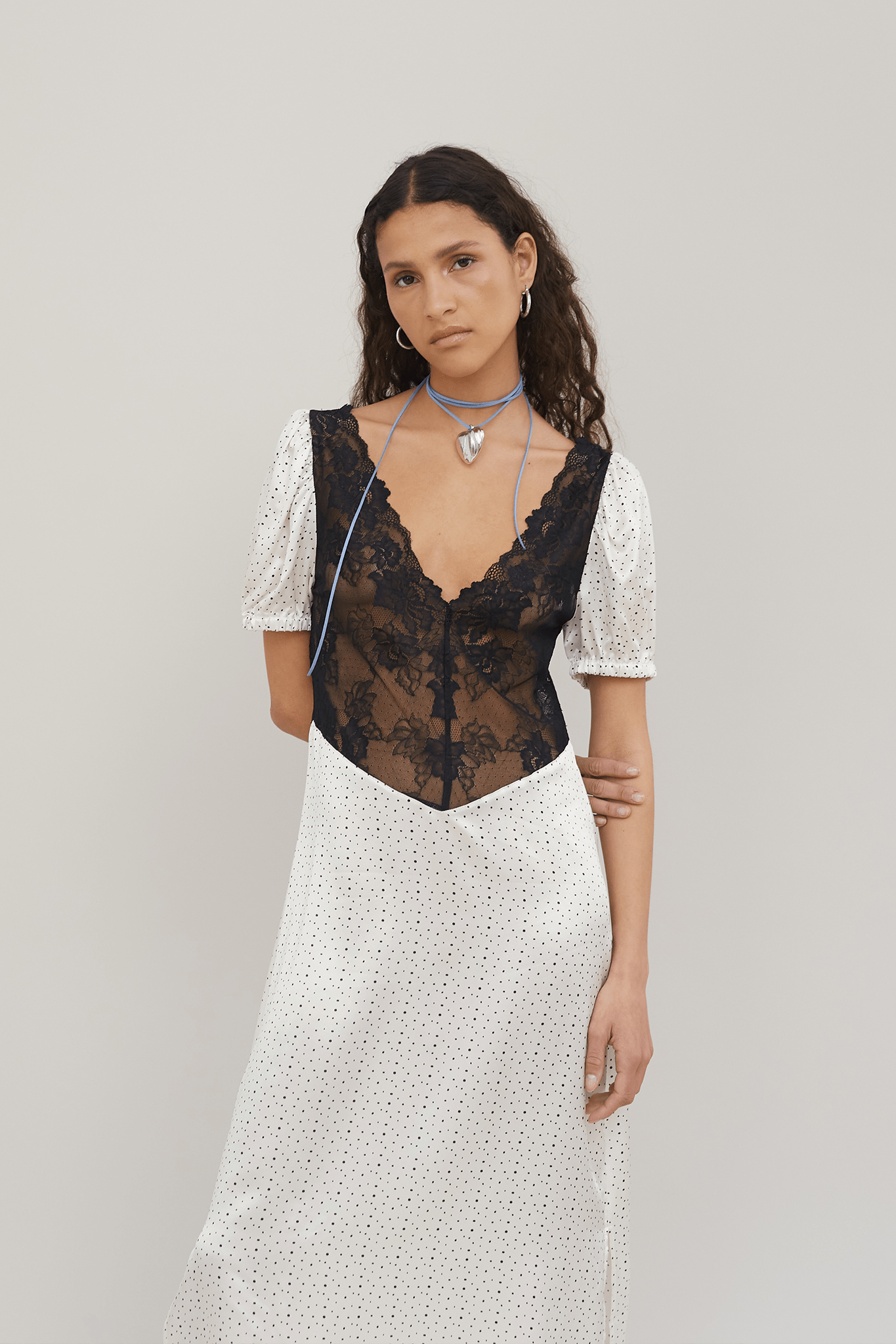 The elegant Carmo dress is crafted from delicate laces and printed recycled silk. It has a fitted design with a v-shaped neckline and short voluminous sleeves. The dress has a midi-length silhouette with a a-shaped skirt with a slit on the side.