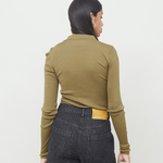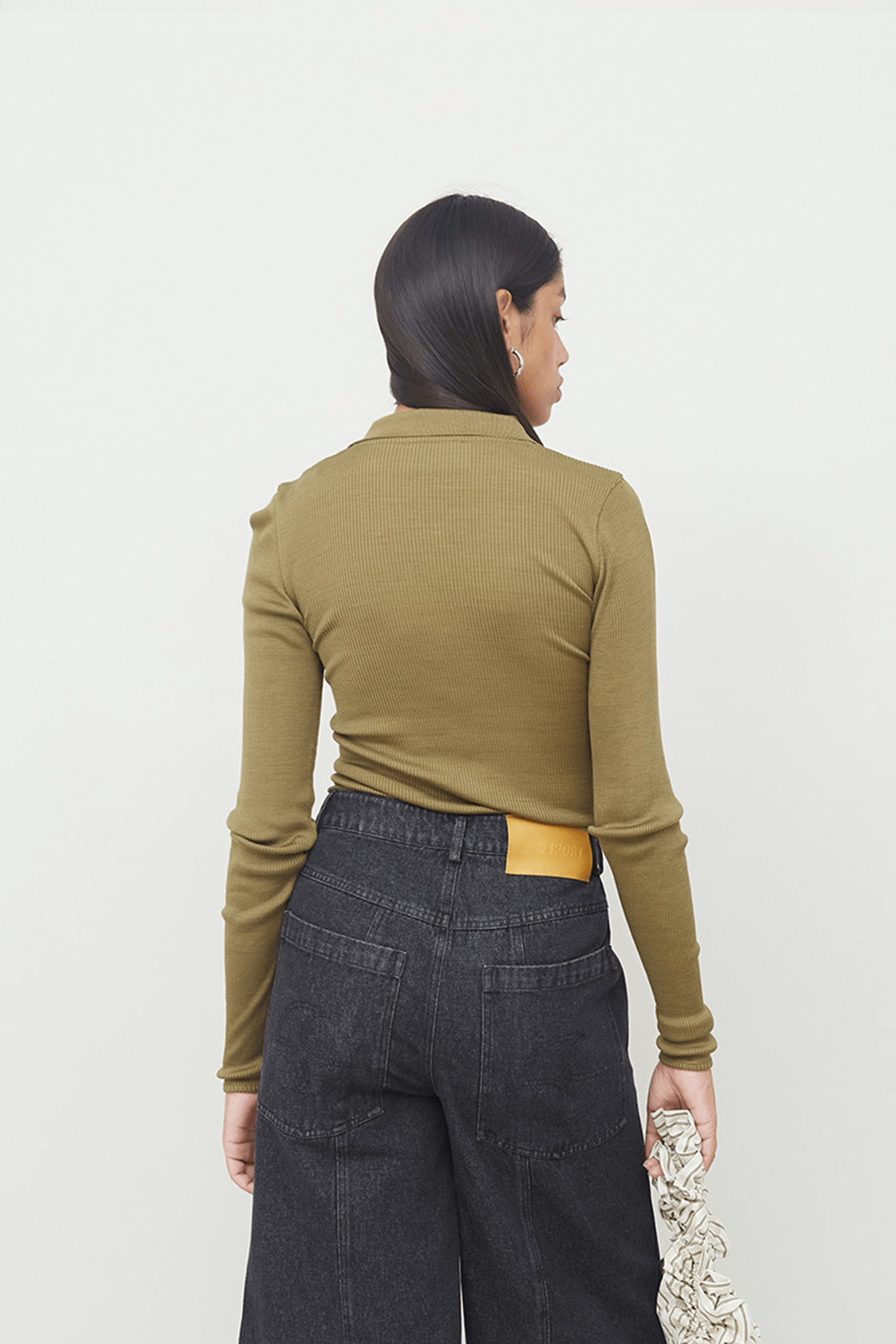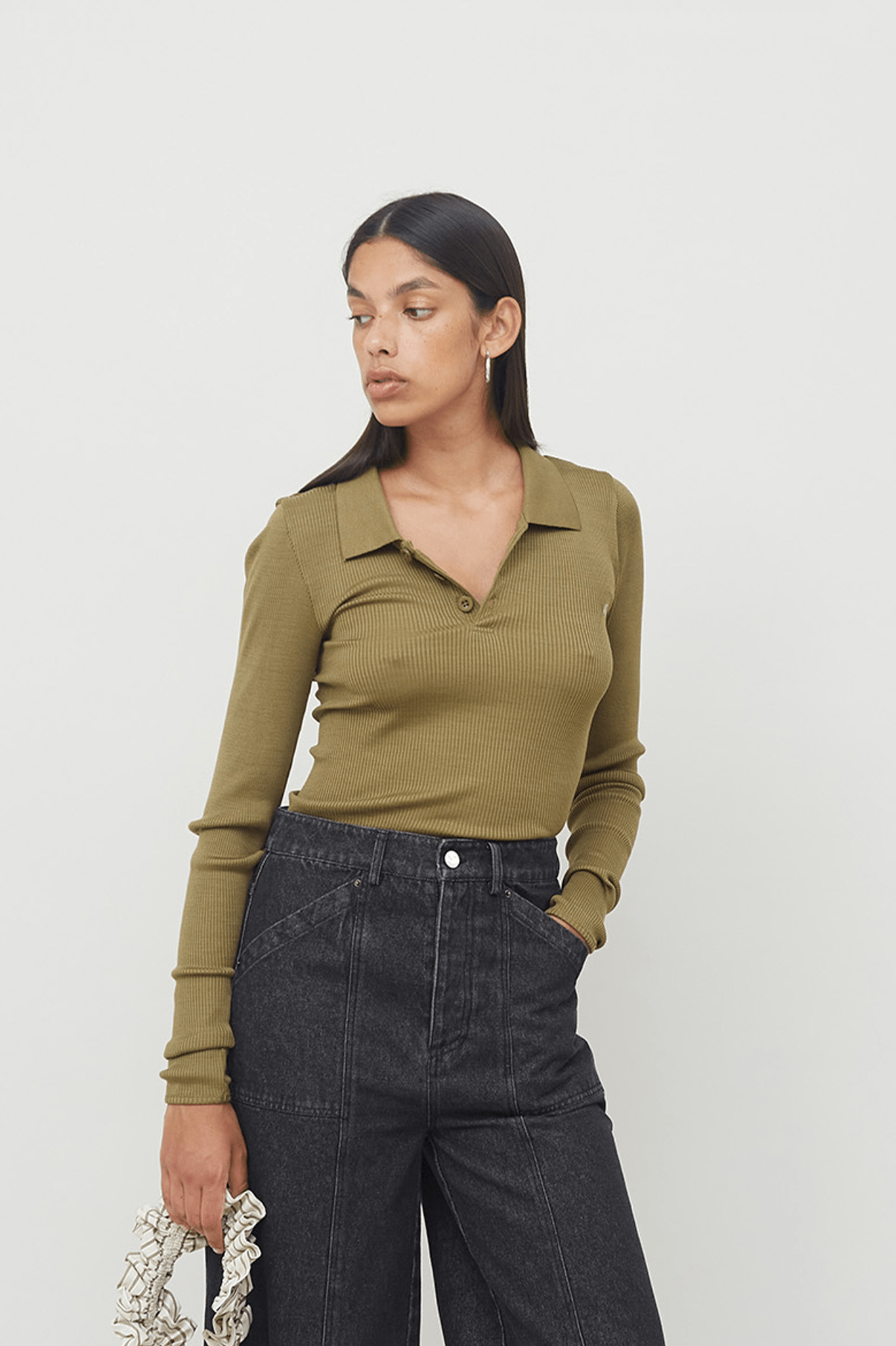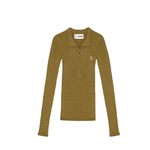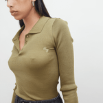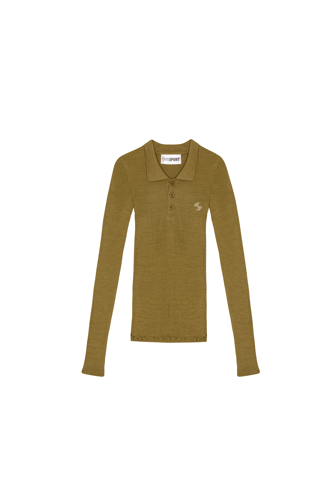 Our Hazel seamless polo in olive green is crafted from 100% recycled silk. The seamless polo closely hugs your figure and fits all shapes and sizes with all-over ribbed detailing. It has our OperaSPORT logo embroidered on the burst. Hazel looks good button up or down.