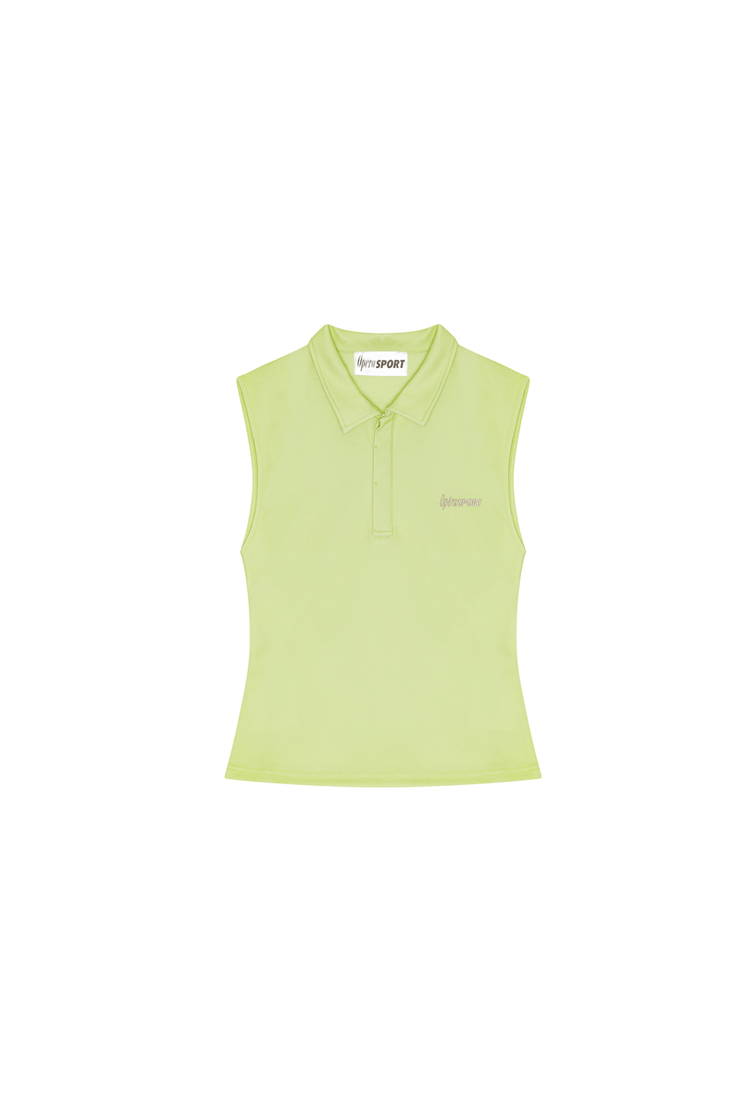 Our Cassia top is crafted from 100% recycled polyester in a shadow lime green color. Cassia is a sleeveless polo with partial button closure. It features a collar and the iconic OperáSPORT logo embroidered. Cassia is perfect for looking both sporty and elegant.