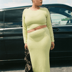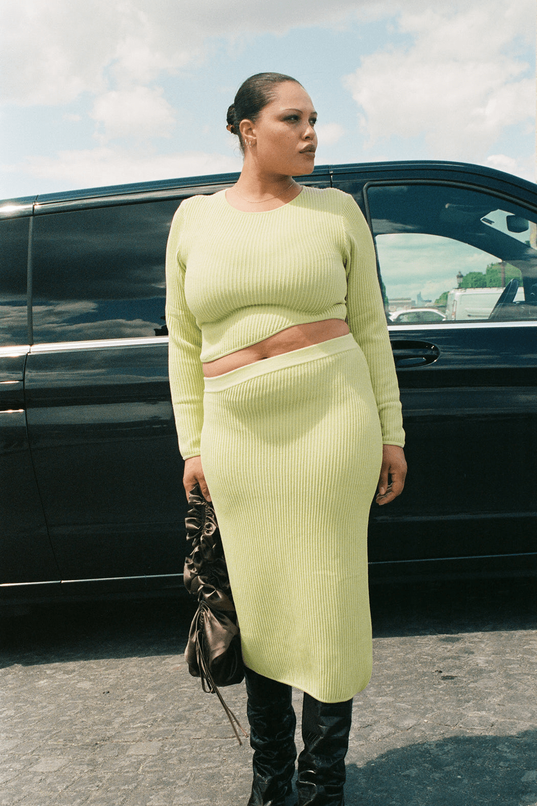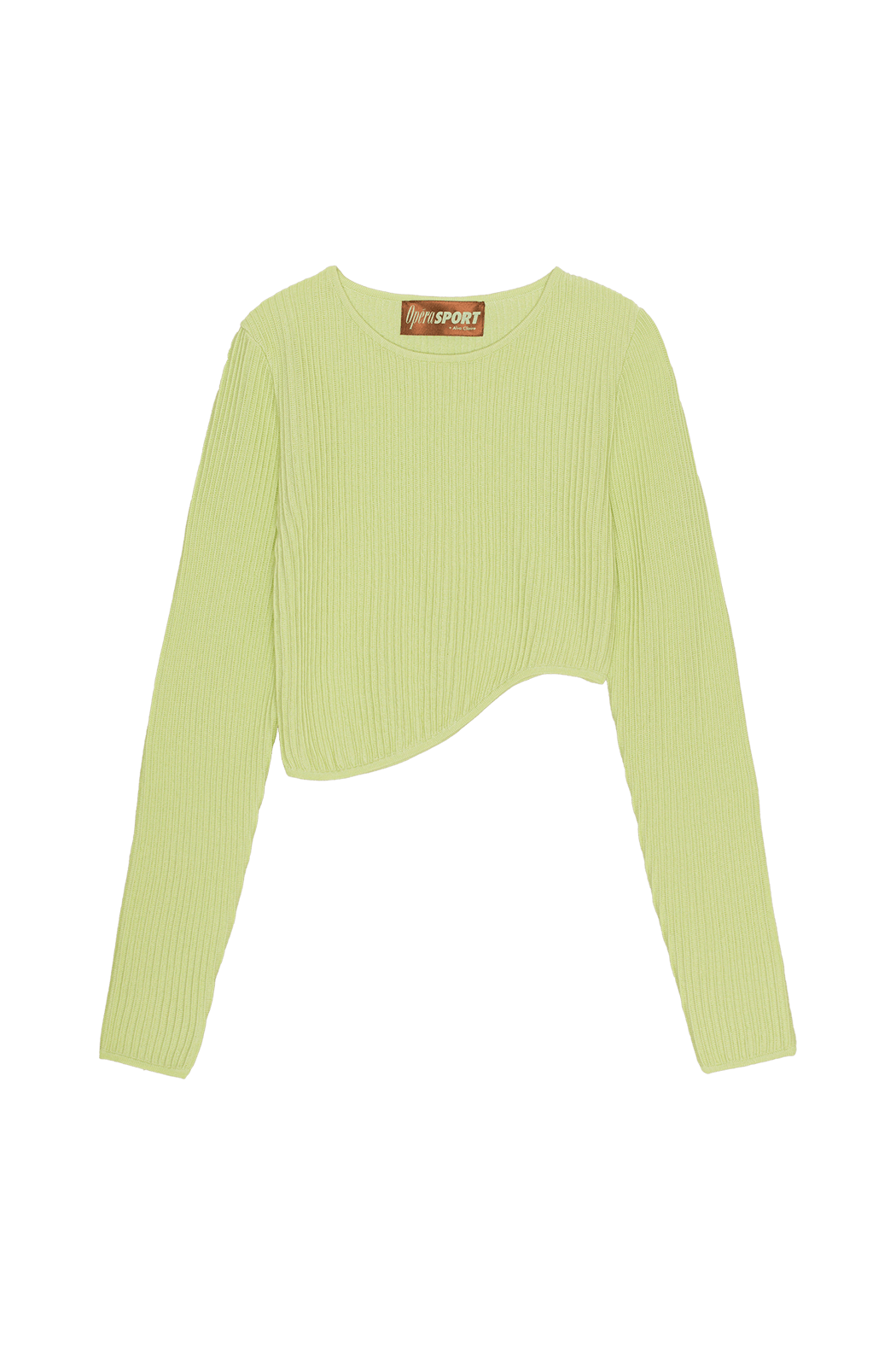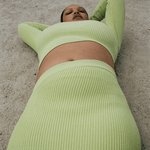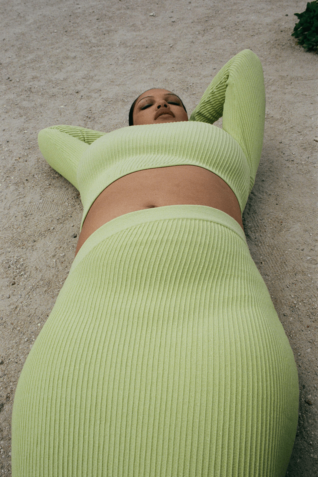 The Chrystie top is part of a Limited edition collaboration with Alva Claire. In the fresh lime green color, the top is made from a ribbed recycled wool and silk blend. It features a close-fitted silhouette, long sleeves, a round neckline, and a wavy asymmetrical hemline. Complete the look with the matching Mercer Skirt.