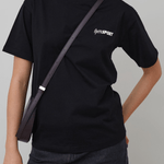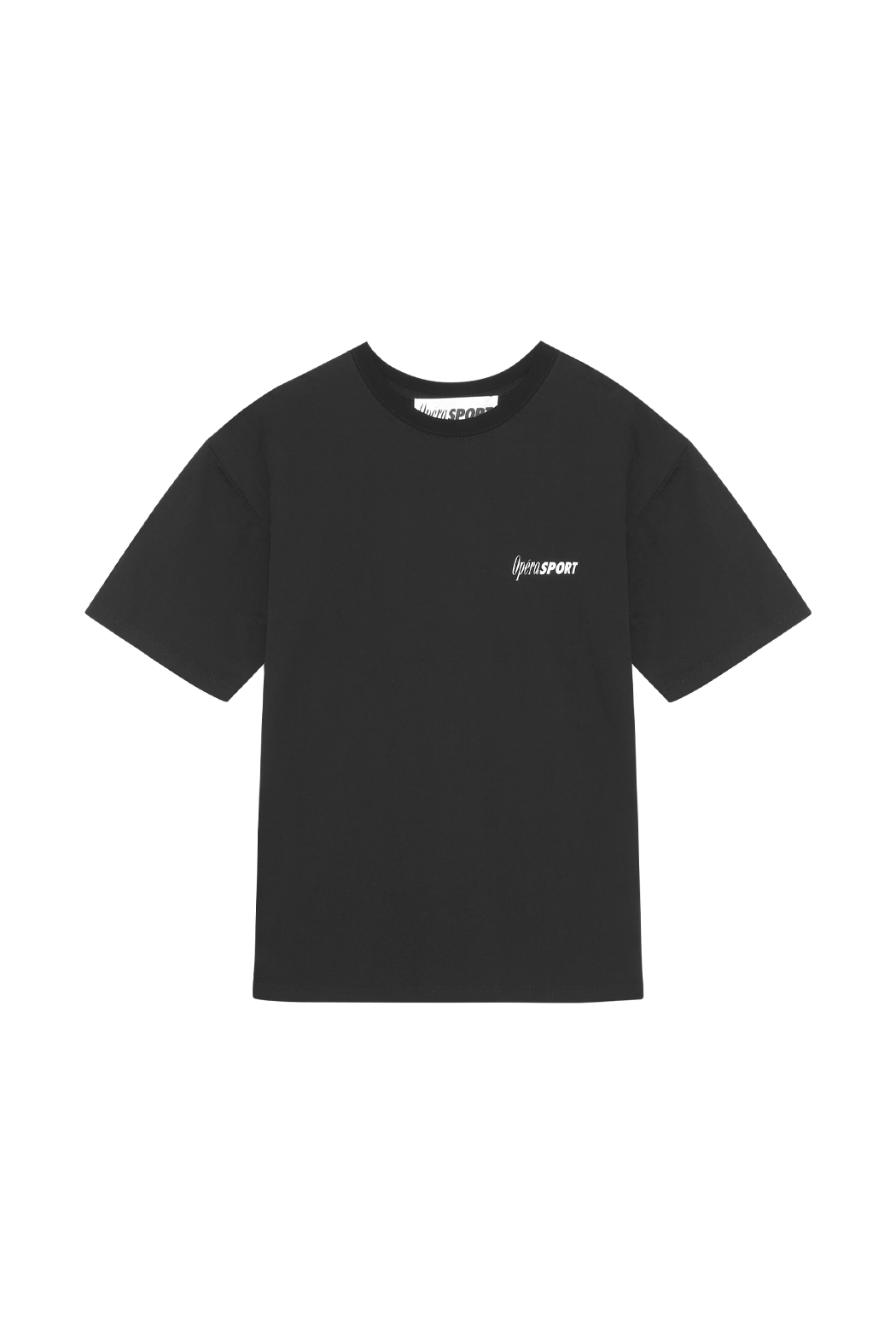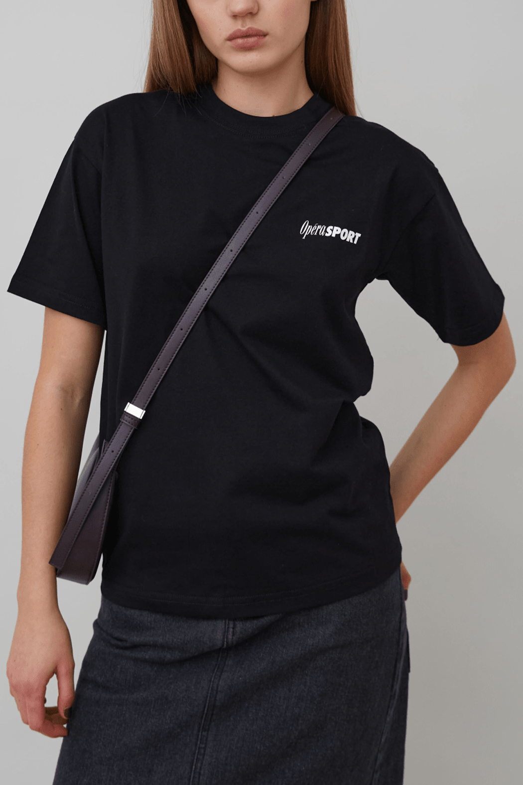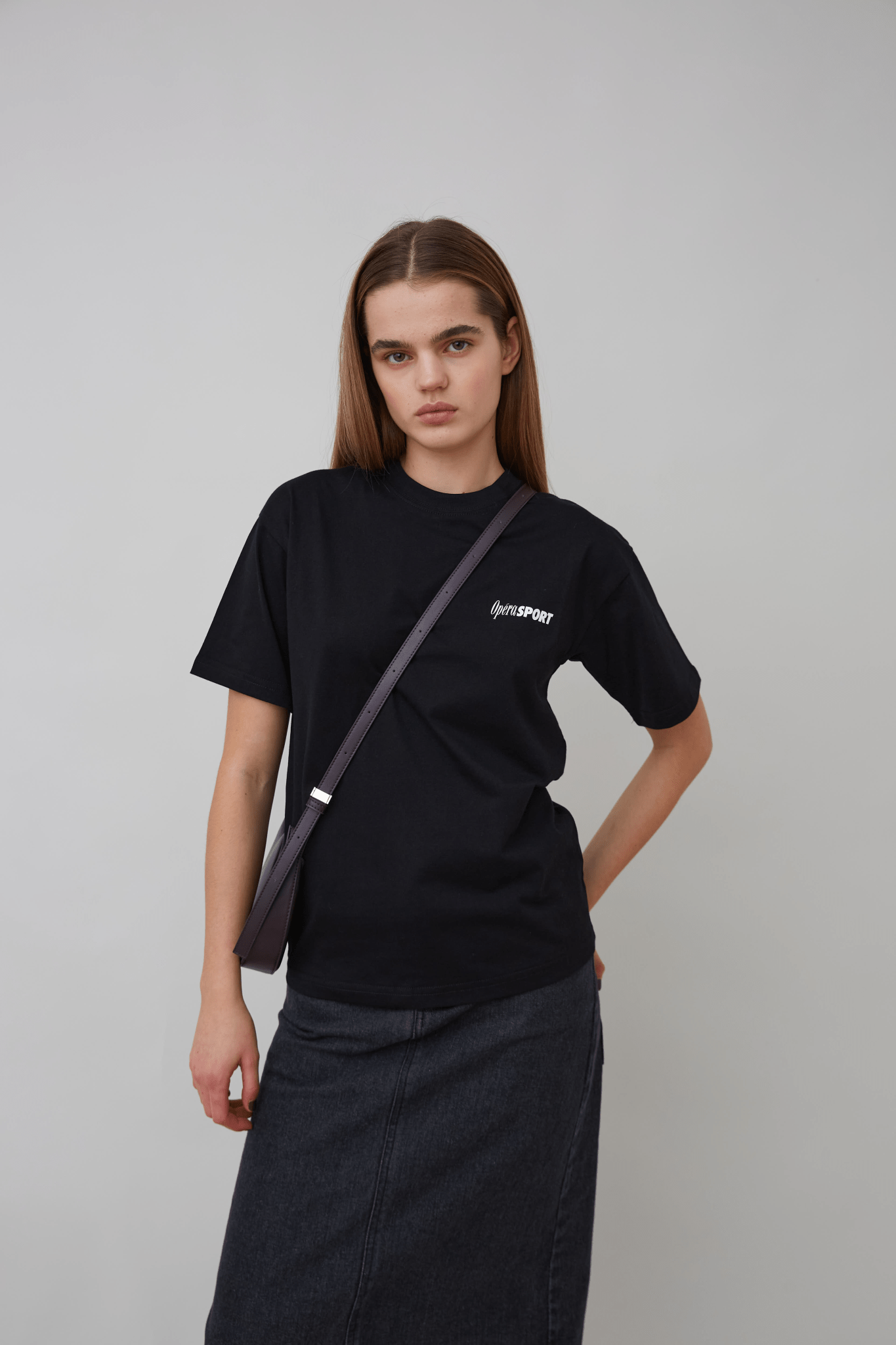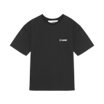 The Claude t-shirt is crafted from black 100% organic cotton. It has a relaxed fit and features a round neckline, short sleeves, a contrast logo print at the chest, and a straight hem.