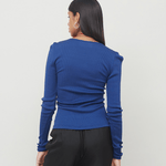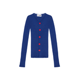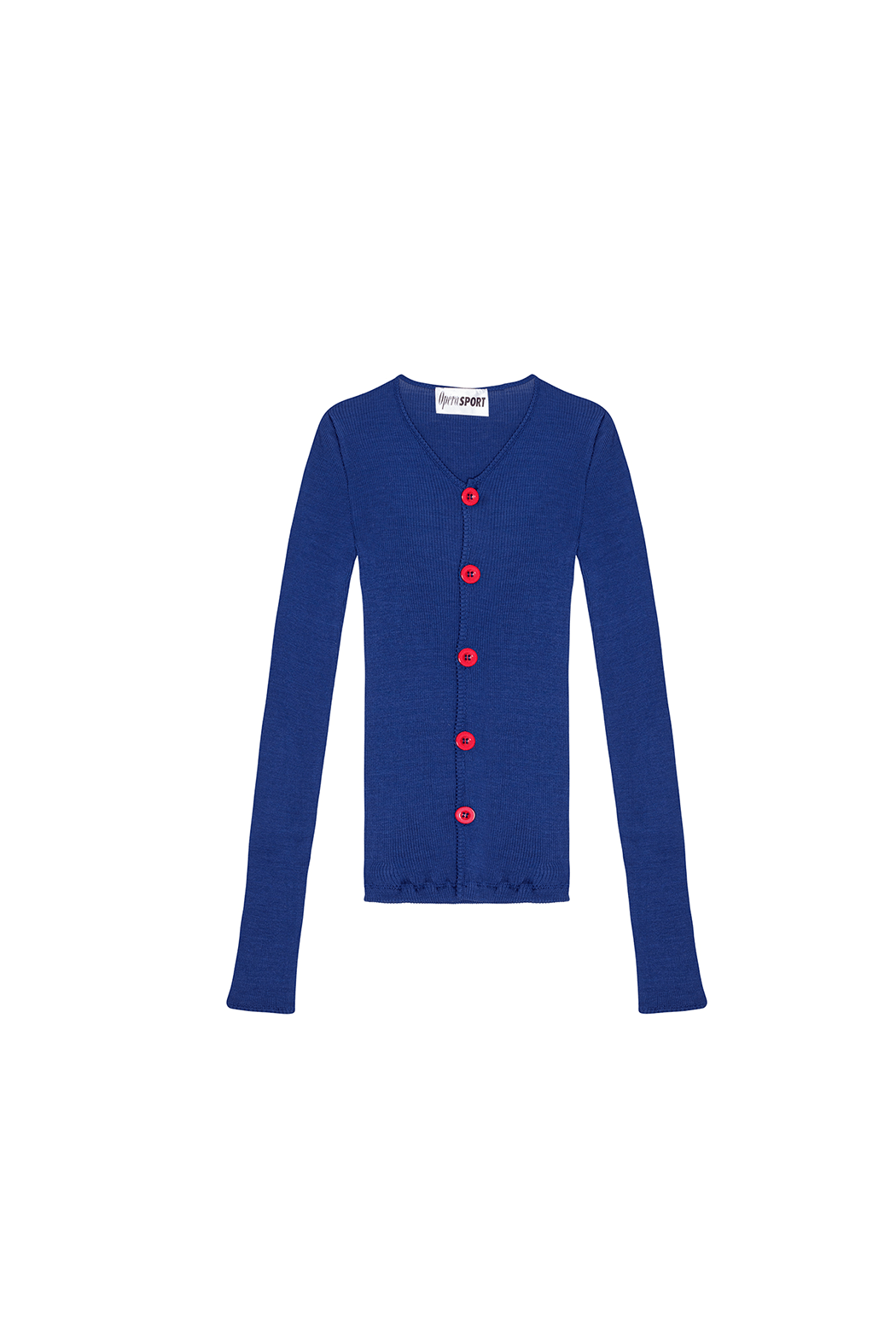 Our Cora seamless cardigan is crafted from seamless recycled silk. The cardigan has a fitted silhouette with long sleeves and a V-shaped neckline. The cardigan fastens with buttons down the front. The buttons are in a robust red color in contrast to the navy fabric. Please note that this garment is made from 100% recycled silk, which is why small knots can appear.