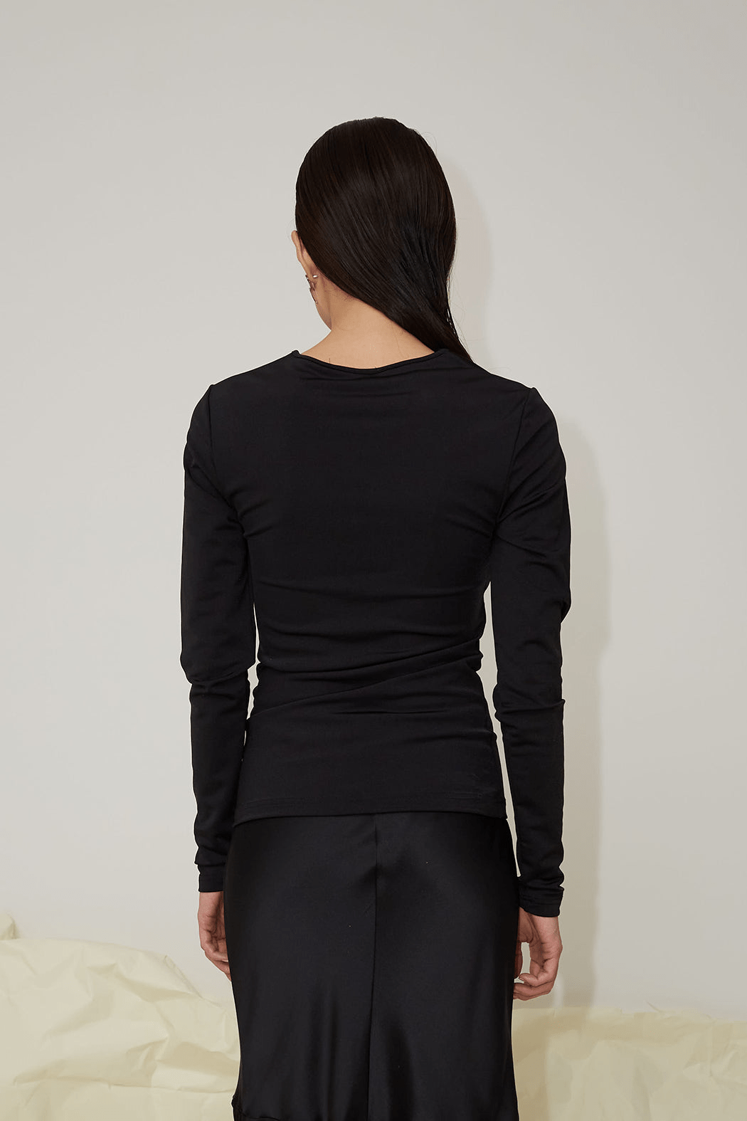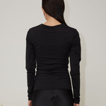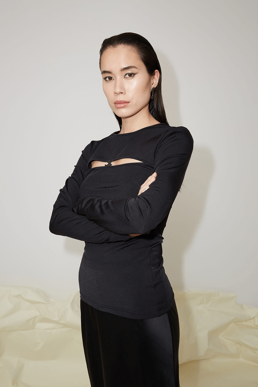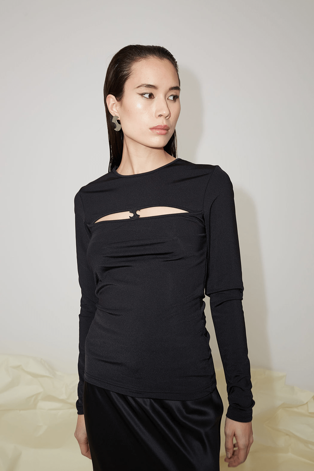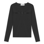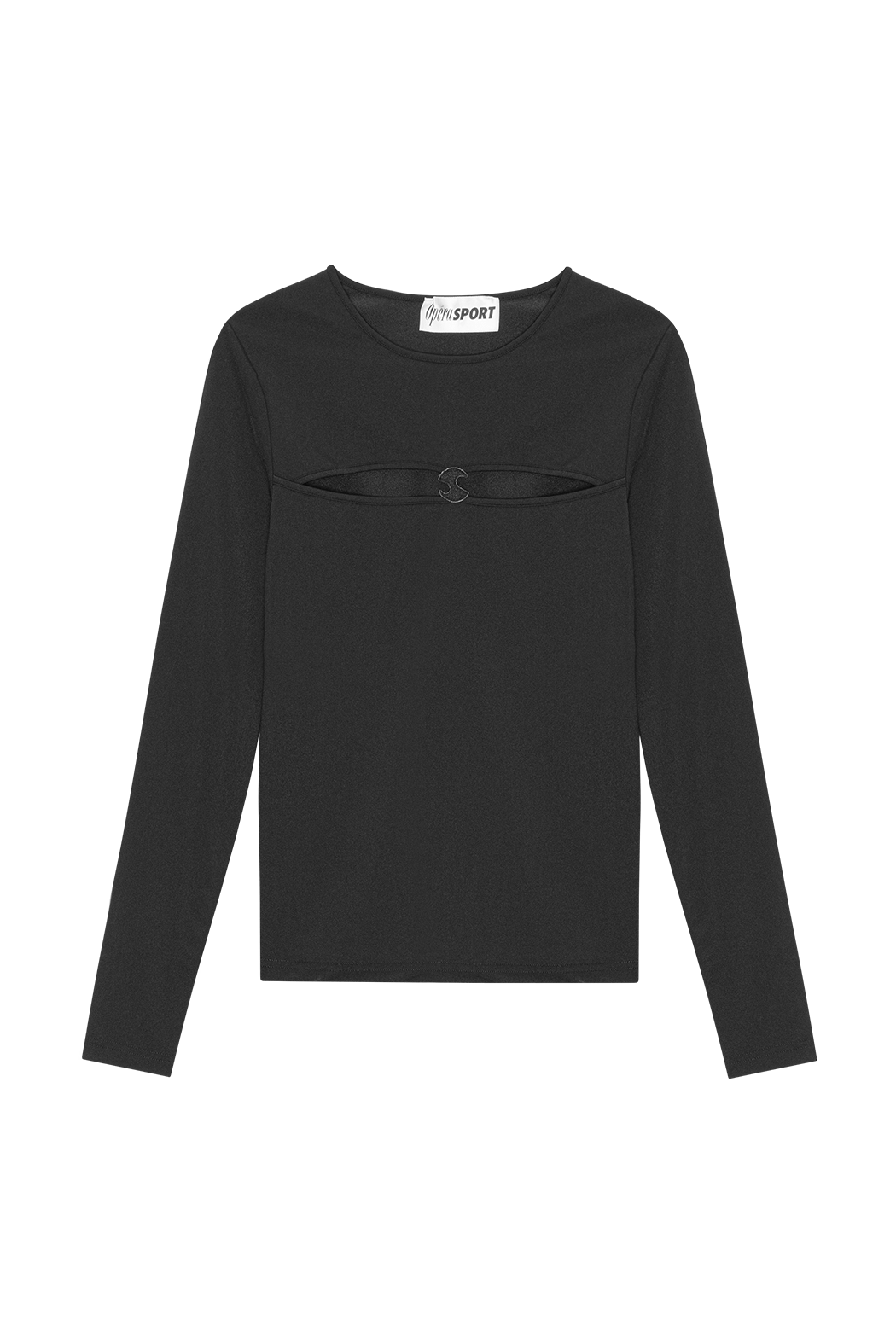 The cutaway accent at the chest of the Delilah top is expressive of OpéraSPORT's contemporary asthetic. Framed by fluted sleeves and with a round neckline, it capture's the brand's sculptural sensibility. Crafted from fluid jersey made from recycled polyamide and spandex, it features a slim silhouette and an OpéraSPORT's logo in the center of the chest, creating an avant-garde expression.