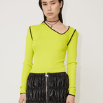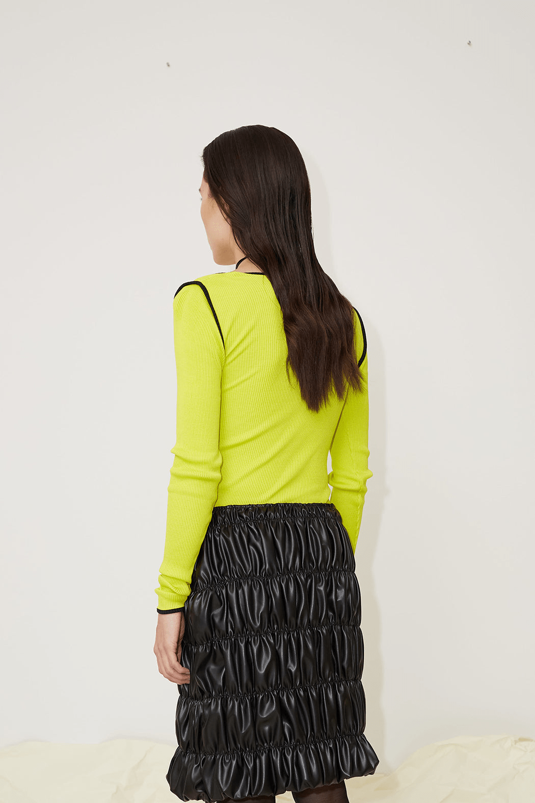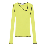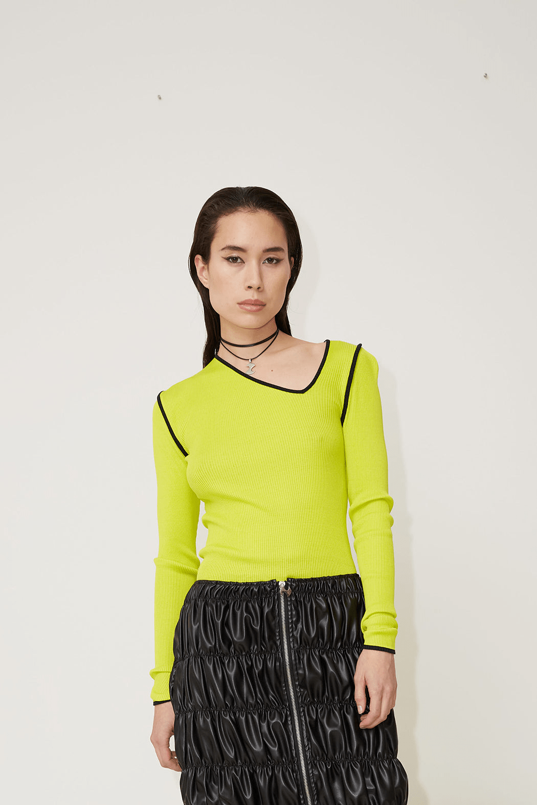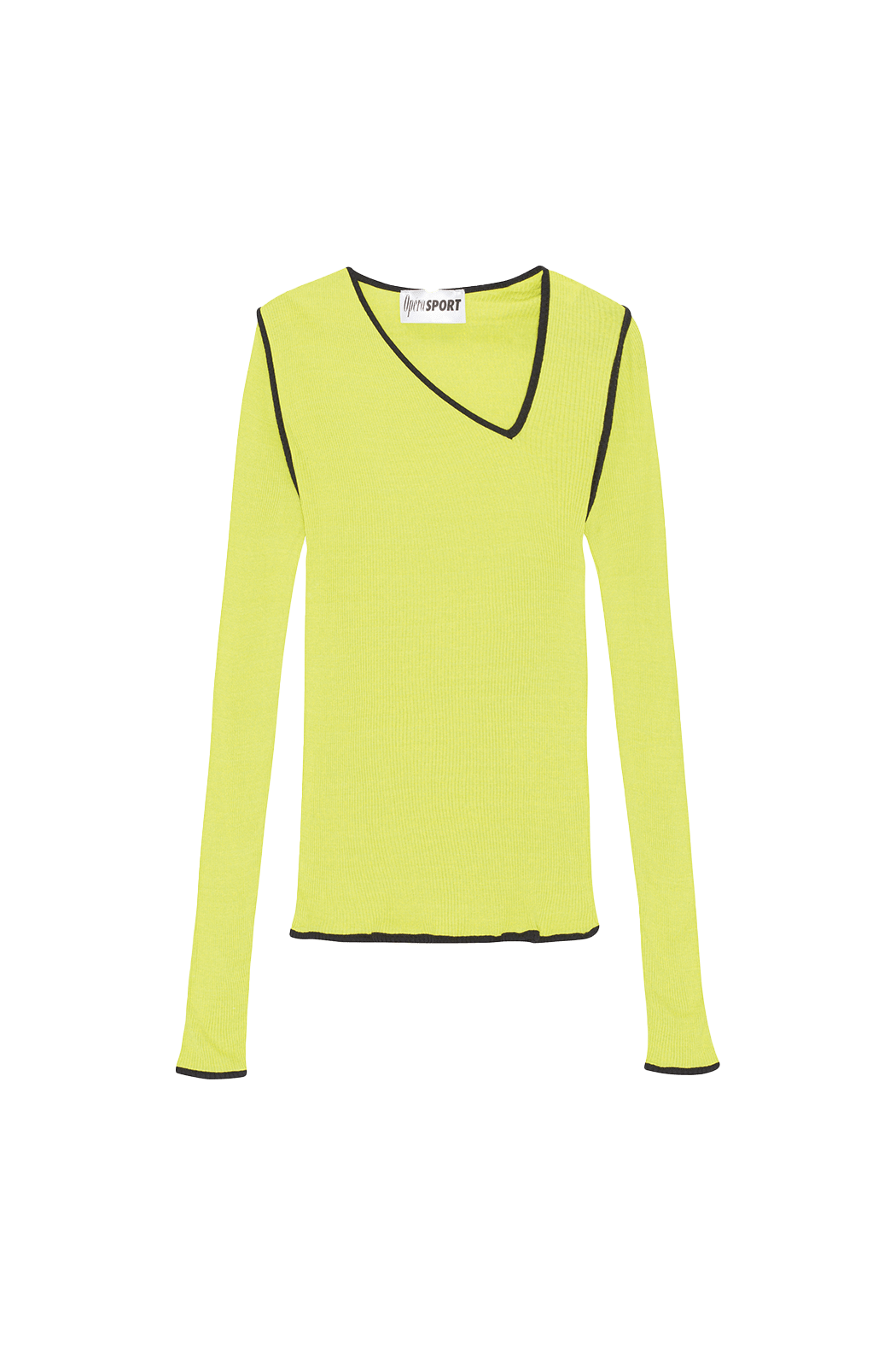 Our signature Eve top with the asymmetrical neckline in 100% recycled silk has been part of OpéraSPORT's editions since the beginning. The seamless silk closely hugs your figure and fits all shapes and sizes. For this edition, it comes in a vibrant evening primrose detailed with black contrasting hemsPlease note that this garment is made from 100% recycled silk, which is why small knots can appear.