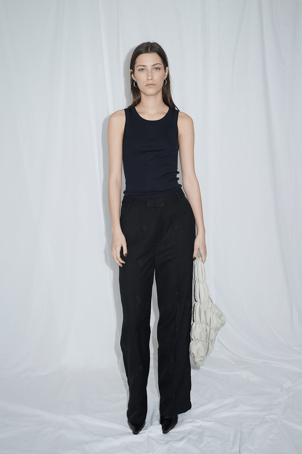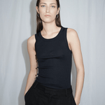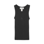The classic Jane Top is made from stretchable seamless fabric in 100% recycled silk. The top has a slightly fitted silhouette with a no-sleeve design, a round neckline, and an embroidered logo on the front. Small knots can appear due to the fabric being made of recycled silk.
