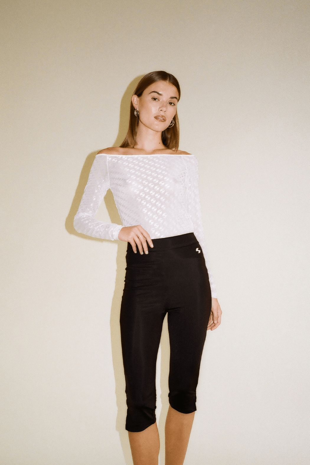 The cool Marilyn top are made from sheer fabric of 100% recycled polyester, and details the signature OpéraSPORT logo. The top has a flattering off the shoulder cut, exposing the collarbones. It features long sleeves and a close fit. Pair with the matching Cristo pants or style on its own.