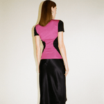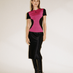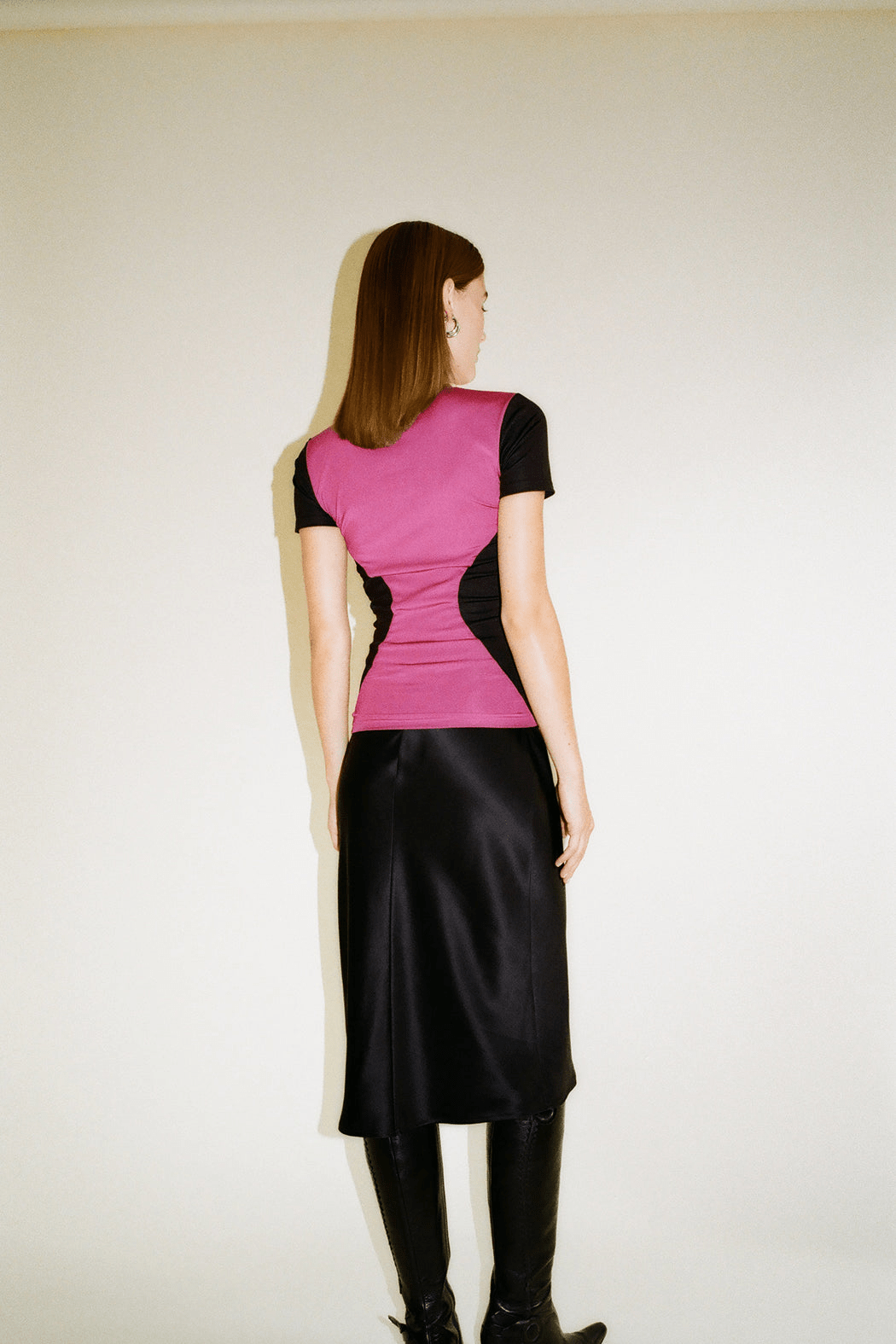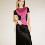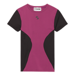 The sporty Soller top is made from black and magenta recycled polyamide and spandex. The short sleeved top features a black OpéraSPORT logo in front, a round neckline and cut-out details and sleeves in black.