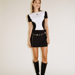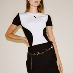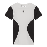 The sporty Soller top is made from black and white recycled polyamide and spandex. The short sleeved top features a black OpéraSPORT logo in front, a round neckline and cut-out details and sleeves in black.