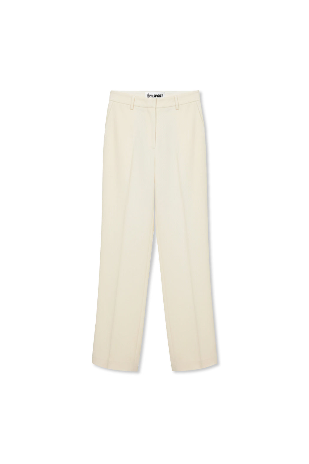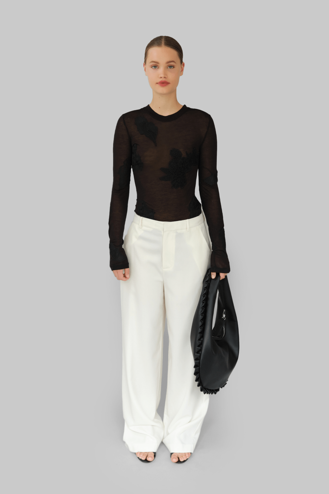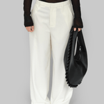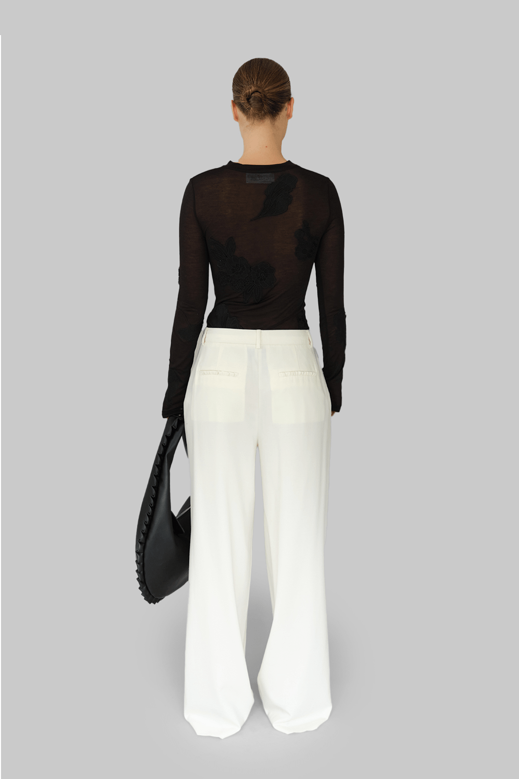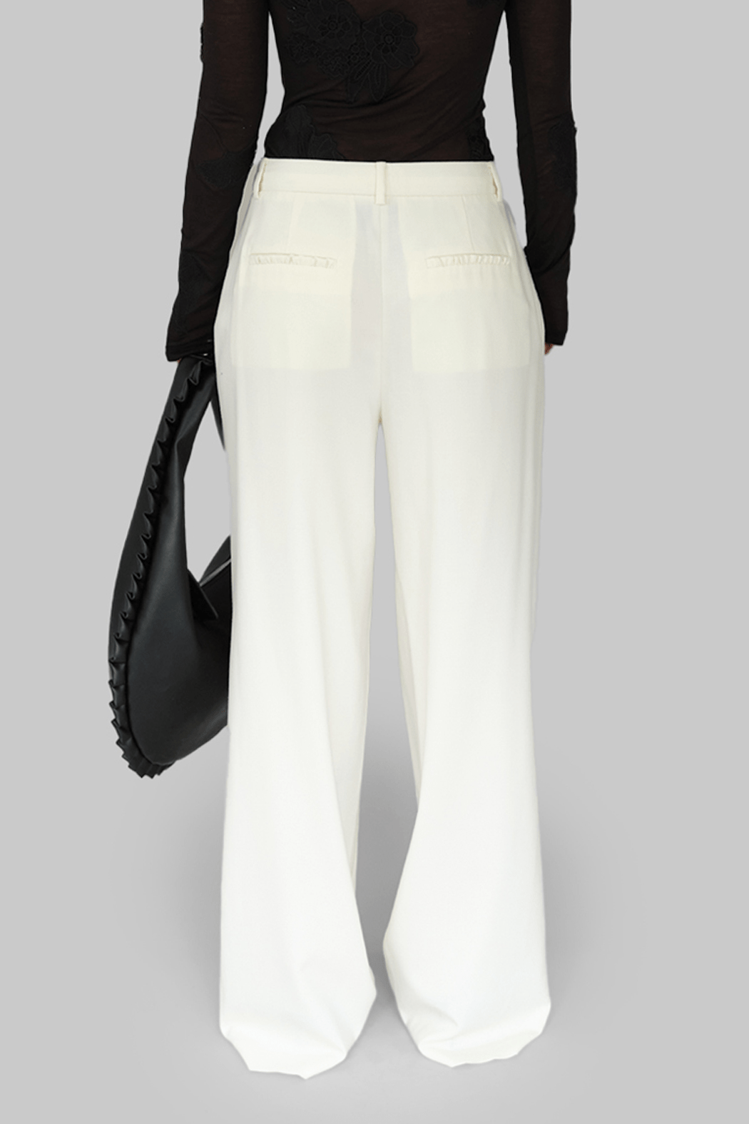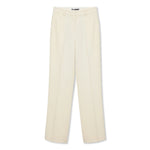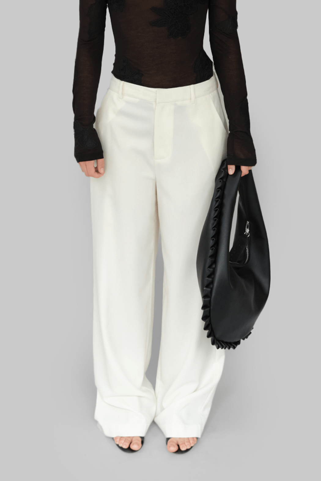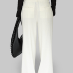 The Helena Trousers are crafted from a blend of organic wool, recycled polyester, eco viscose, and Lycra in ivory. Cut with a wide-leg silhouette, they feature a mid-rise waist, subtle pleats at the front, and side pockets for practicality. The trousers are finished with back pockets detailed with ruffles, adding a feminine touch to the tailored design. The tailored design makes them a versatile piece that can be styled for both formal and relaxed occasions.