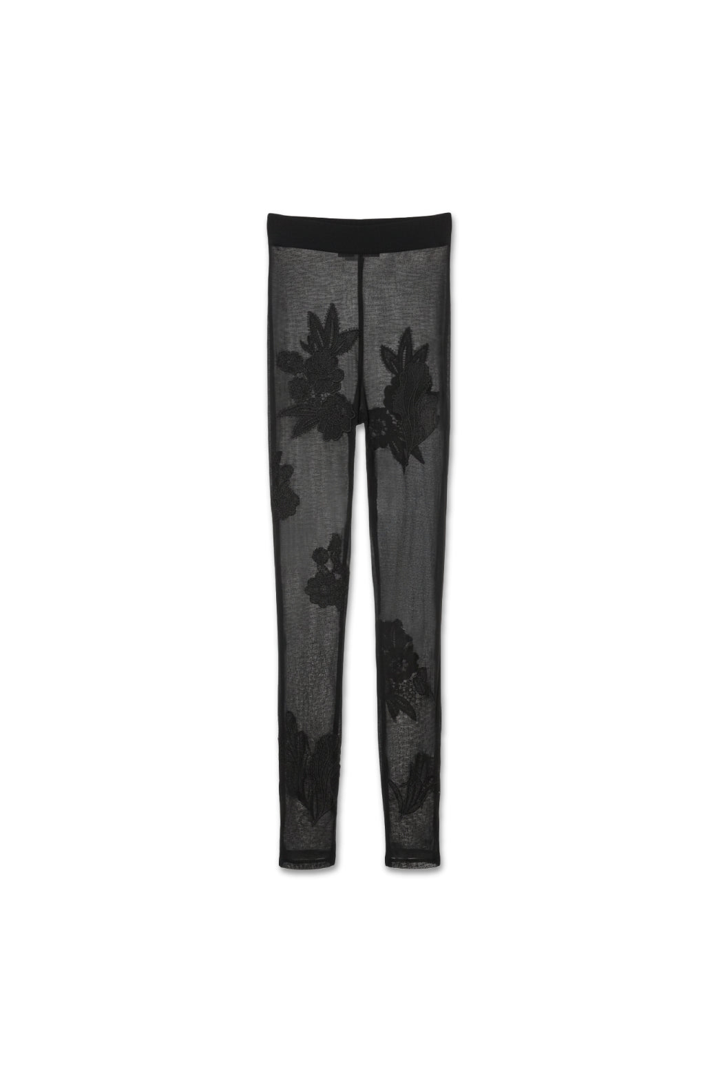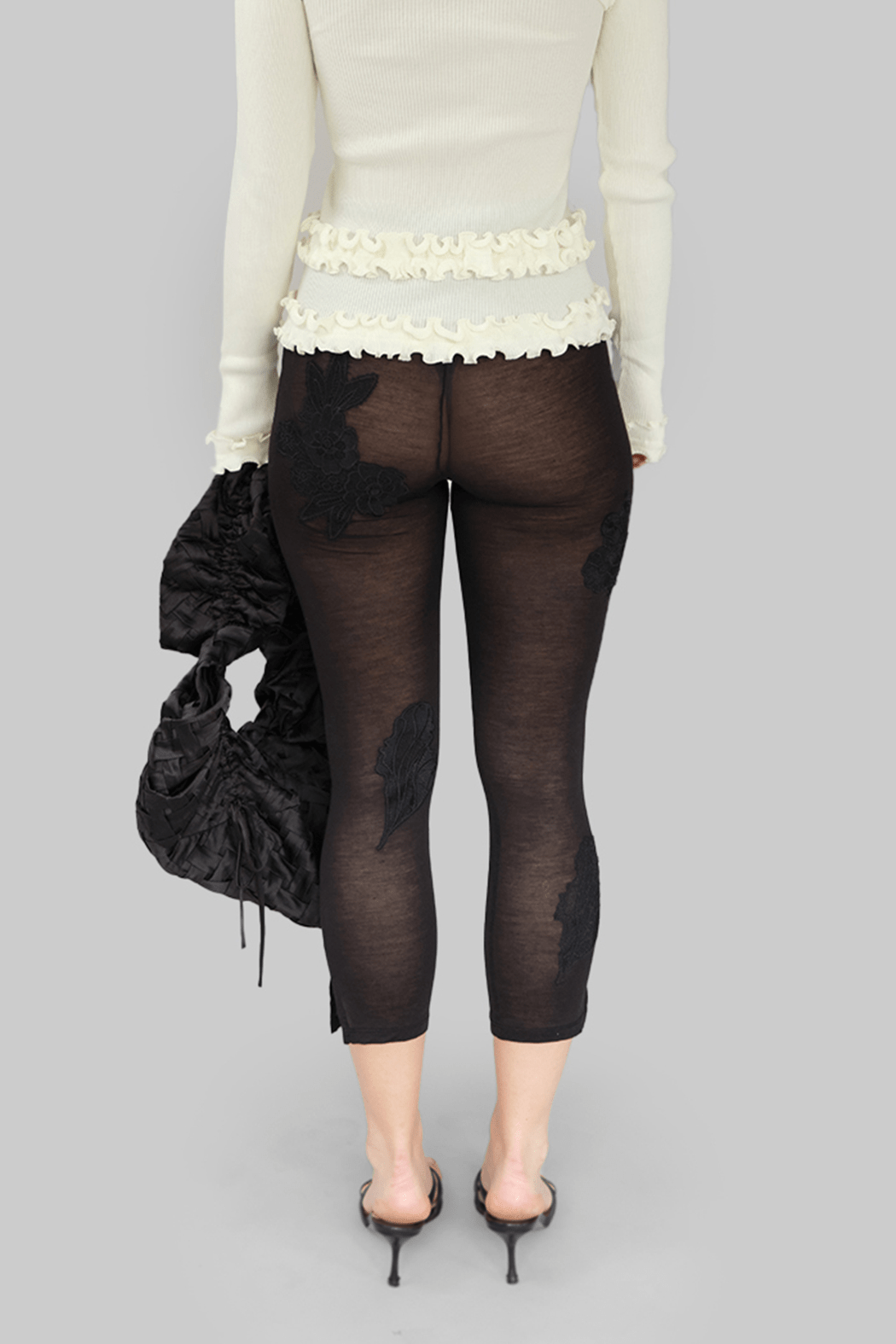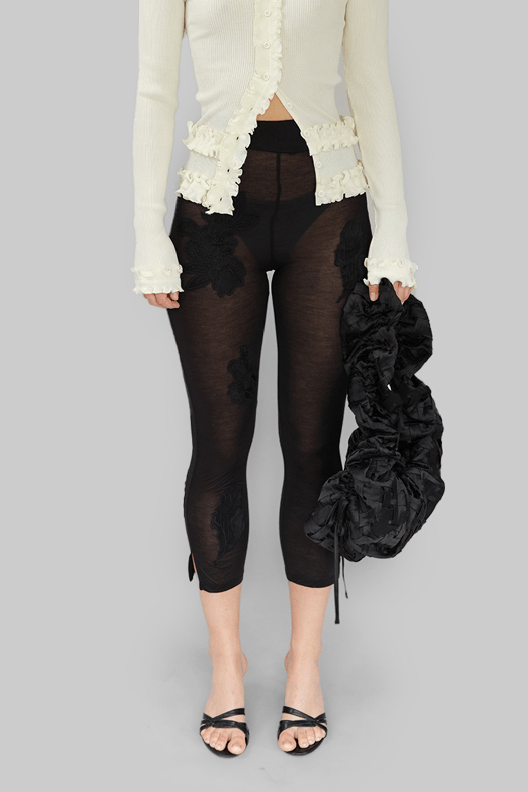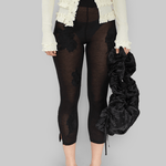 The Ziva Pants are crafted from 100% modal in black. Designed with a fitted, cropped silhouette, they feature delicate floral lace appliqué placed throughout for an elevated sheer effect. The lightweight fabric and second-skin feel make them a versatile layering piece. Style them with the matching Ziva Top for a coordinated set or contrast with oversized knits and blazers.