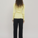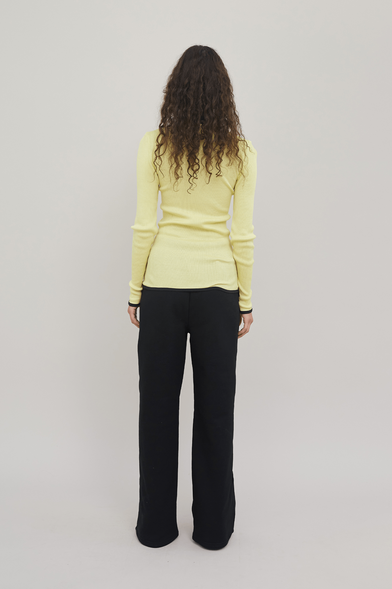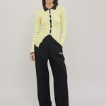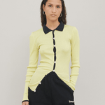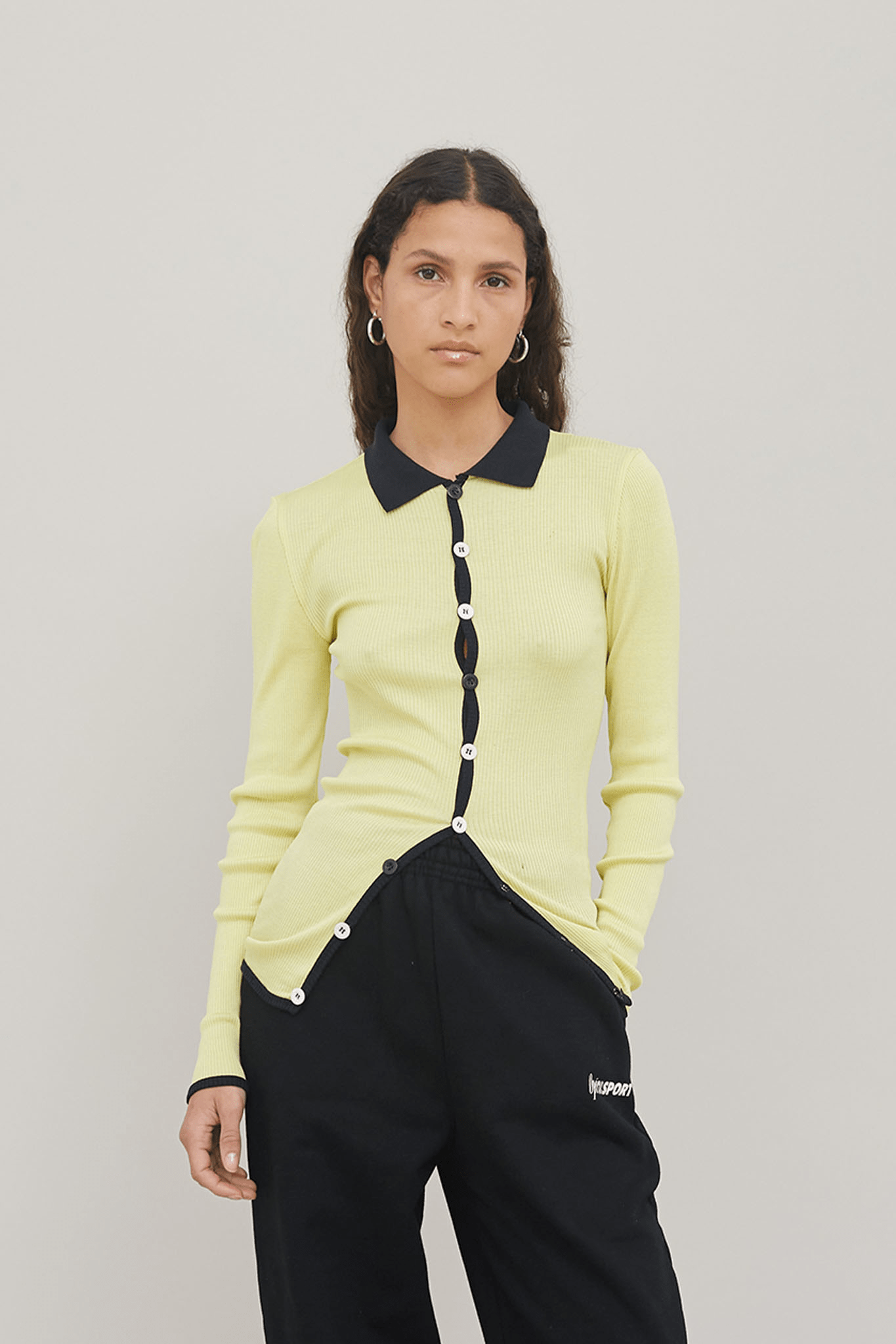 The Laura shirt is the newest addition to our seamless silk program. It has a close-fitted silhouette with long sleeves, a pointy collar, and a button-fastening down the front giving it endless styling options. Laura is crafted from yellow recycled silk with black contrast detailing.