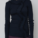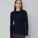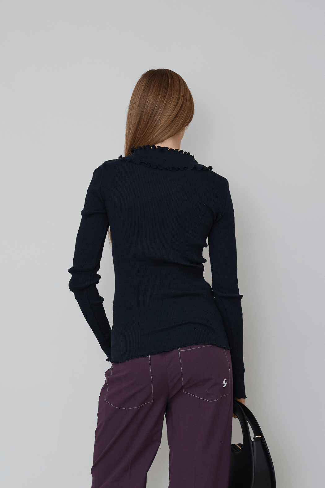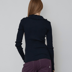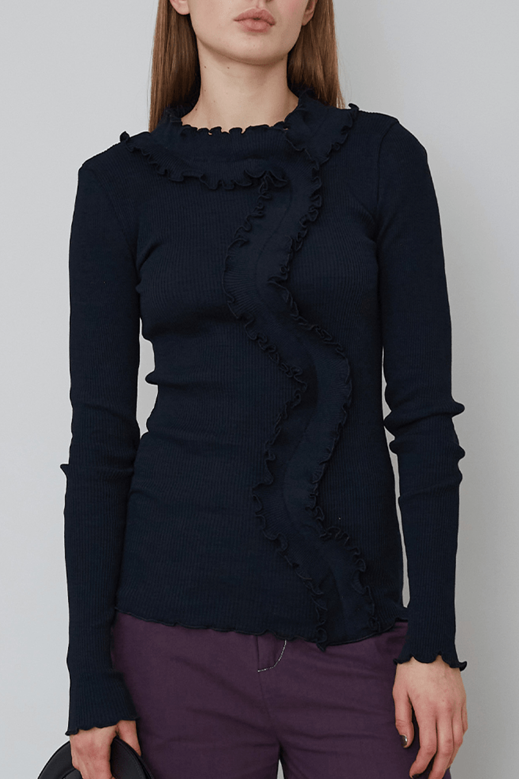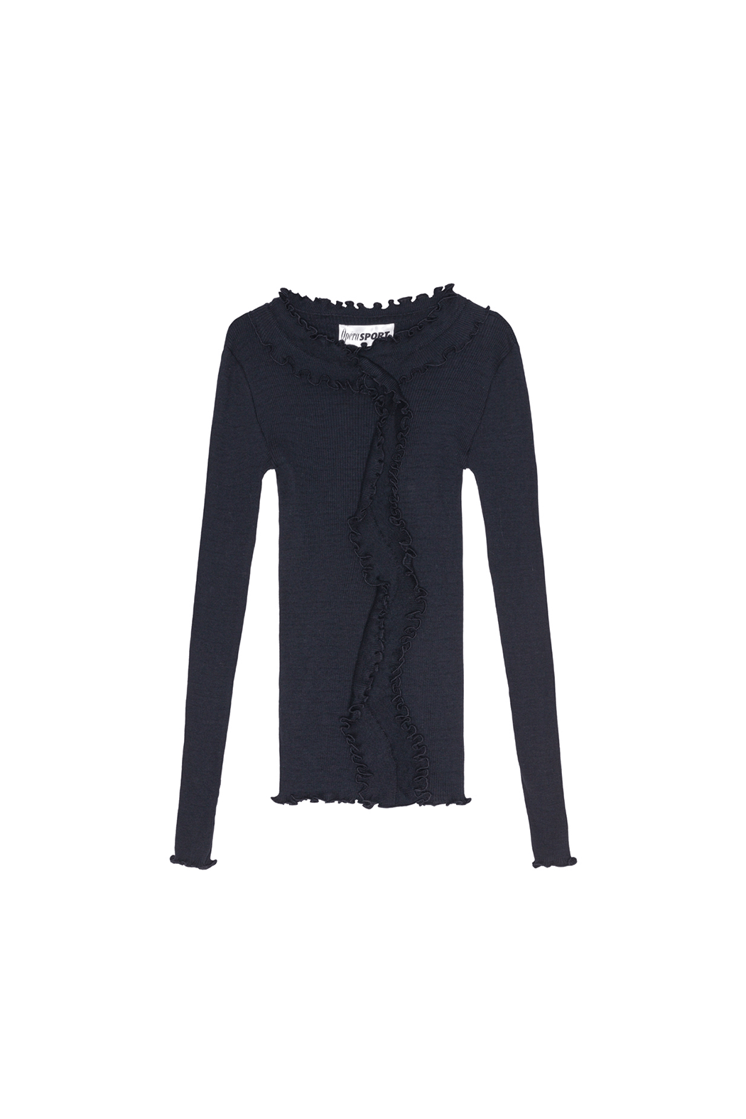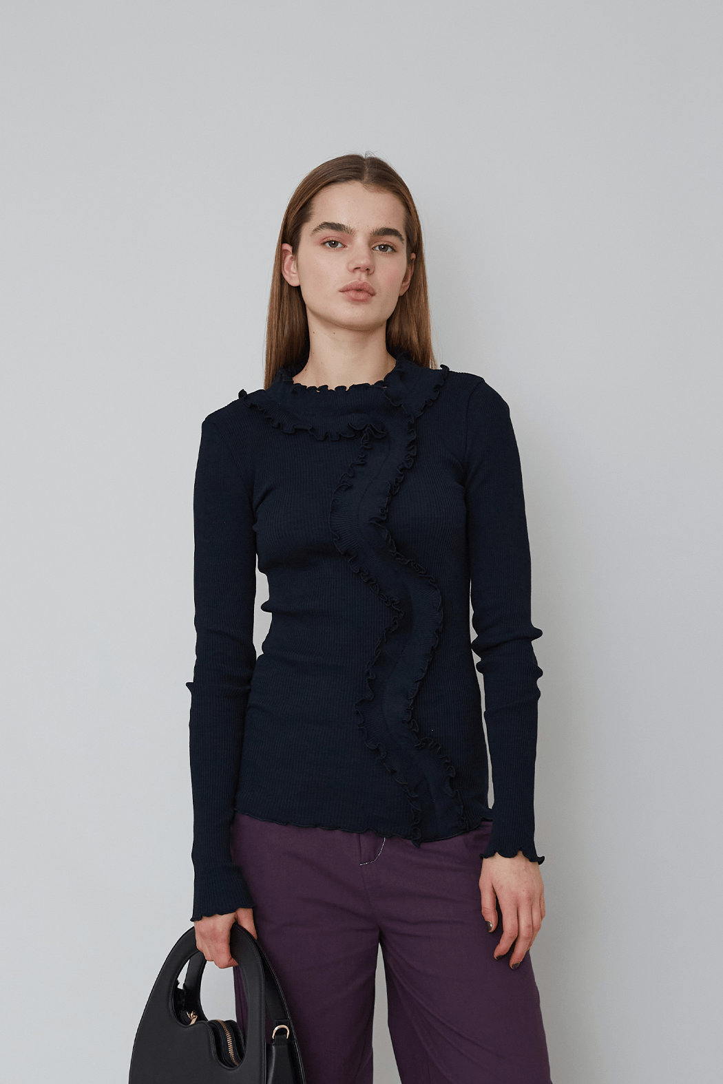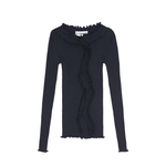 Simone is crafted from seamless 100% organic cotton. The top has a fitted silhouette with long sleeves and a round neckline. Simone has ruffeling stitching details throughout the body and neckline.