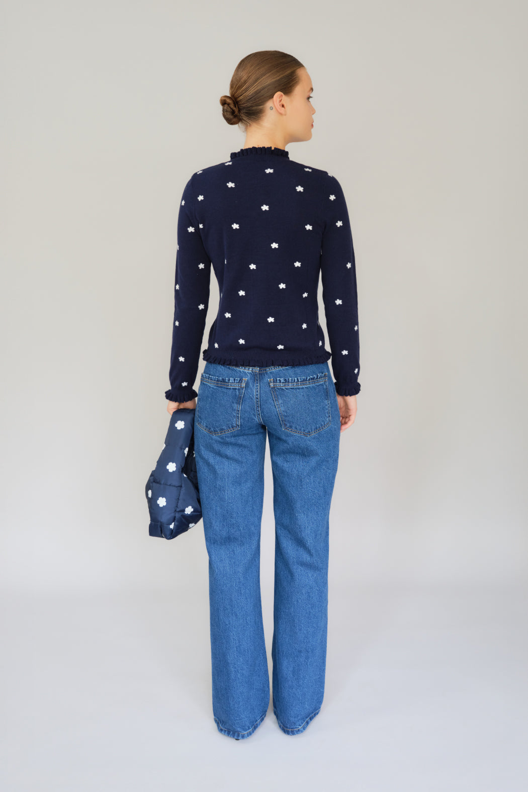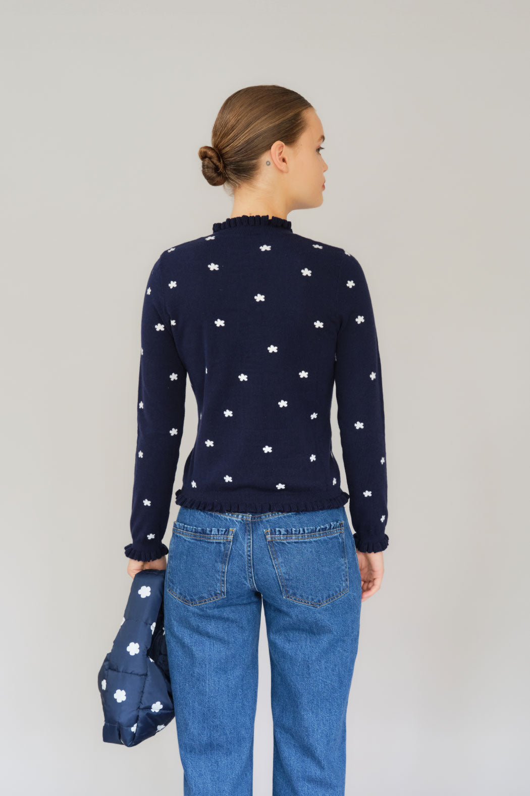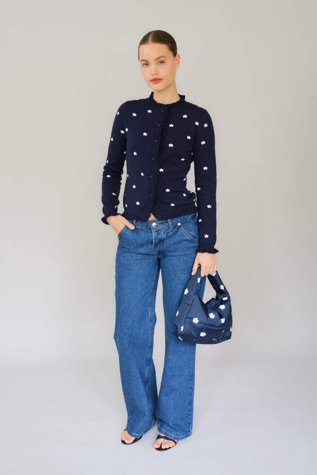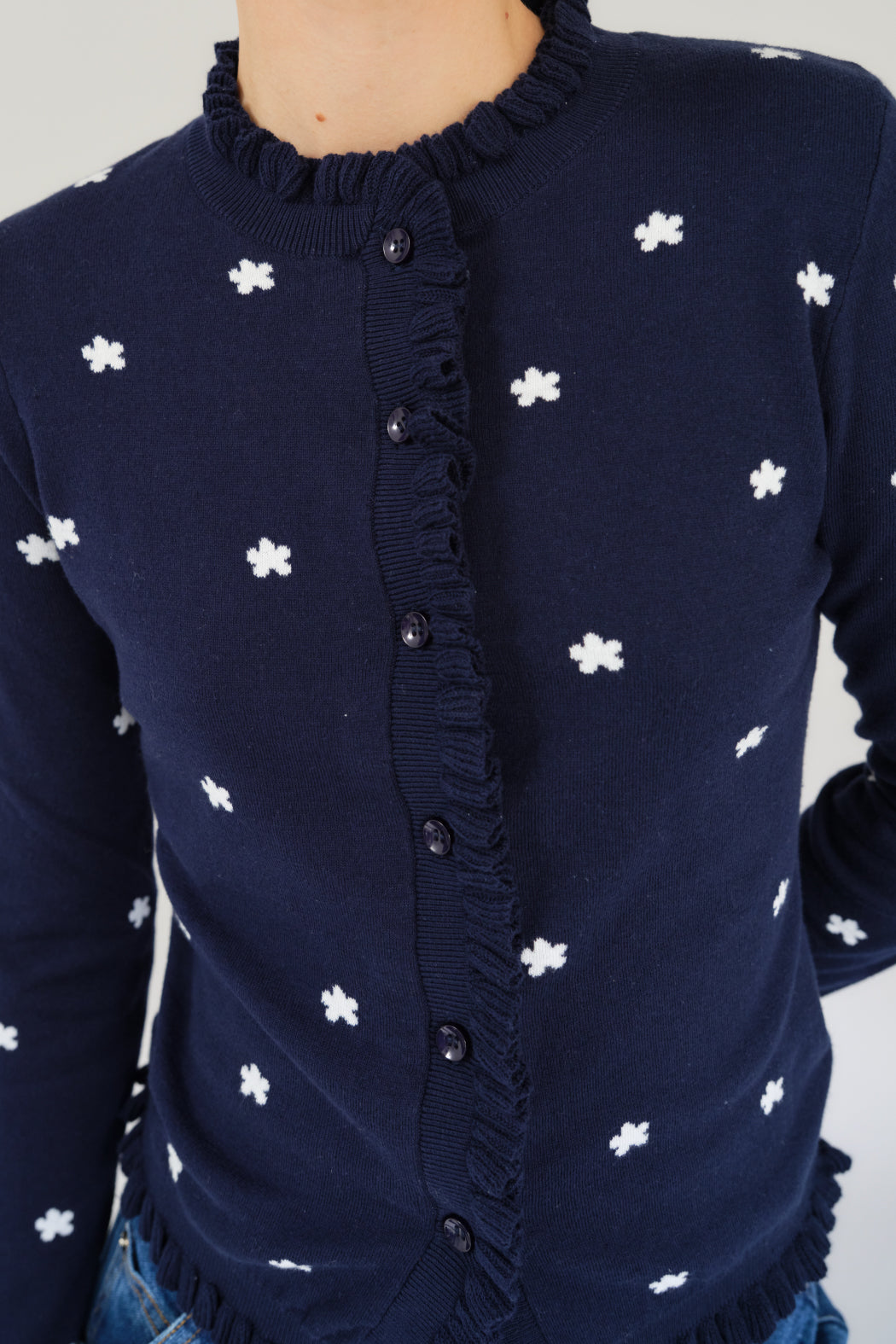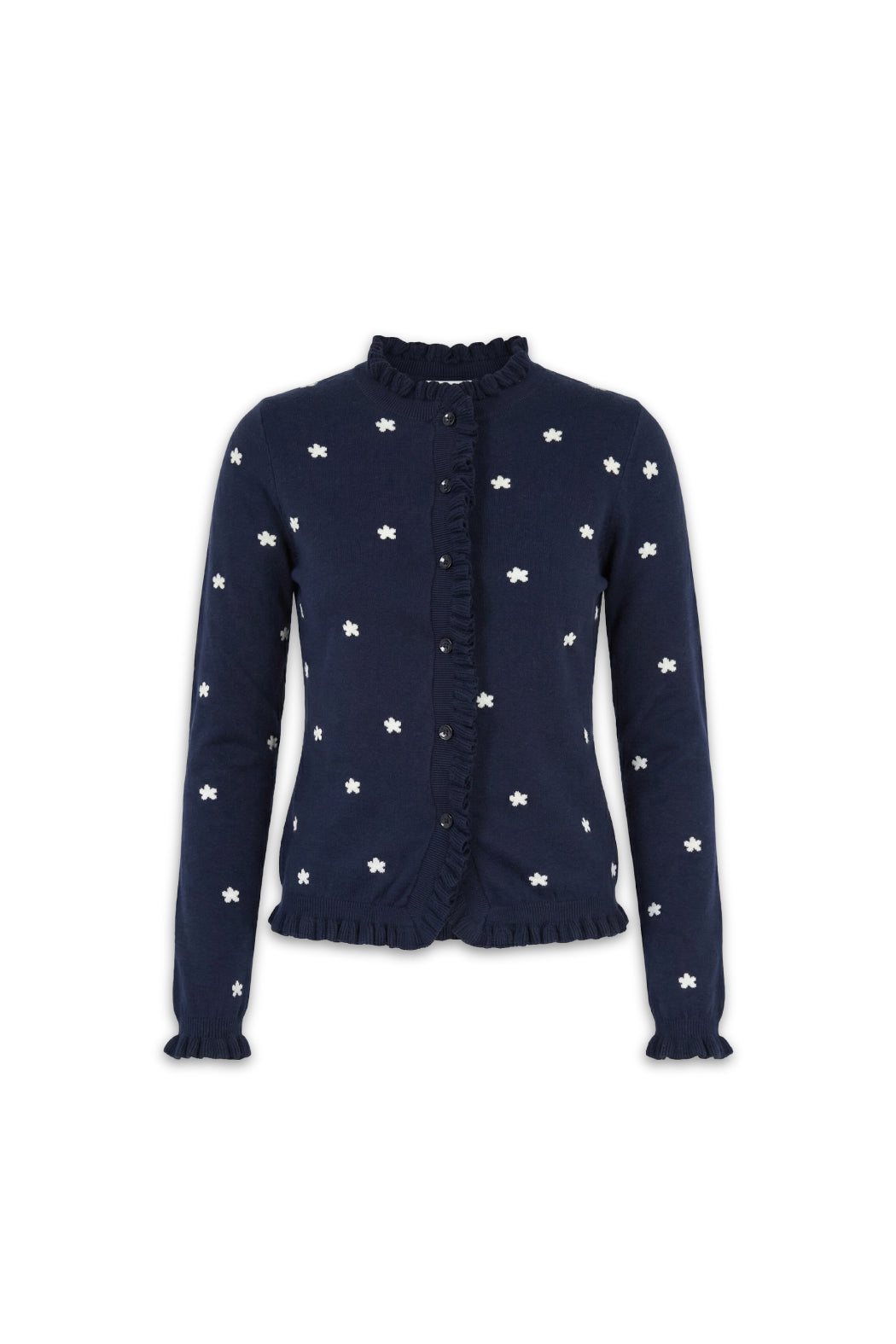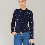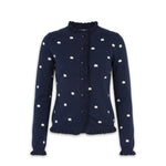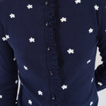 The Malia cardigan is crafted from an organic cotton and cashmere blend. It features a navy color with a white flower pint and a subtle ribbed texture. It has a round neckline and a full front button closure, with delicate ruffle trim accenting the placket and hemline. Perfect for both casual and polished looks, it's a timeless wardrobe staple.