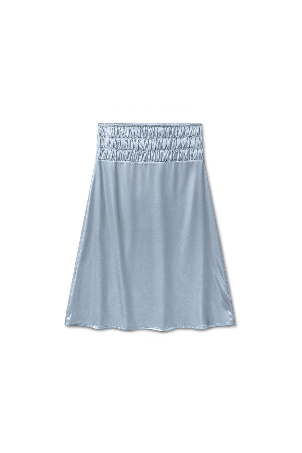 The June Skirt is crafted from 100% recycled polyester in a soft ice water shade. This midi-length skirt is designed with a smocked waistband for a comfortable fit and flows into a straight silhouette, creating an elegant and effortless look. Style it on its own or pair it with the matching June Shirt for a coordinated outfit.